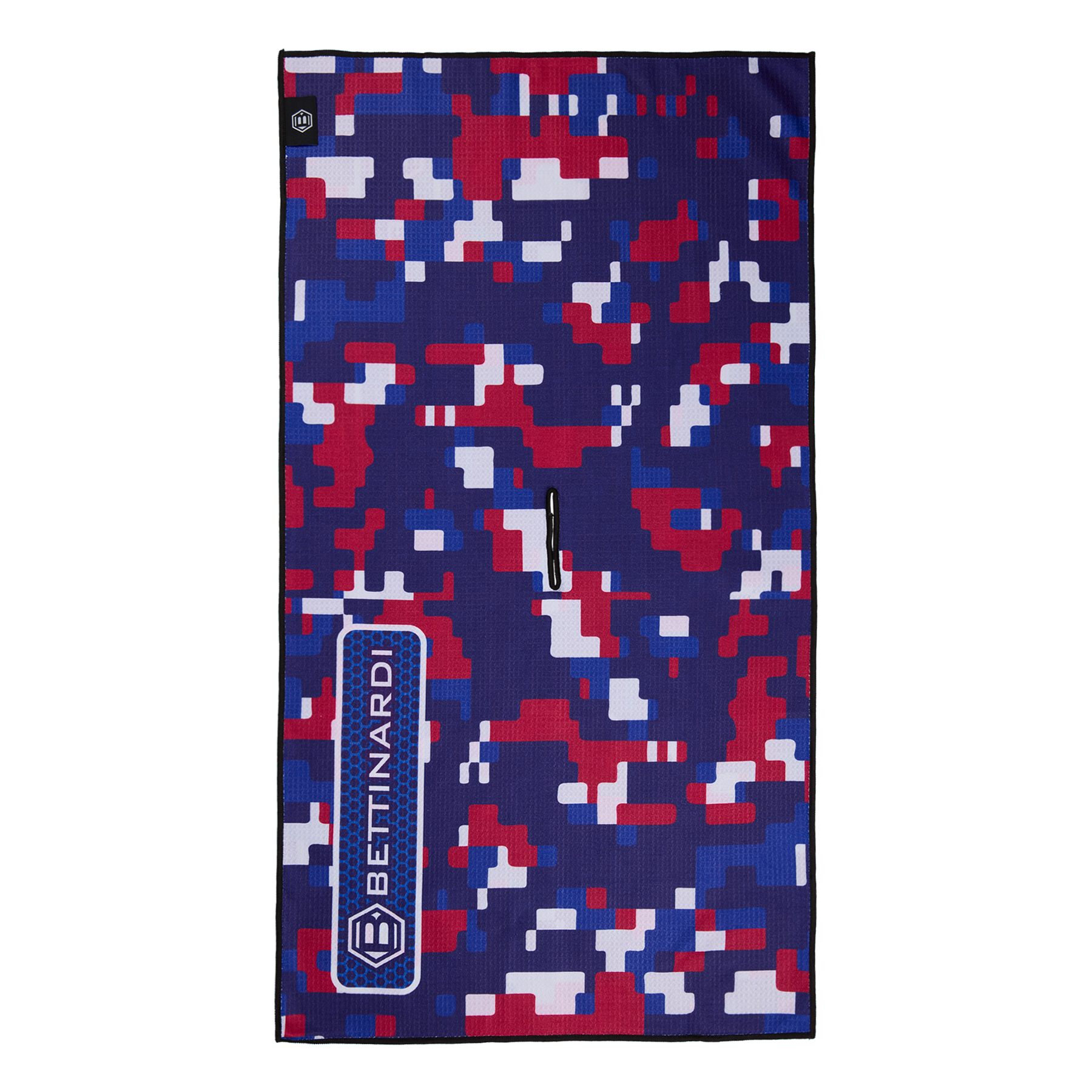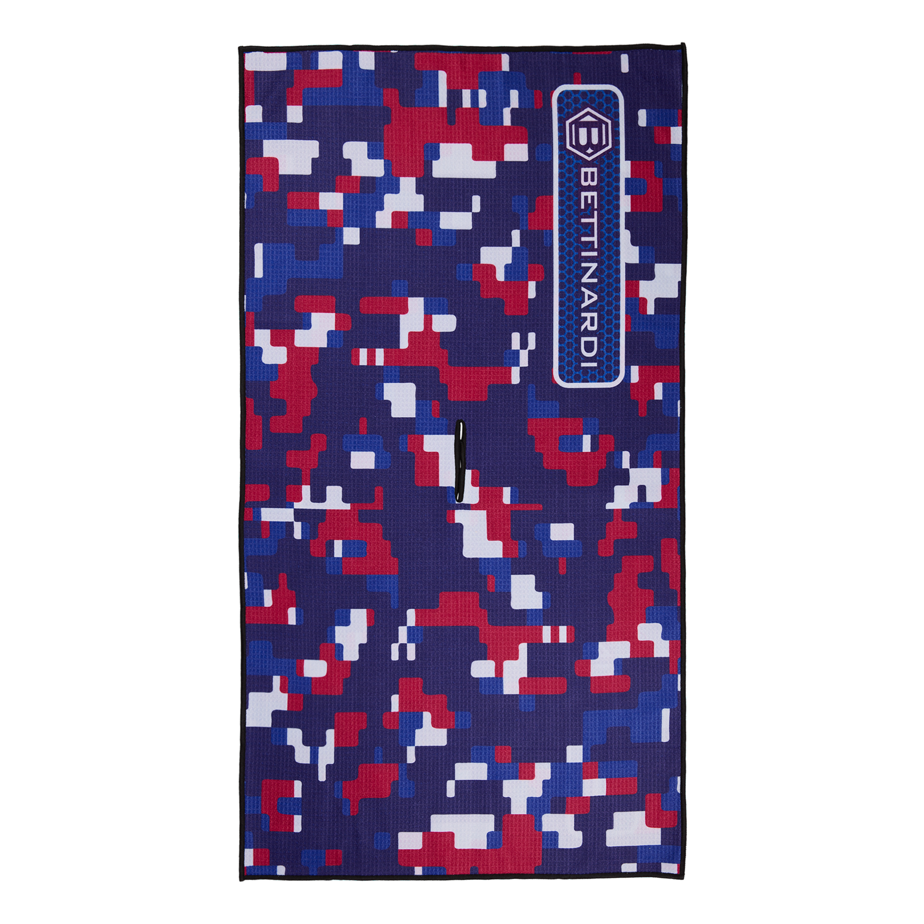 This navy and red digital camo towel is designed for golfers who want both function and style. The soft, durable microfiber material absorbs moisture quickly and helps clean clubs and balls without scratching. This towel is finished with Bettinardi branding on both sides for a clean look on the bag and is a dependable on-course essential. Limited quantities available.