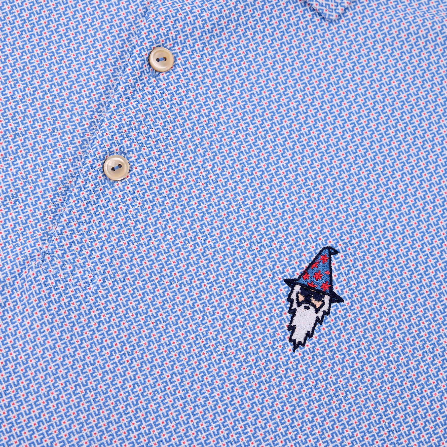 This shirt features a custom-designed geometric print for added style, along with an embroidered Sunglasses Wizard on the left chest and Bettinardi script wordmark on the left sleeve. Made by our friends at Peter Millar, the Summer Comfort mesh polo offers classic looks and texture alongside modern versatility, with enhanced breathability, four-way stretch and wicking properties. Finished with a spread collar and a three-button placket. (92% polyester, 8% spandex)