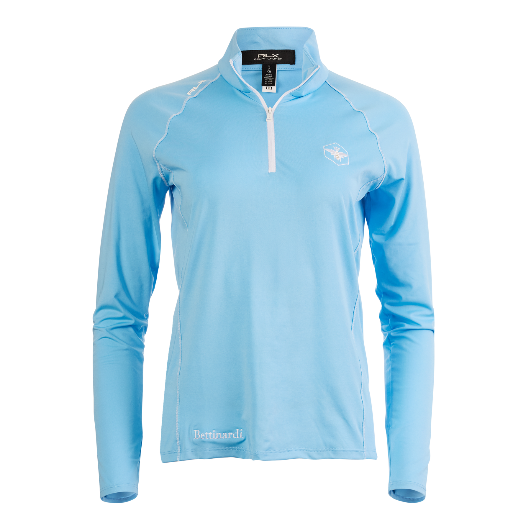 Engineered for performance and clean, modern style, this Slim Fit Blue Mockneck Quarter-Zip is designed to hit at the hip for a streamlined silhouette. Featuring our Queen B logo on the left chest, long raglan sleeves with sewn cuffs and thumbholes provide unrestricted movement. The side panels and a back yoke enhance comfort and mobility. A discreet right side-seam zip pocket offers secure storage, and the mockneck quarter-zip design delivers versatile coverage. Finished with excellent sun protection, this piece offers UPF 50+ for confident wear on and off the course. (88% polyester, 12% elastane)