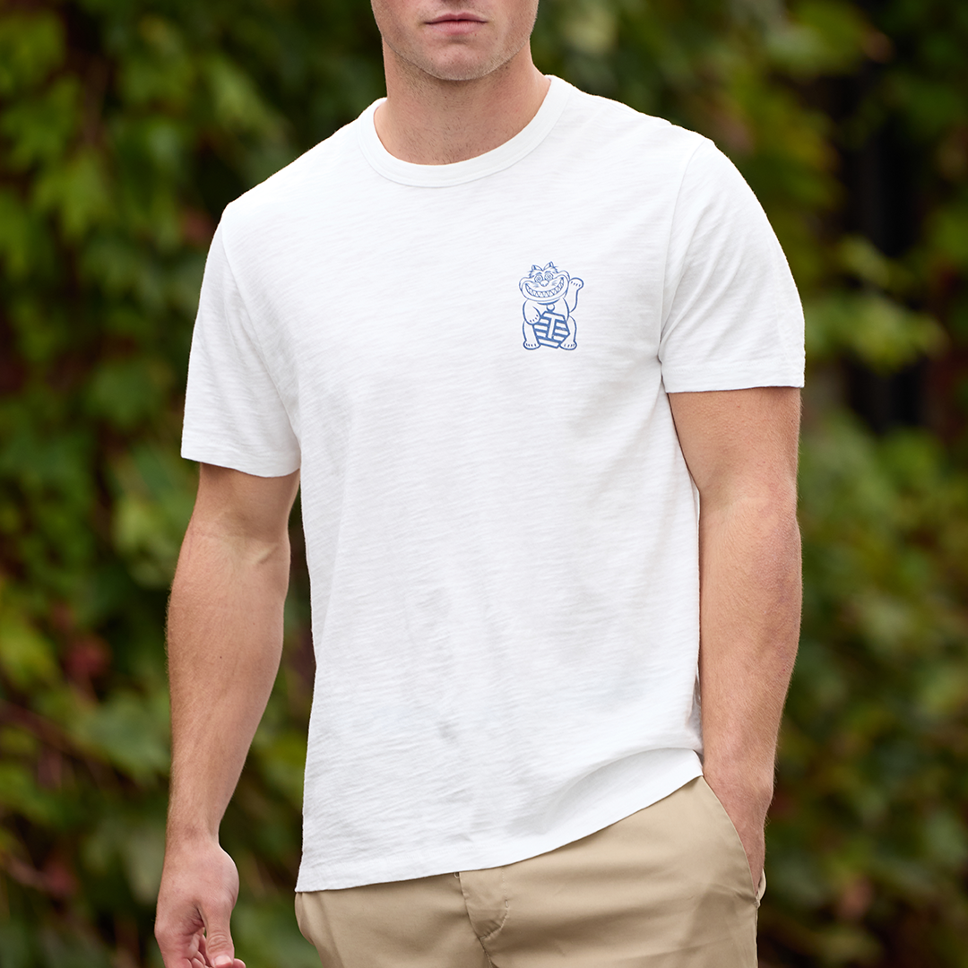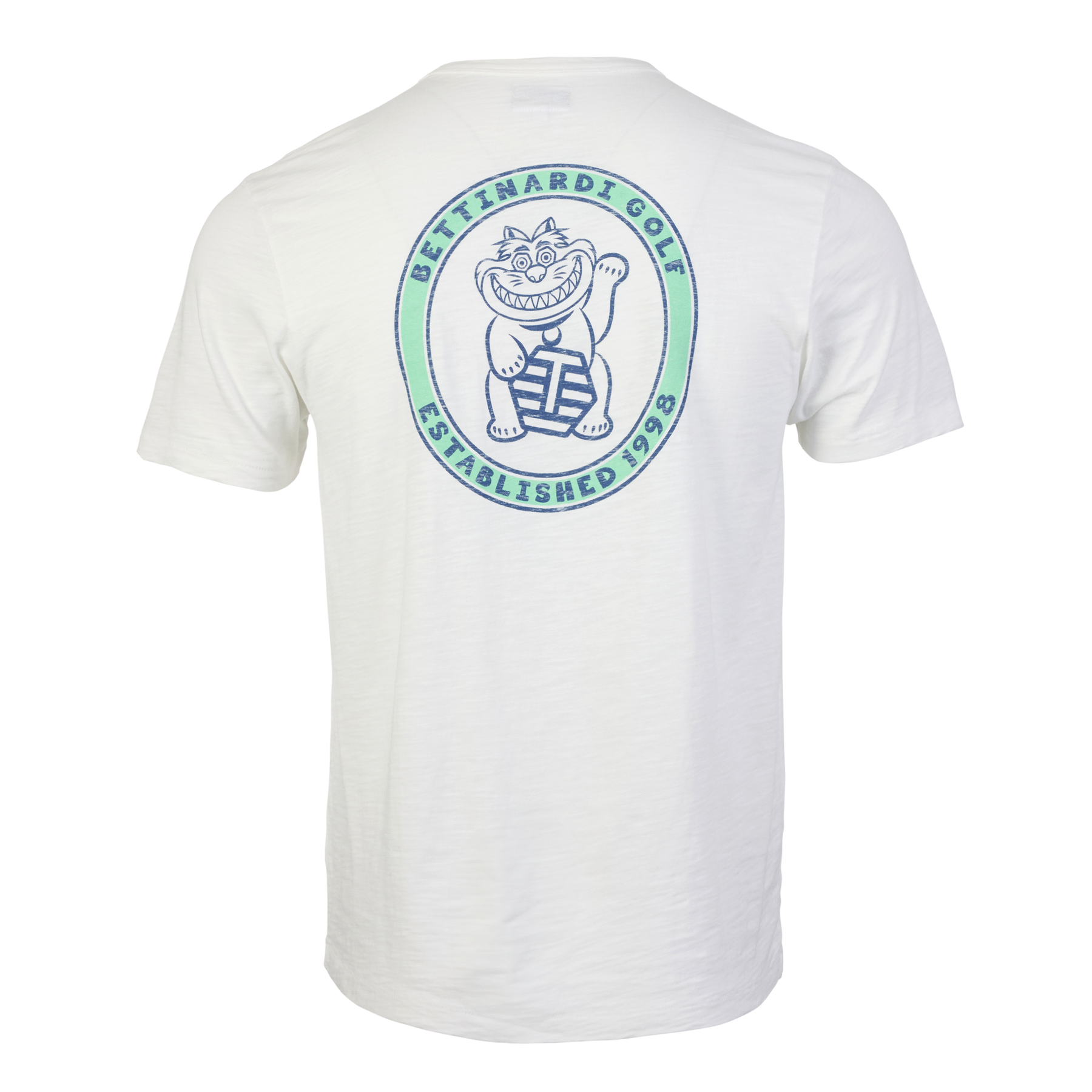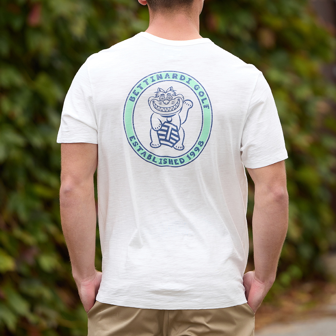 This Artic White Lucky Cat Rec. Tee is crafted from 100% pre-shrunk cotton, this medium-weight slub jersey shirt offers the perfect balance of comfort and durability. Its ribbed collar adds a touch of structure, while the classic fit ensures a timeless silhouette that suits any occasion. Designed for everyday wear, this versatile piece is a wardrobe essential. Finished with our Lucky Cat on the front and Bettinardi Golf text on the back. (100% Cotton)