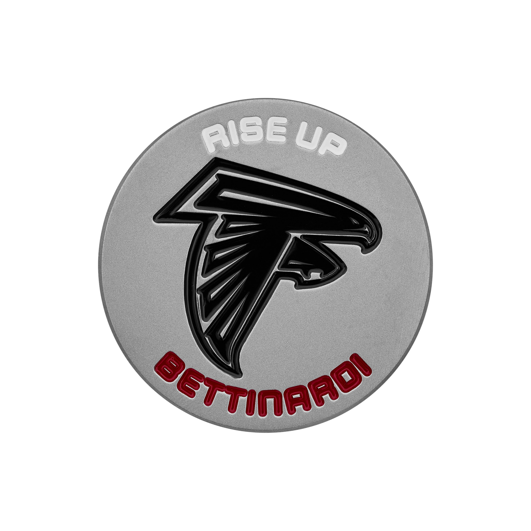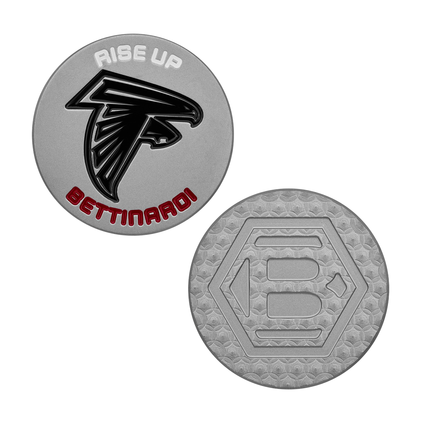 Rise Up! This Diamond Blast ball marker features the Atlanta Falcons logo milled on the front in black paint fills, with a Hex B milled on the backside over Micro Honeycomb™. Limited quantities are available.