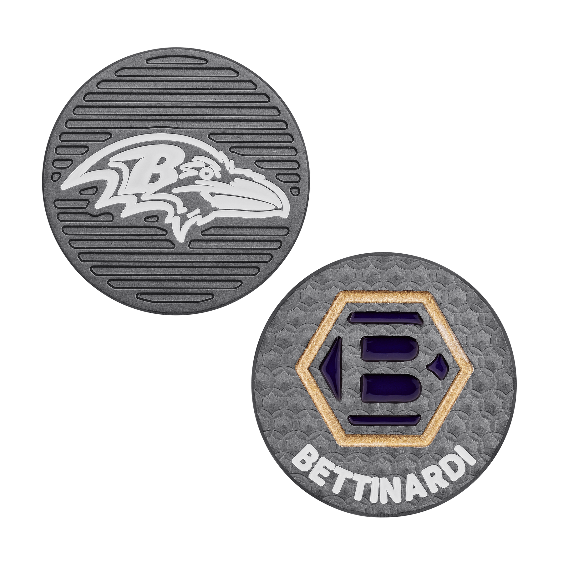 Go Ravens! This Black Ox ball marker features the Baltimore Ravens logo on the front, with Hex B milled into the backside with metallic gold and translucent purple paint fills over a Micro Honeycomb™ base. Limited quantities are available. Please allow 5 days for this item to ship.