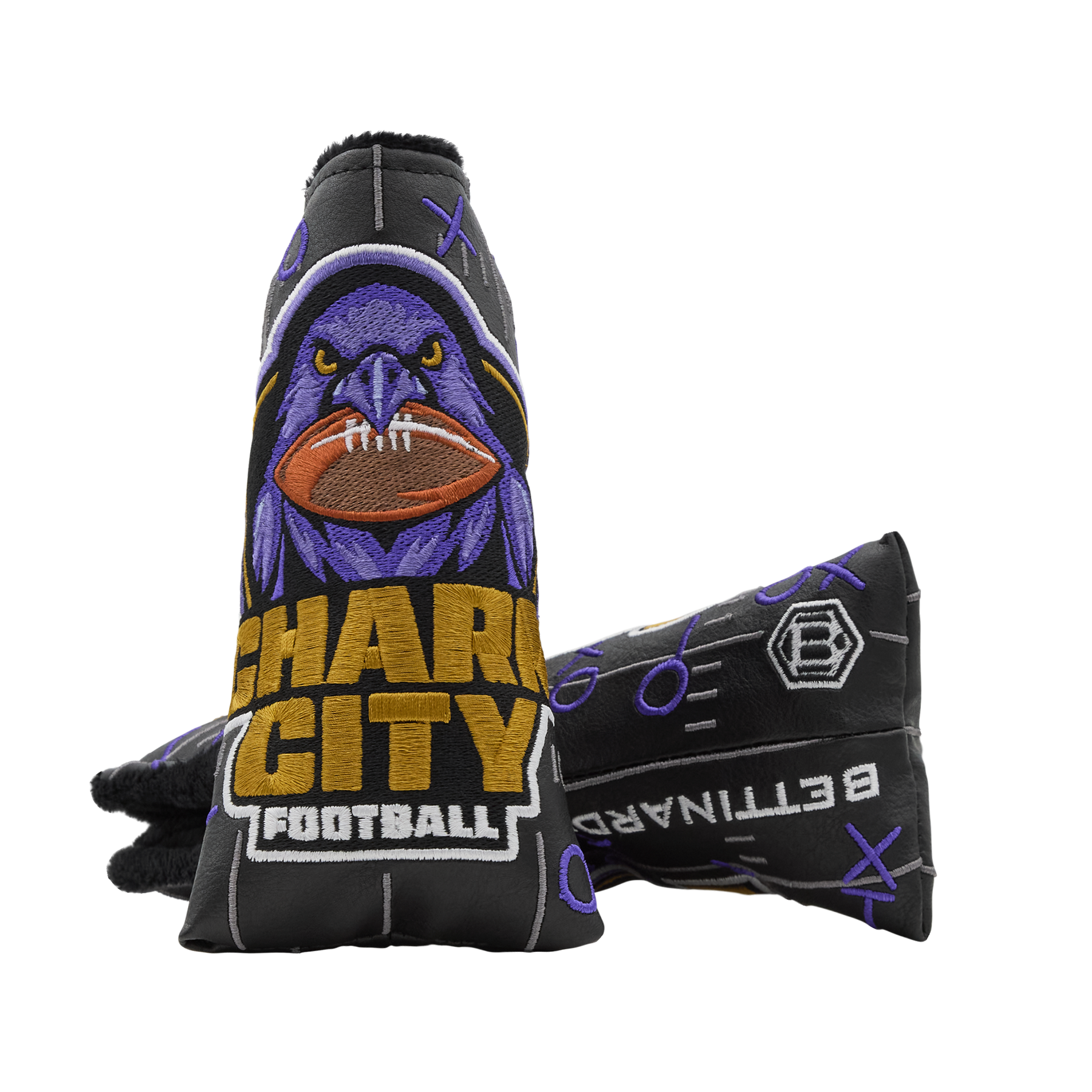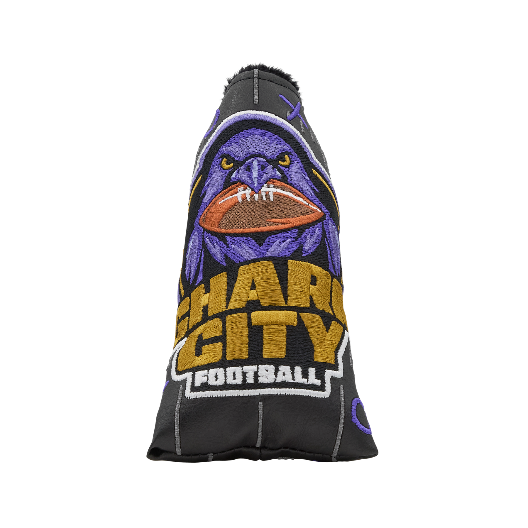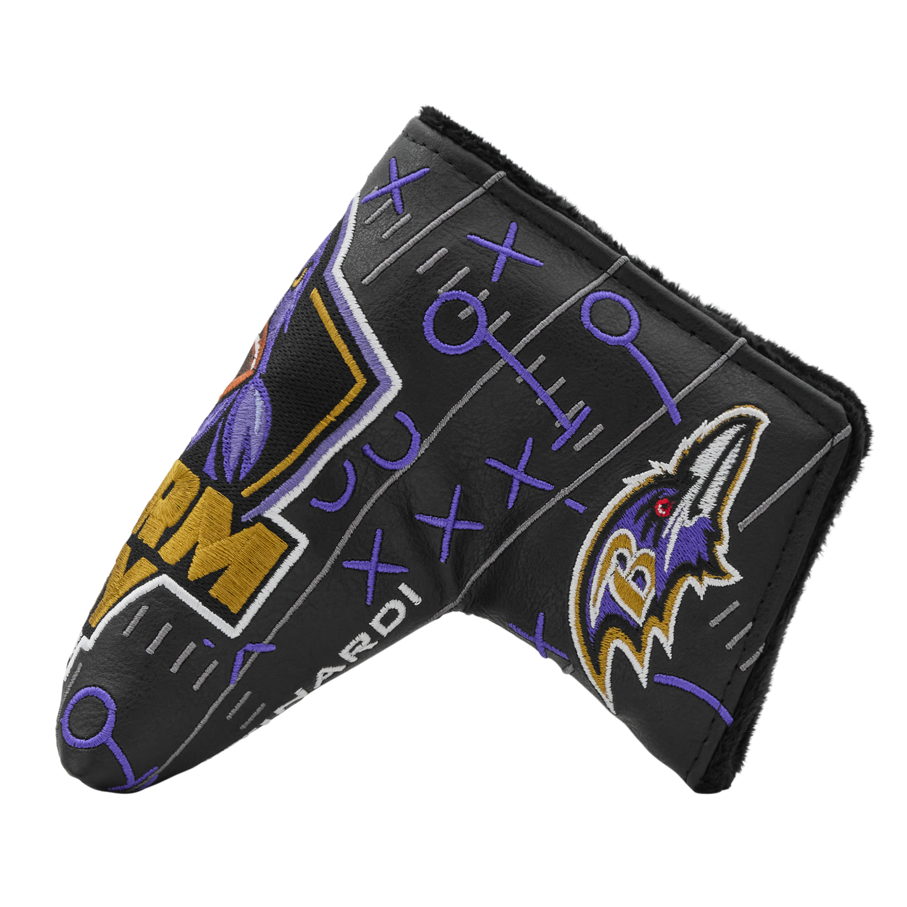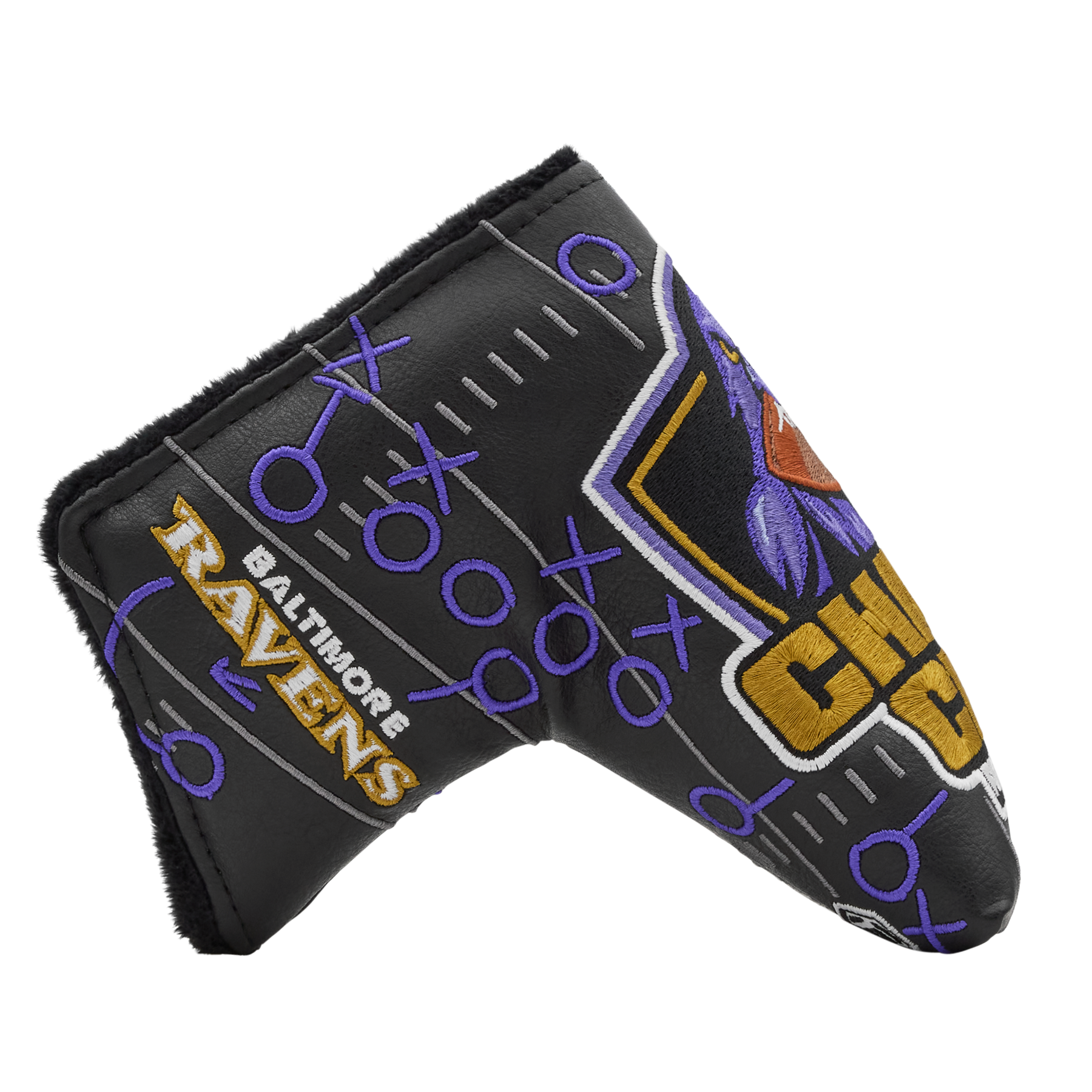 Our X's and O's Baltimore Ravens Charm City Blade Putter Headcover showcases a raven on the front with a Baltimore Ravens wordmark and a Hex B on one side, a Ravens classic mark on the opposite side with white wordmarks and showcasing the teams diagram plays throughout. Finished with a black plush interior and a magnetic closure, this black blade putter headcover protects your putter while showcasing your Baltimore Ravens pride on every green. Limited quantities available.
