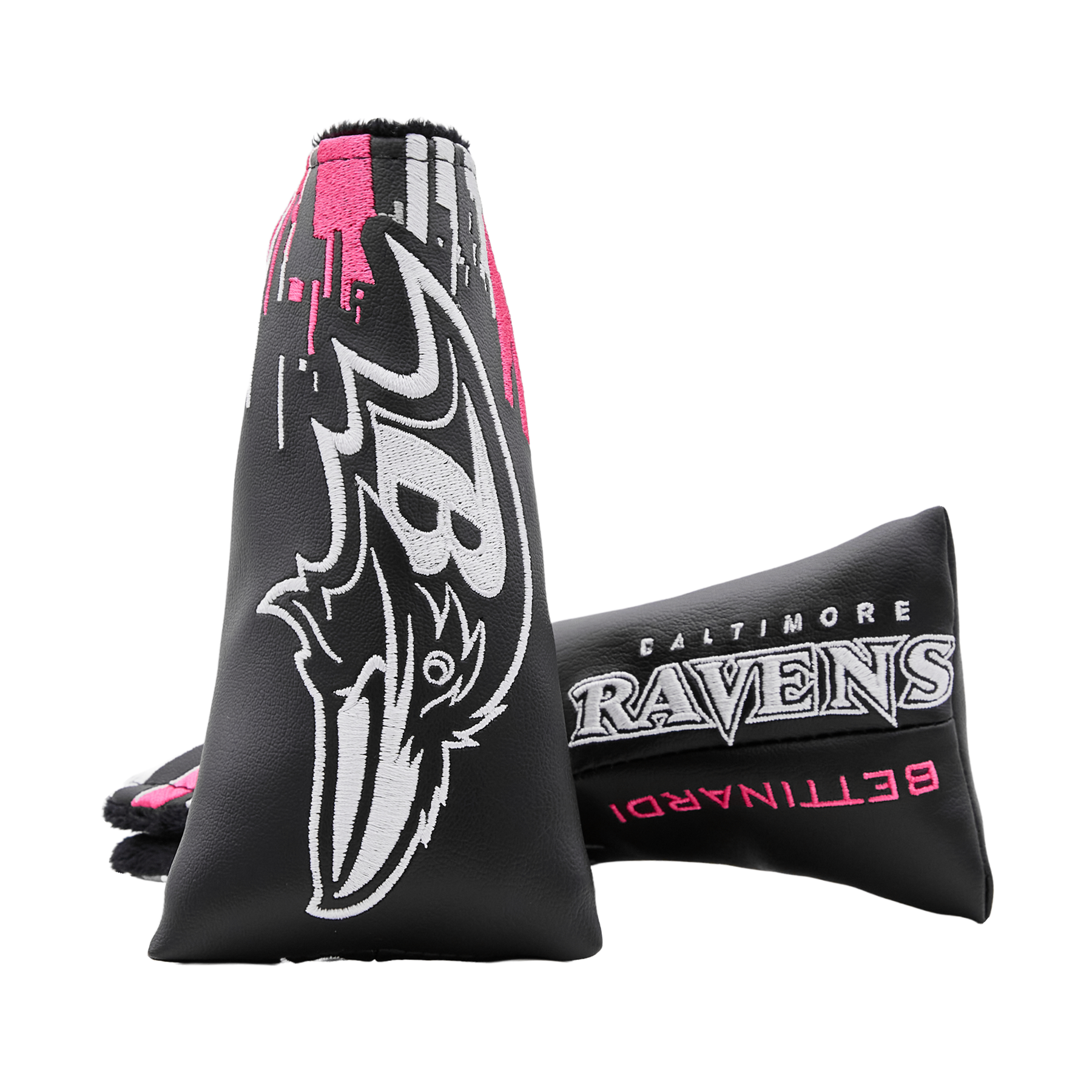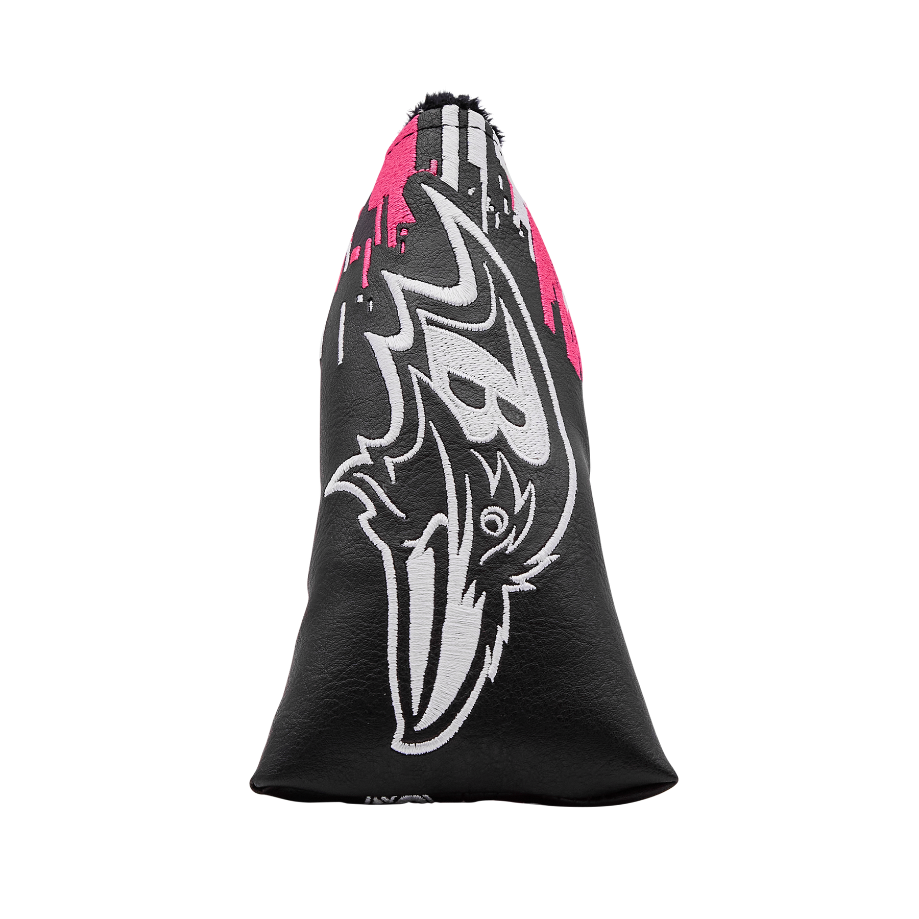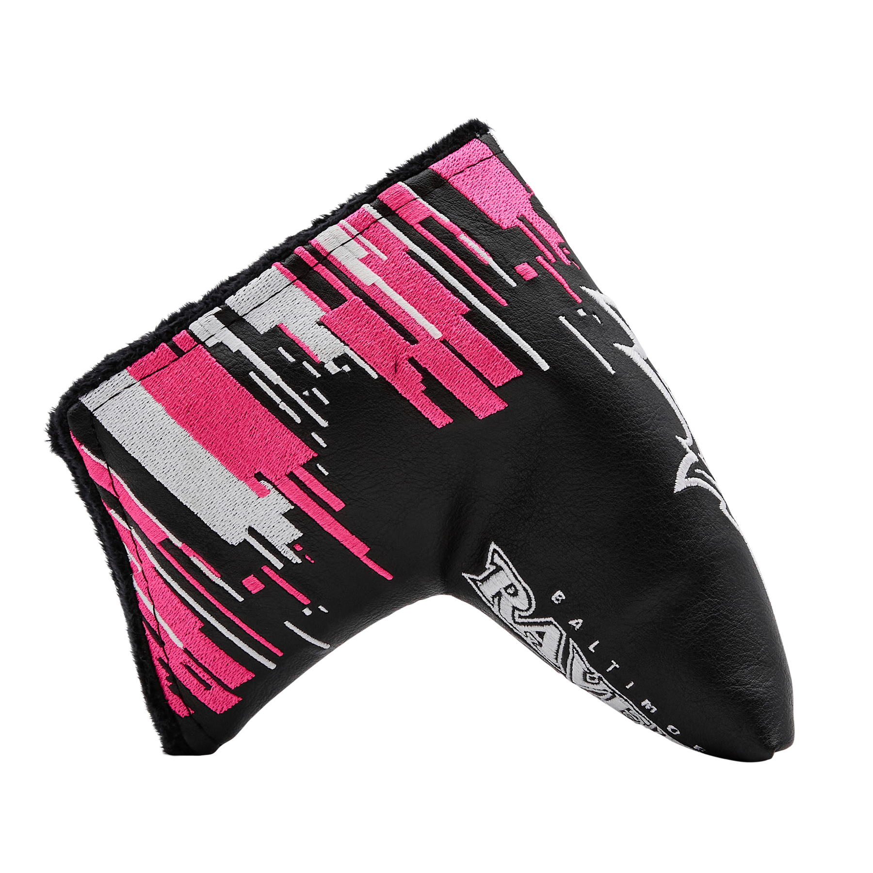 Go Ravens! Show off your Ravens pride with this digital stripe blade putter headcover featuring a limited colorway of pink, black and white. Finished with the Baltimore Ravens primary mark on the front and black plush interior with a magnetic closure. Limited quantities available. Please allow 2-3 weeks for this item to ship.