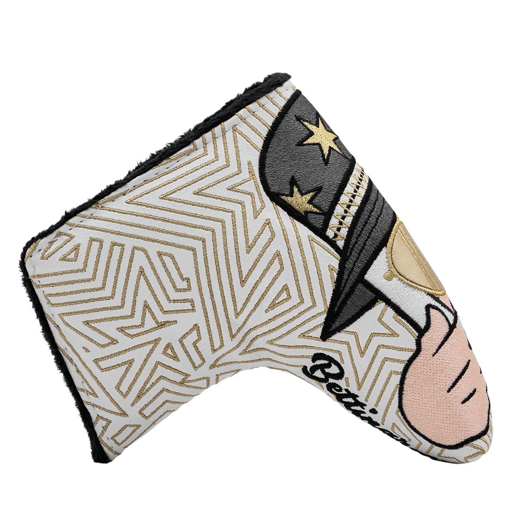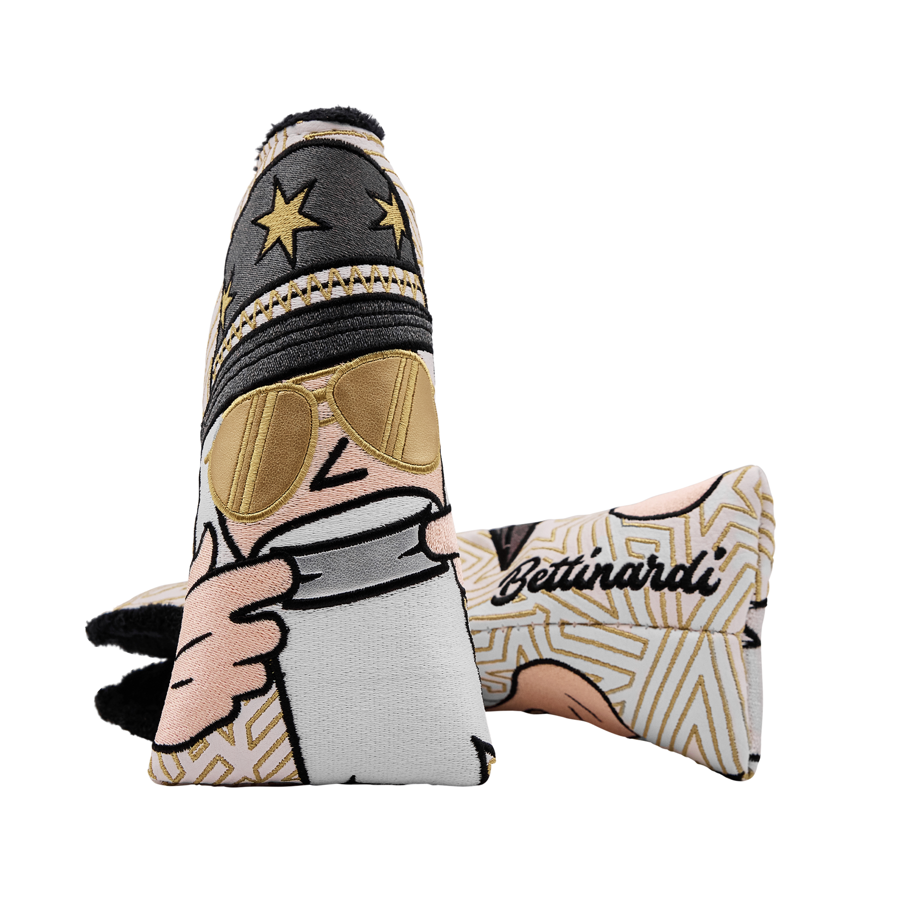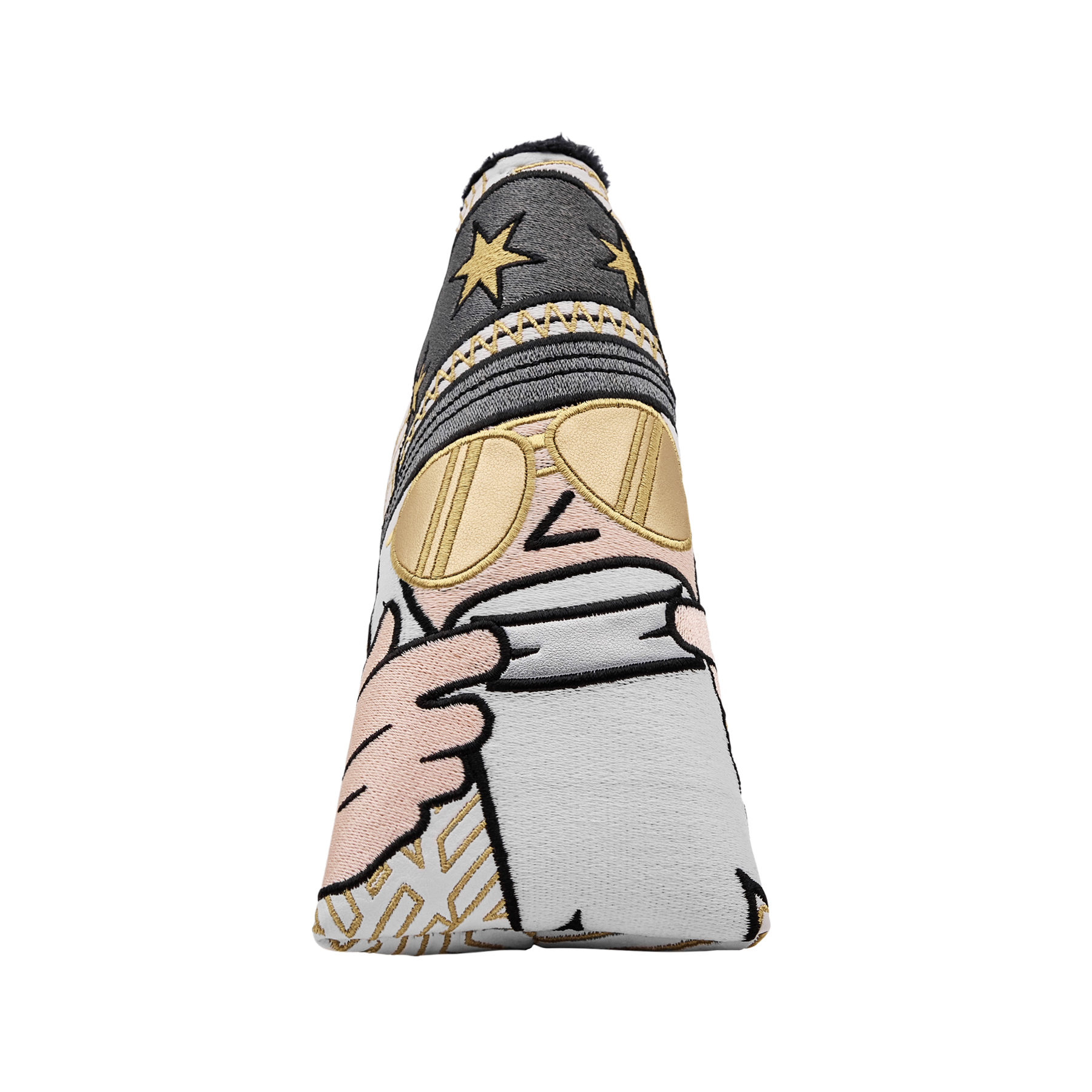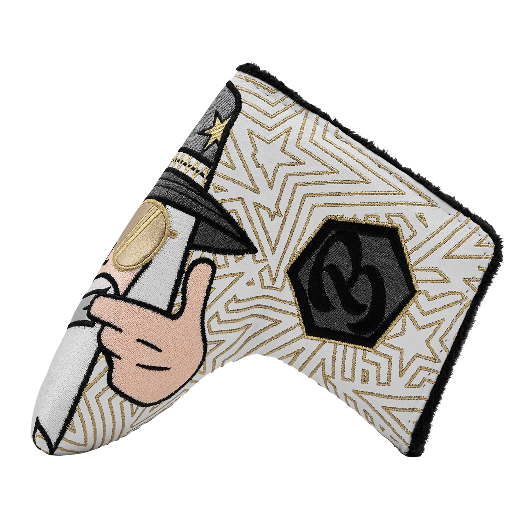The Wizard showed up iced out and ready to shine on this blade putter headcover — gold star hat, mirrored shades, and a silver grill shining brighter than a platinum plaque. Wrapped in a white base with gold stars, black plush interior, and a magnetic closure that hits smooth every time. Exclusively in the BKS merch store! Limit 1 per person. Good luck!