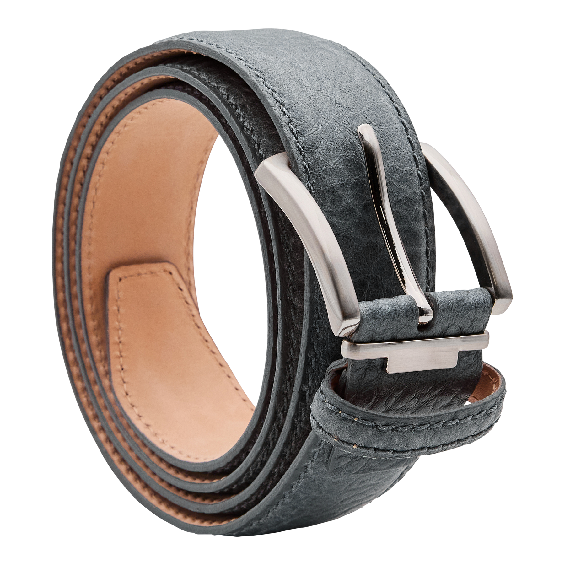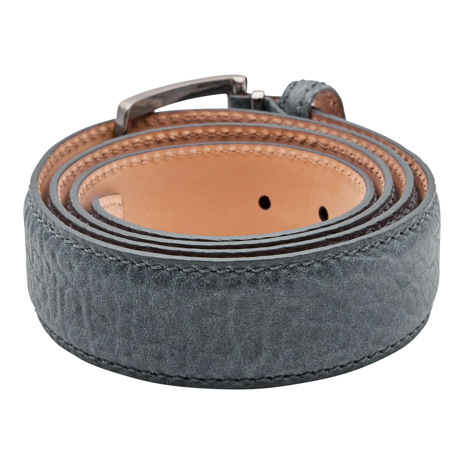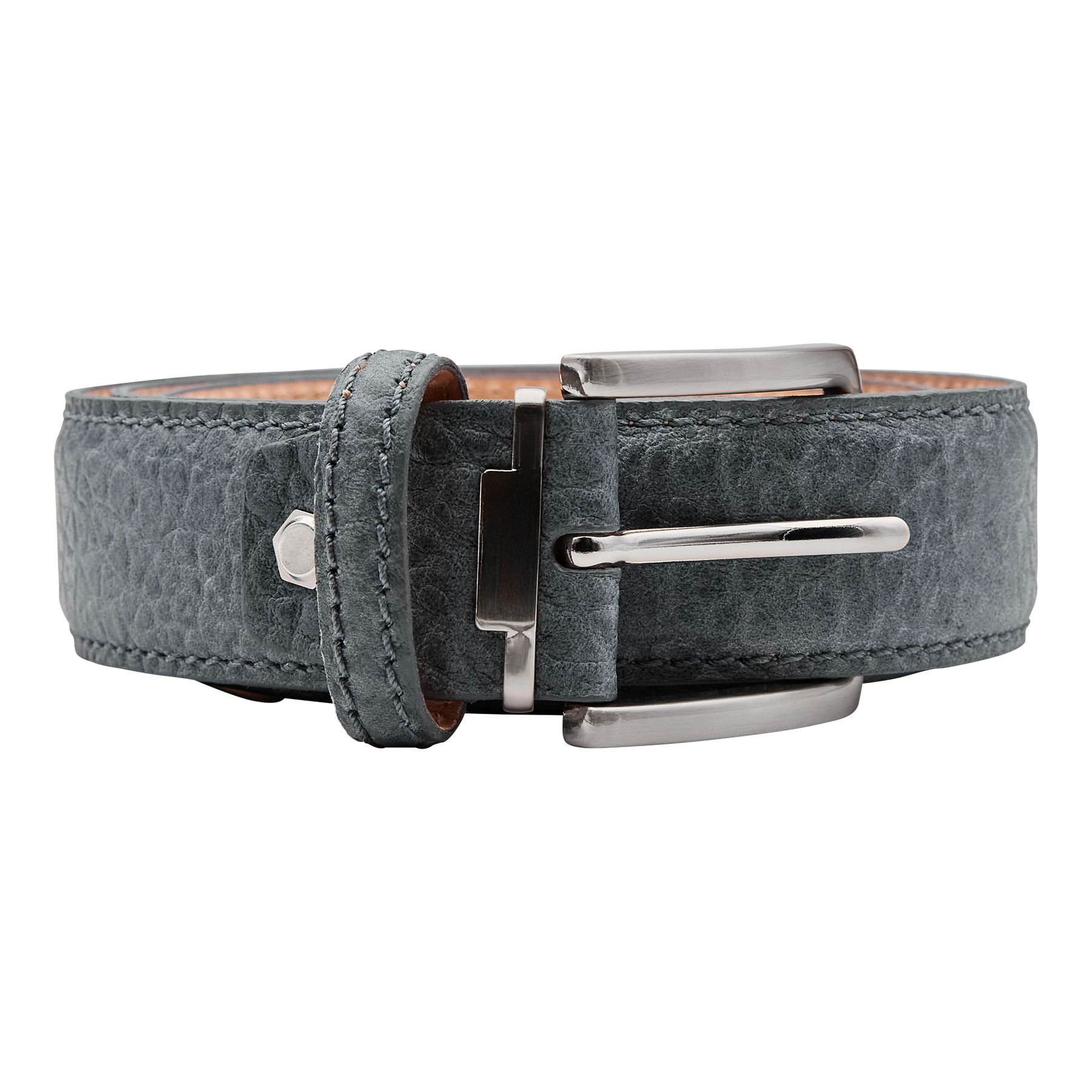 This durable yet soft gray leather belt adds the perfect touch of refinement to elevated occasion wear or relaxed golf attire. The genuine American Bison leather is responsibly sourced from farm-raised animals and is hand dyed, expertly cut in the USA, and finished with a brushed nickel buckle. *Please note this is a non-returnable item* (Width: 1.57 inches)