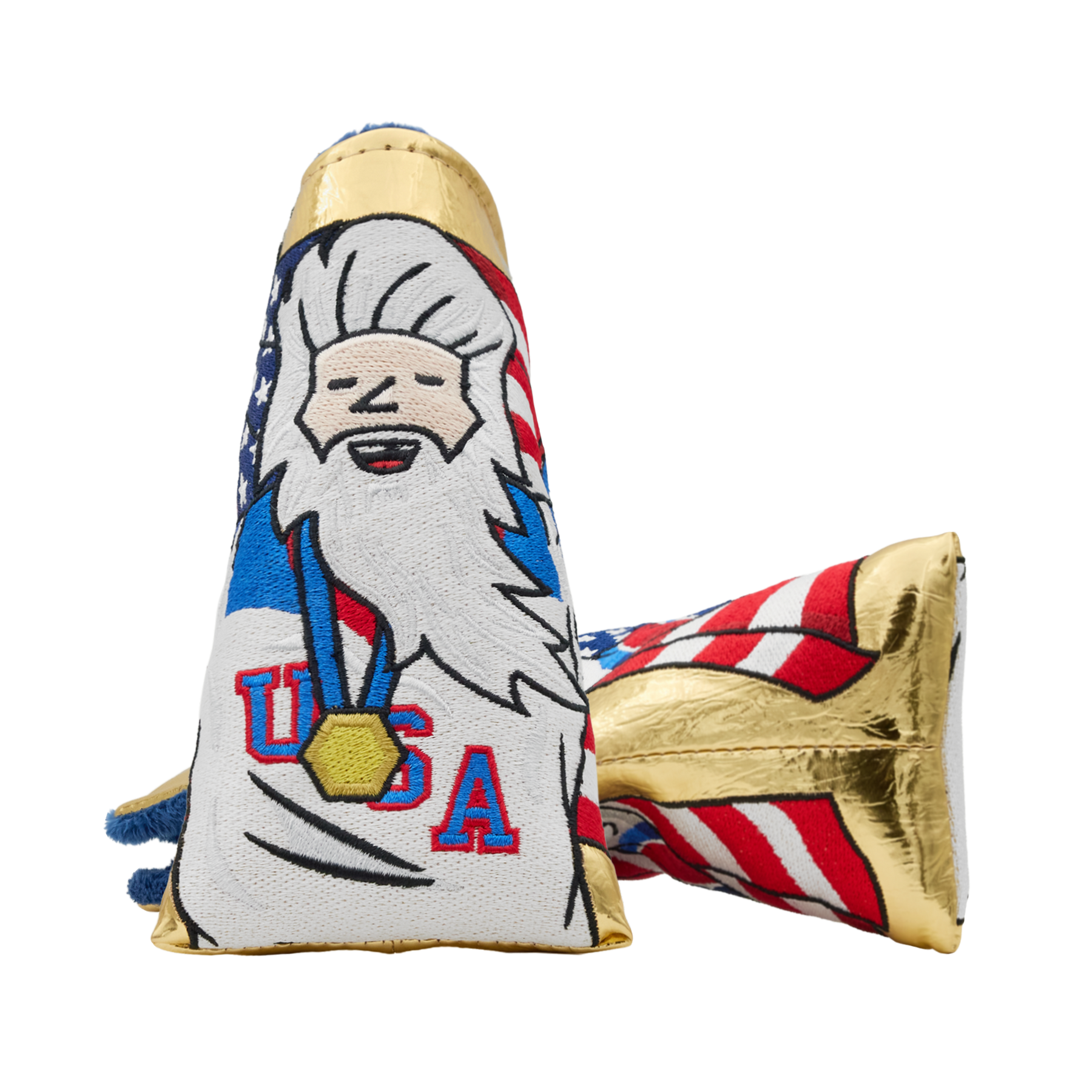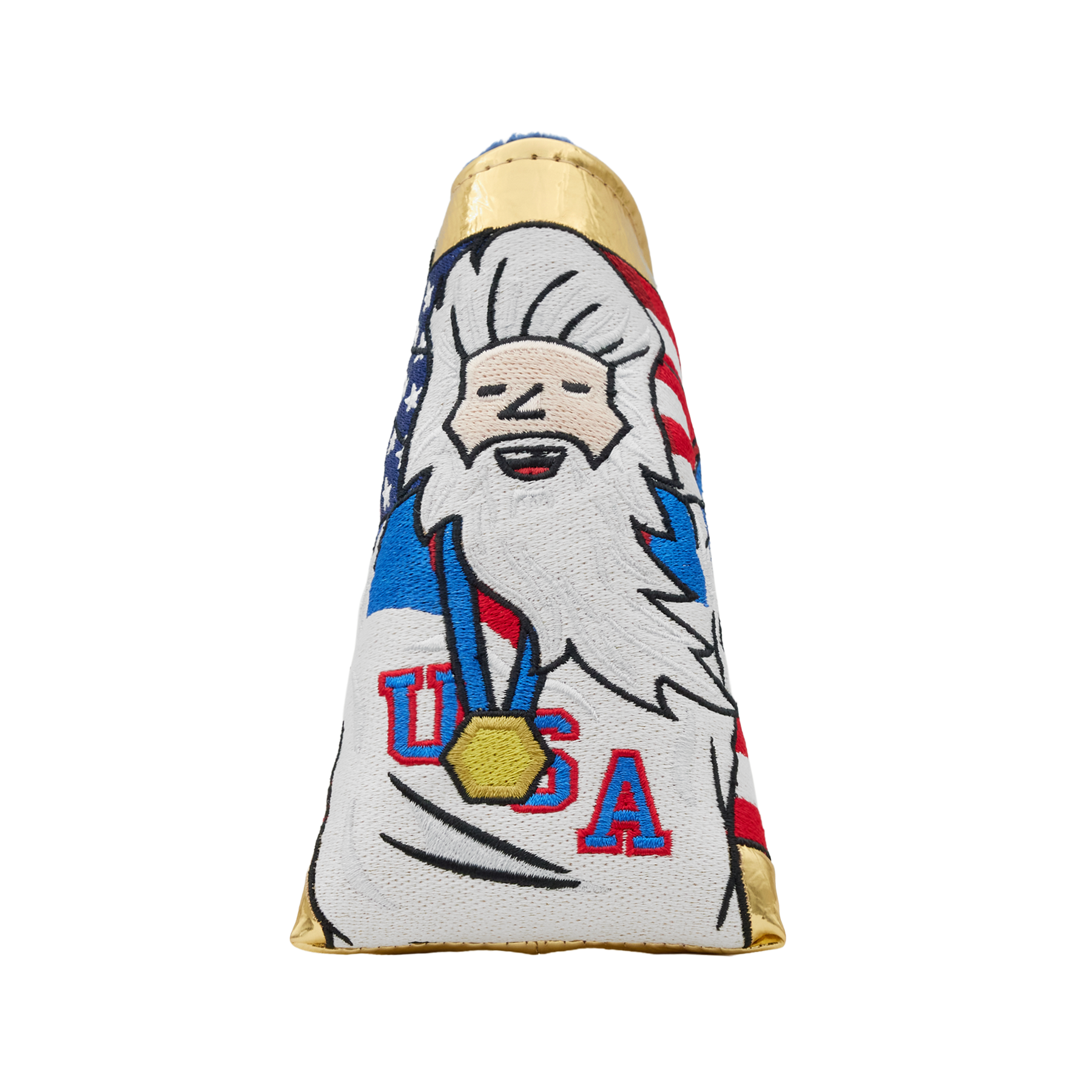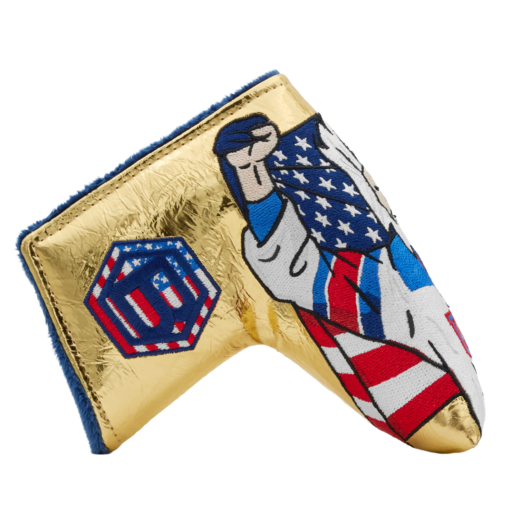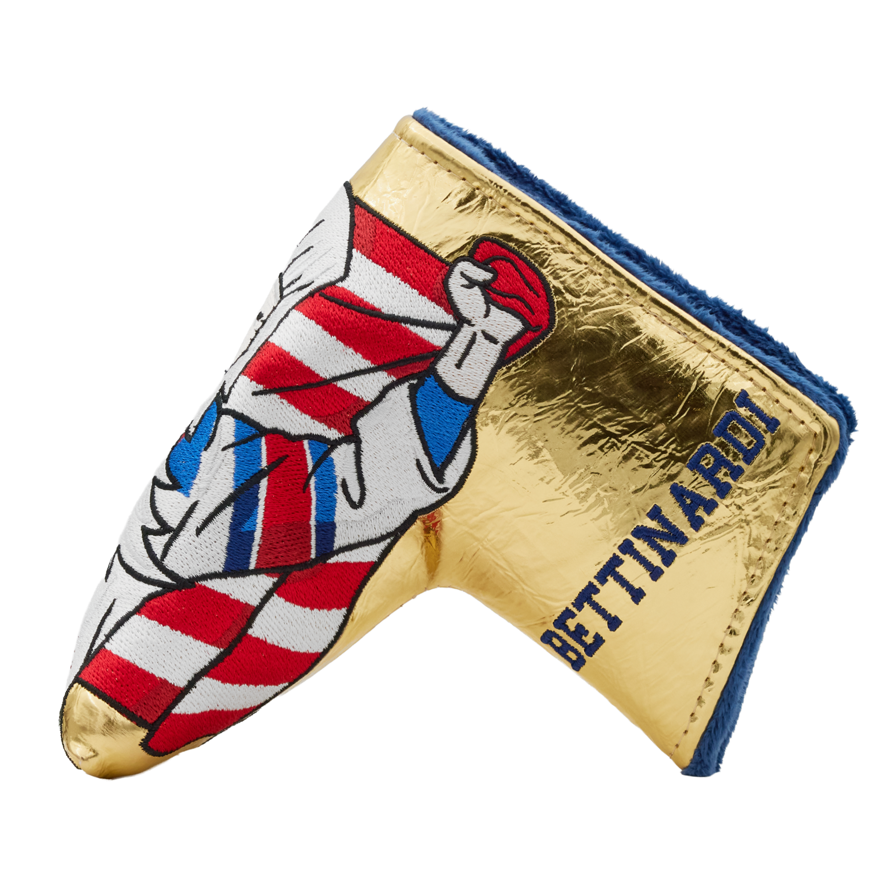 USA! This blade putter headcover commemorates an iconic moment, featuring the Champion Wizard with the stars and stripes (and minus a few teeth) embroidered onto a metallic gold foil base. One side features a red, white, and blue Hex B, while the opposite features a navy Bettinardi wordmark. Finished with a navy plush interior, this headcover will keep your putter safe while adding a patriotic streak to your setup. Limited quantities available, limit 1 per person. Good luck! This item will ship within 3-4 weeks.