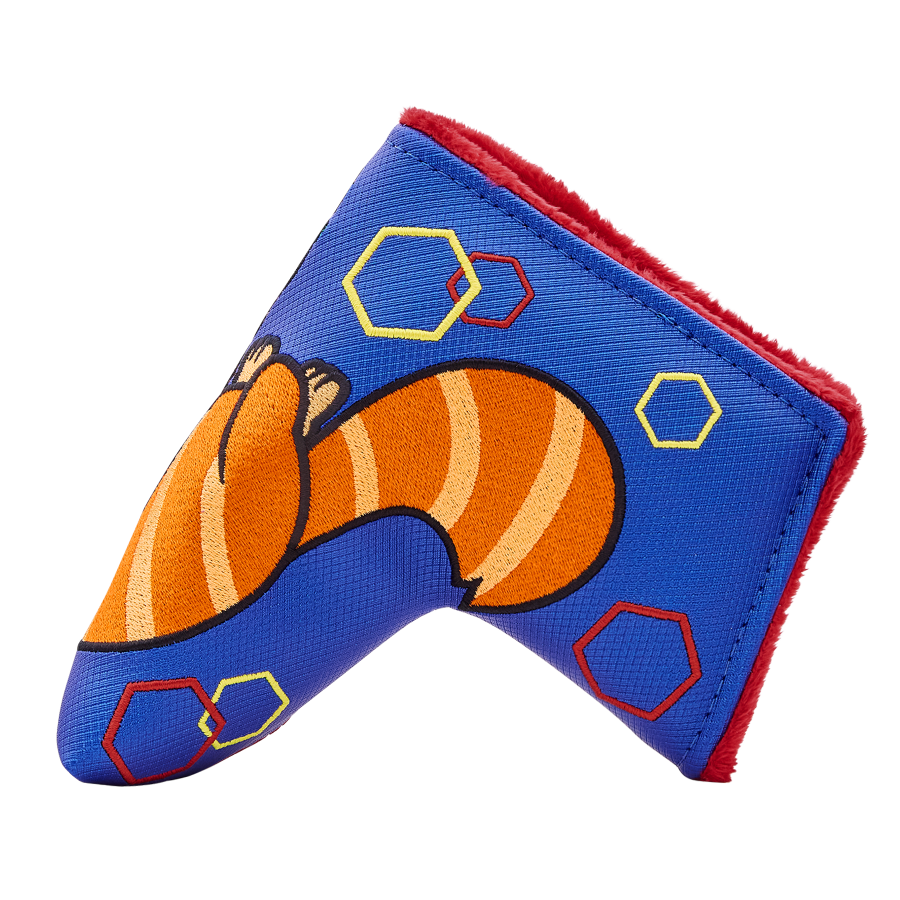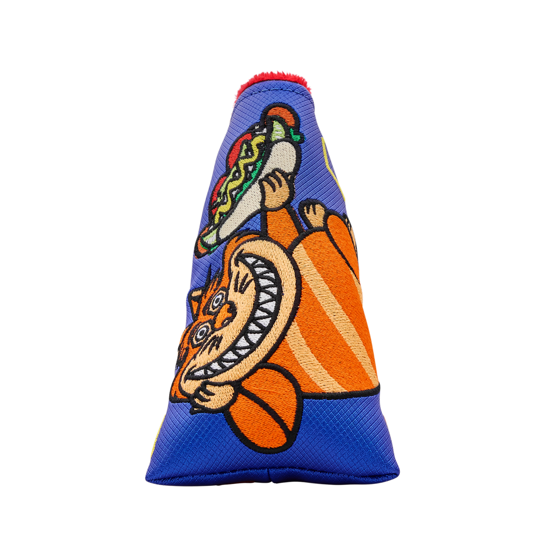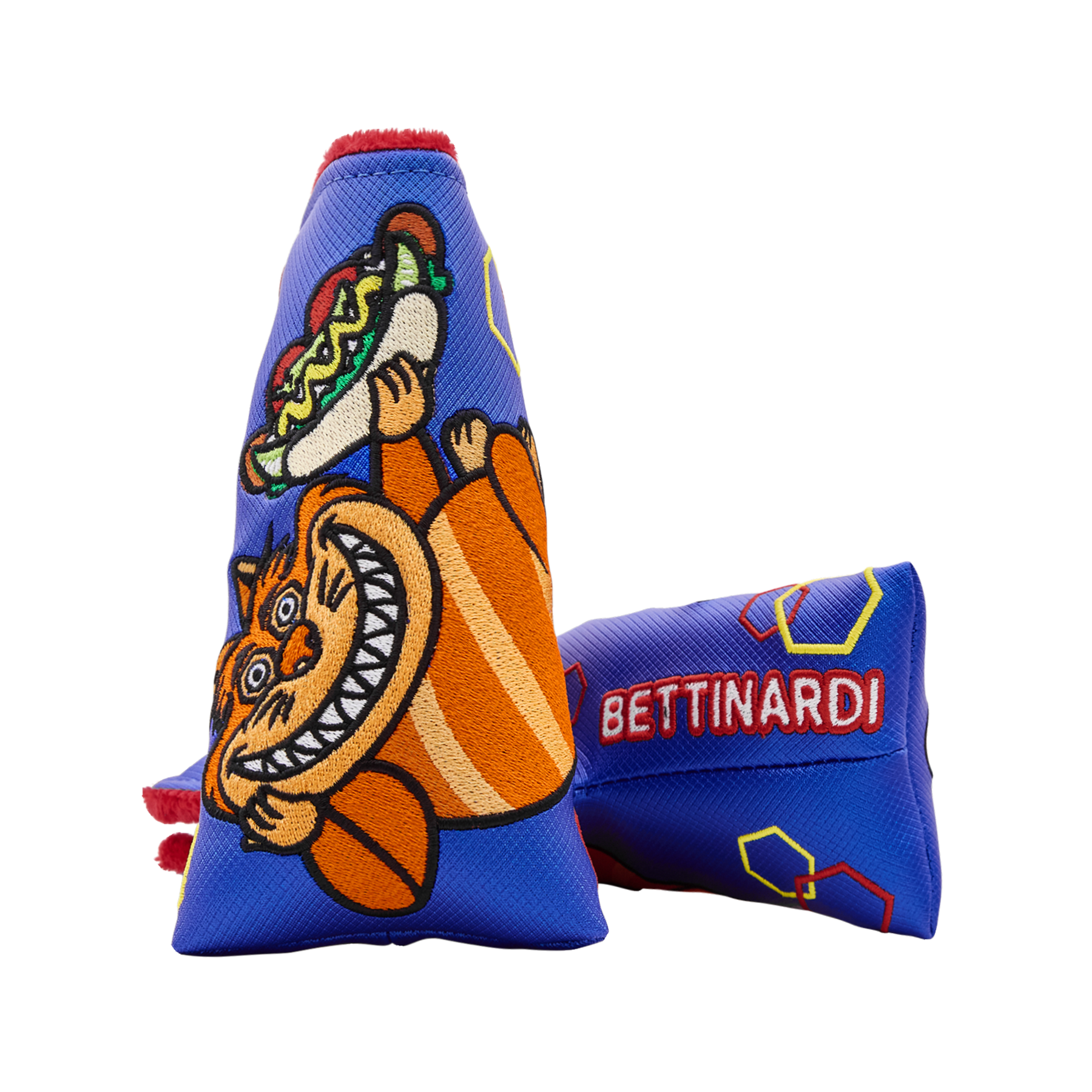 The Grail Cat is back with his Chicago-style hot dog. This blade putter headcover features a textured blue base with red and yellow floating open hexes. The Grail Cat lounging happily with his Chicago Style hot dog, while the side carries a red and yellow Hex B and Bettinardi wordmark. This headcover is finished with a red plush interior and magnetic closure to keep your putter safe and looking sharp. Limited quantities are available. Limit 1 per person! Good Luck!