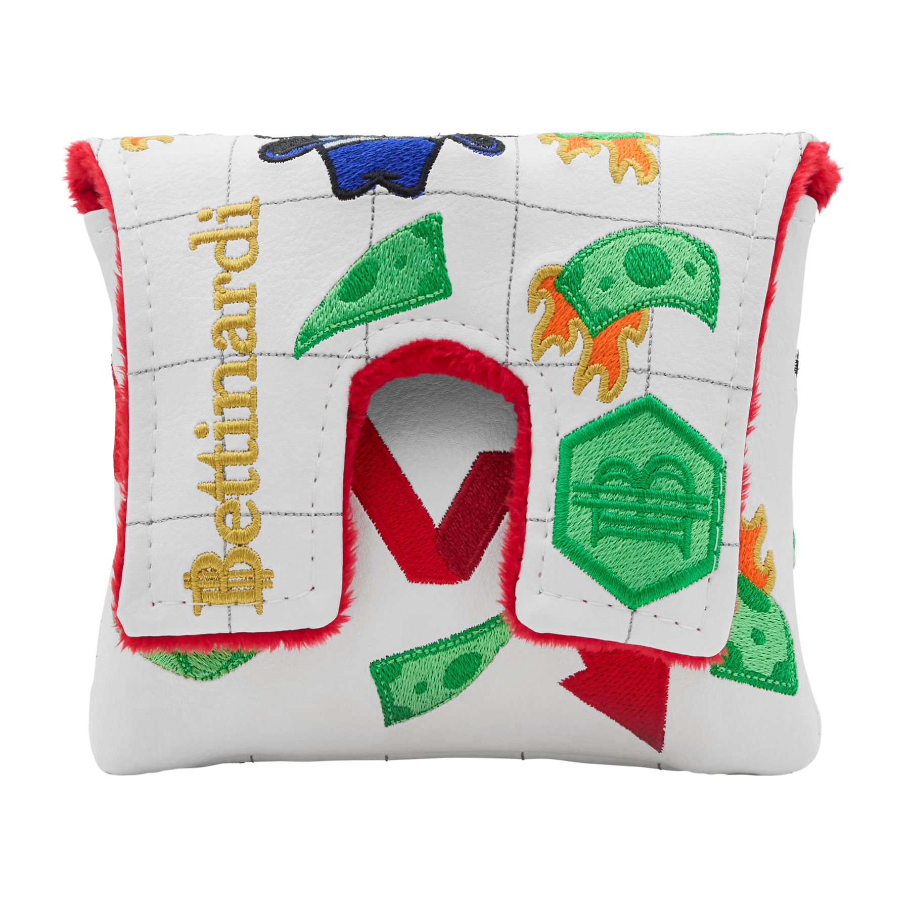 The market may have turned, but the Fat Cat's grin never fades. This Wall Street Bear Market Fat Cat Blade headcover features the Fat Cat amidst burning cash, as the bear charges downward. Constructed on a premium white smooth base with sharp embroidery, this headcover features a green Wall Street Hex B and a gold Bettinardi wordmark on opposite sides. Finished with a red plush interior, this headcover will keep your setup looking elite, even on a downturn. Limited quantities are available. Limit 1 per person. Good luck!