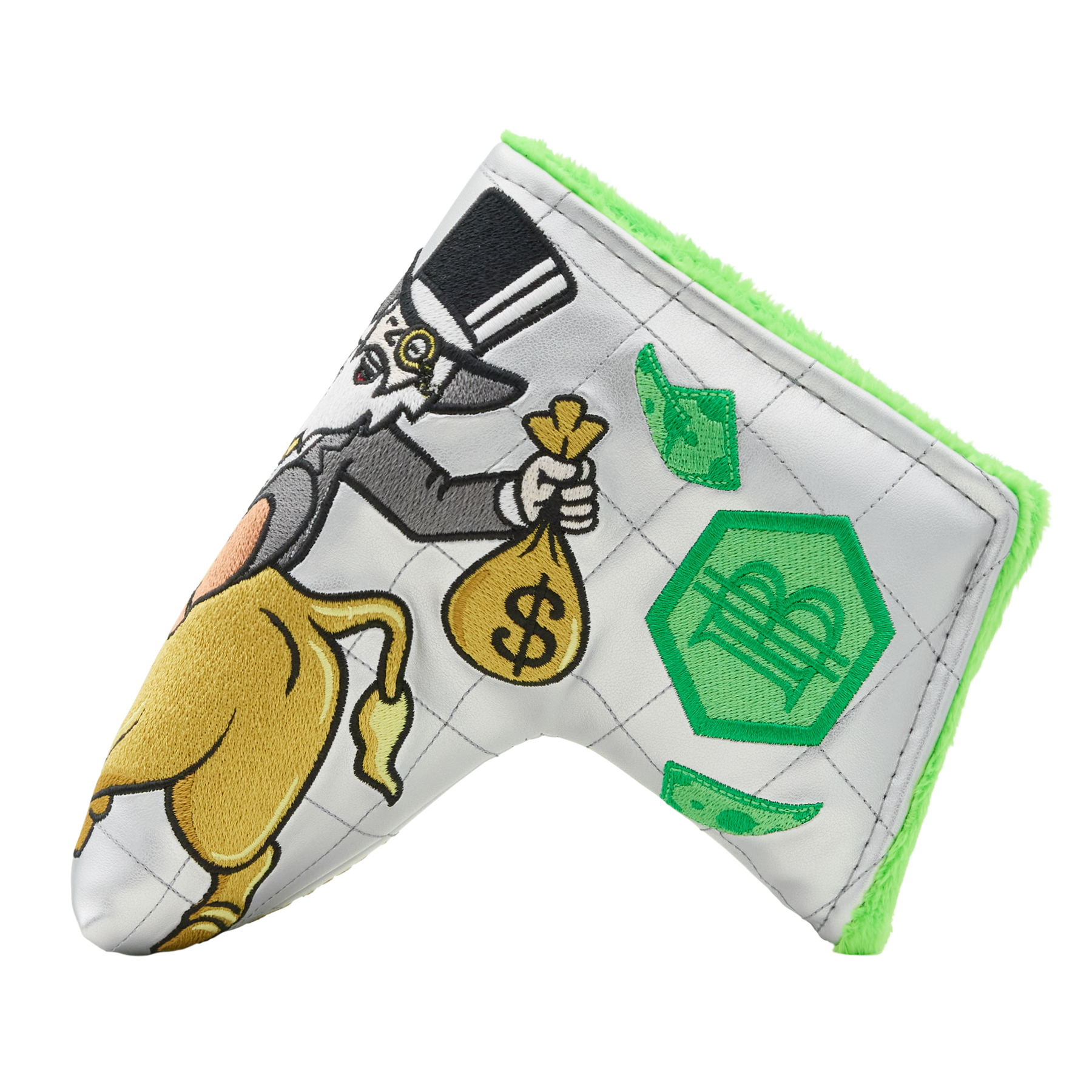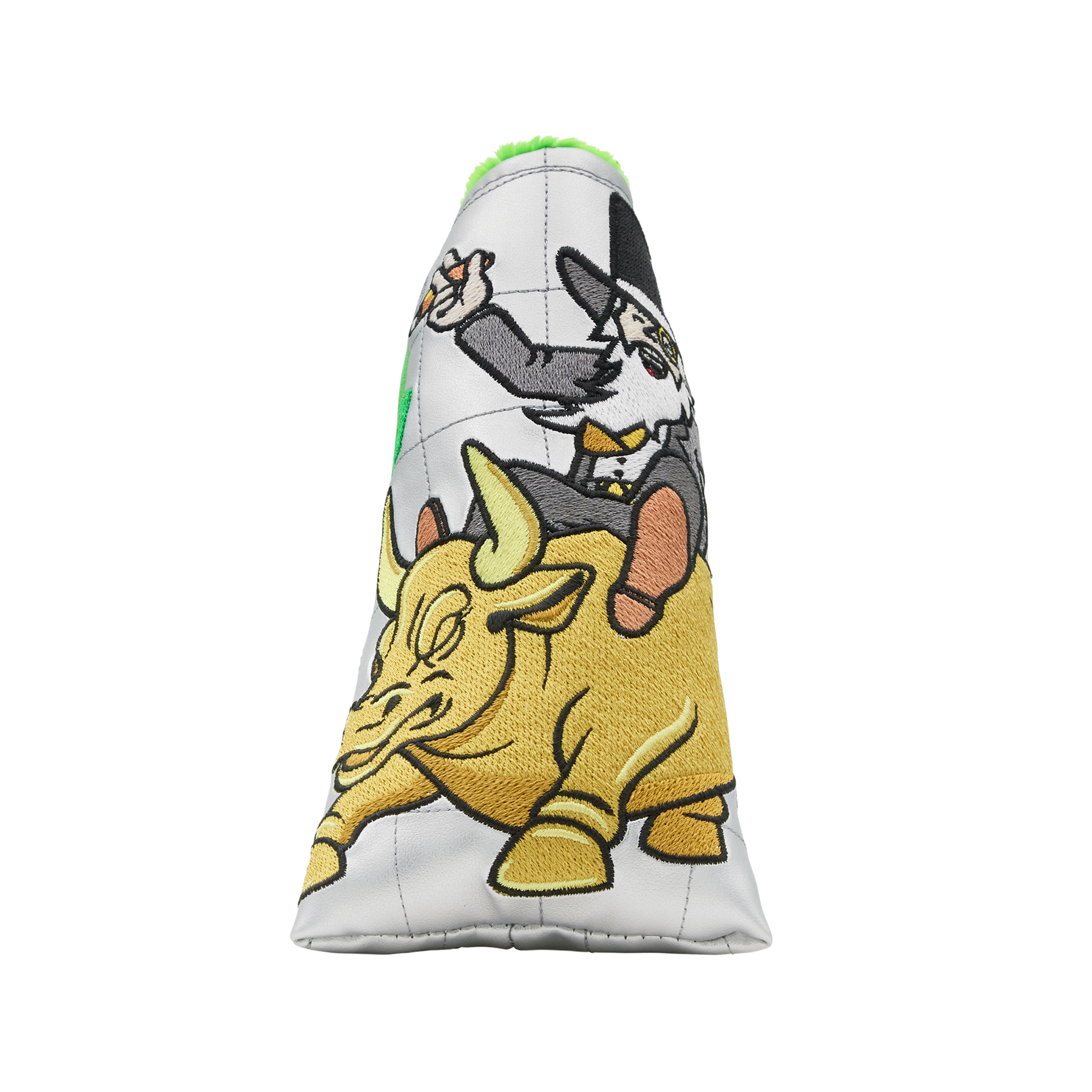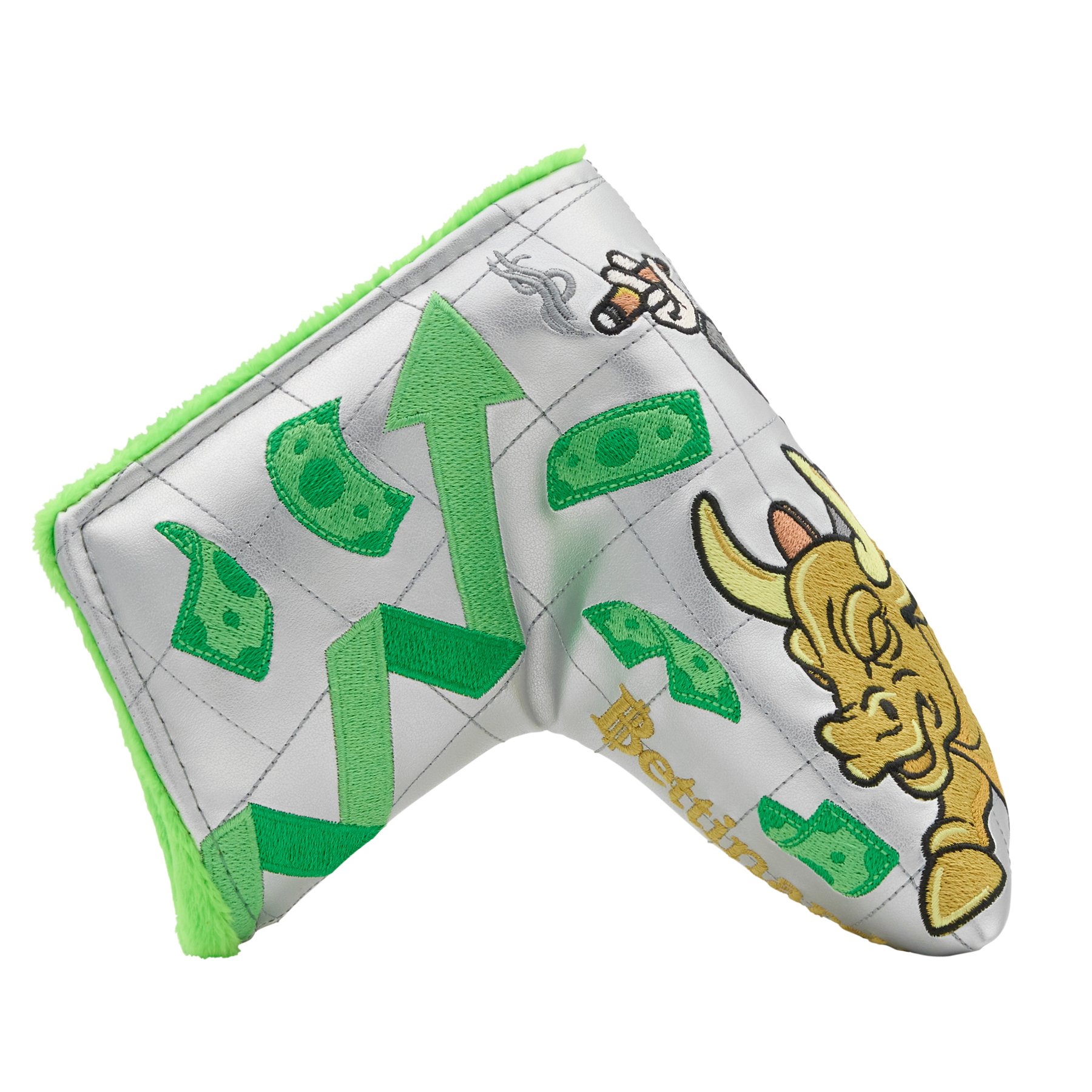 The market's up, and the Wizard is riding high. This Wall Street Bull Market Wiz Blade Putter Headcover features the Wizard with his moneybag in tow, charging forward atop a gleaming golden bull. Constructed on a premium metallic silver base with sharp embroidery, this headcover also features a green Wall Street Hex B and gold Bettinardi wordmark on opposite sides. Finished with a plush lime green interior and magnetic closure, this headcover will help you stay bullish through every round. Limited quantities are available. Limit 1 per person. Good luck!