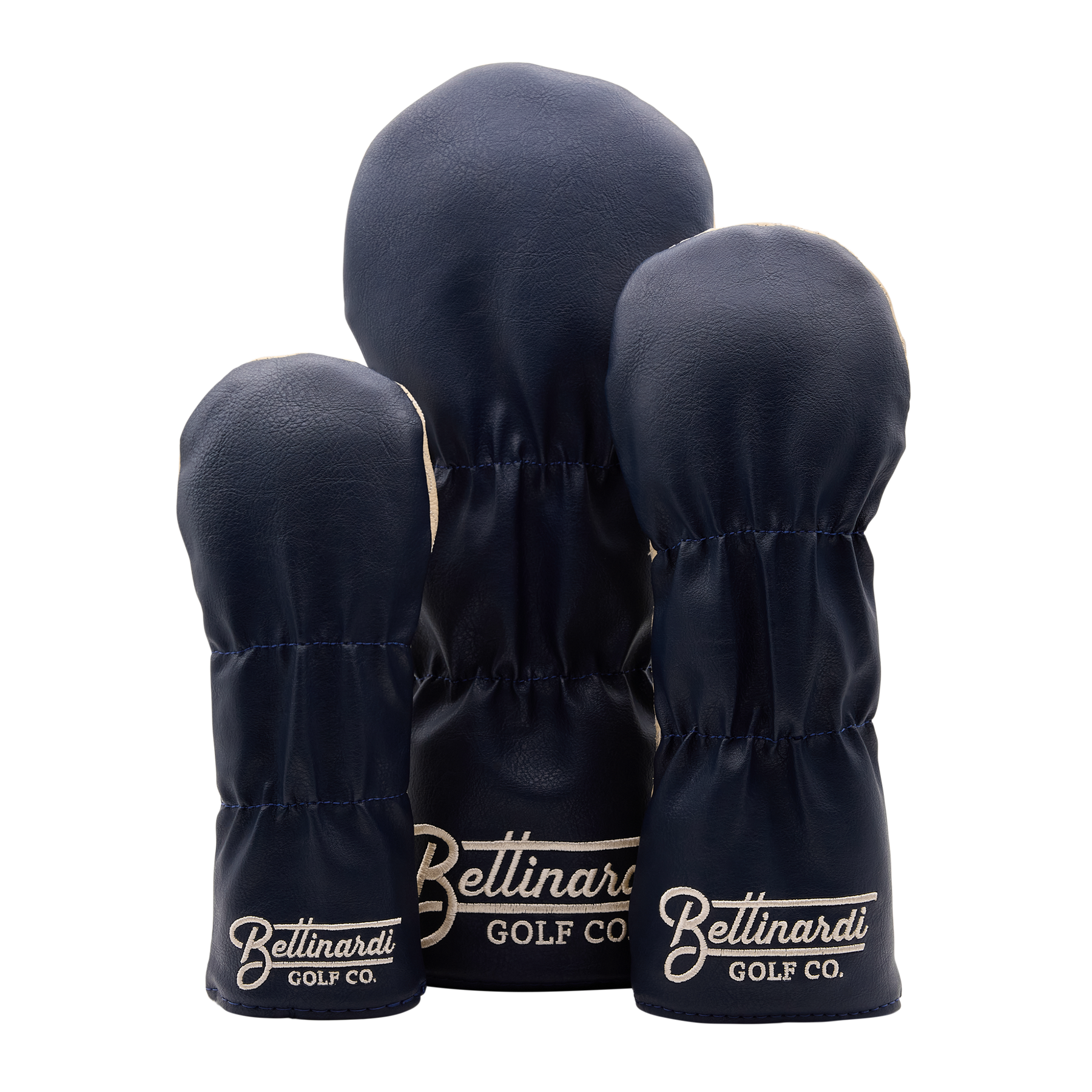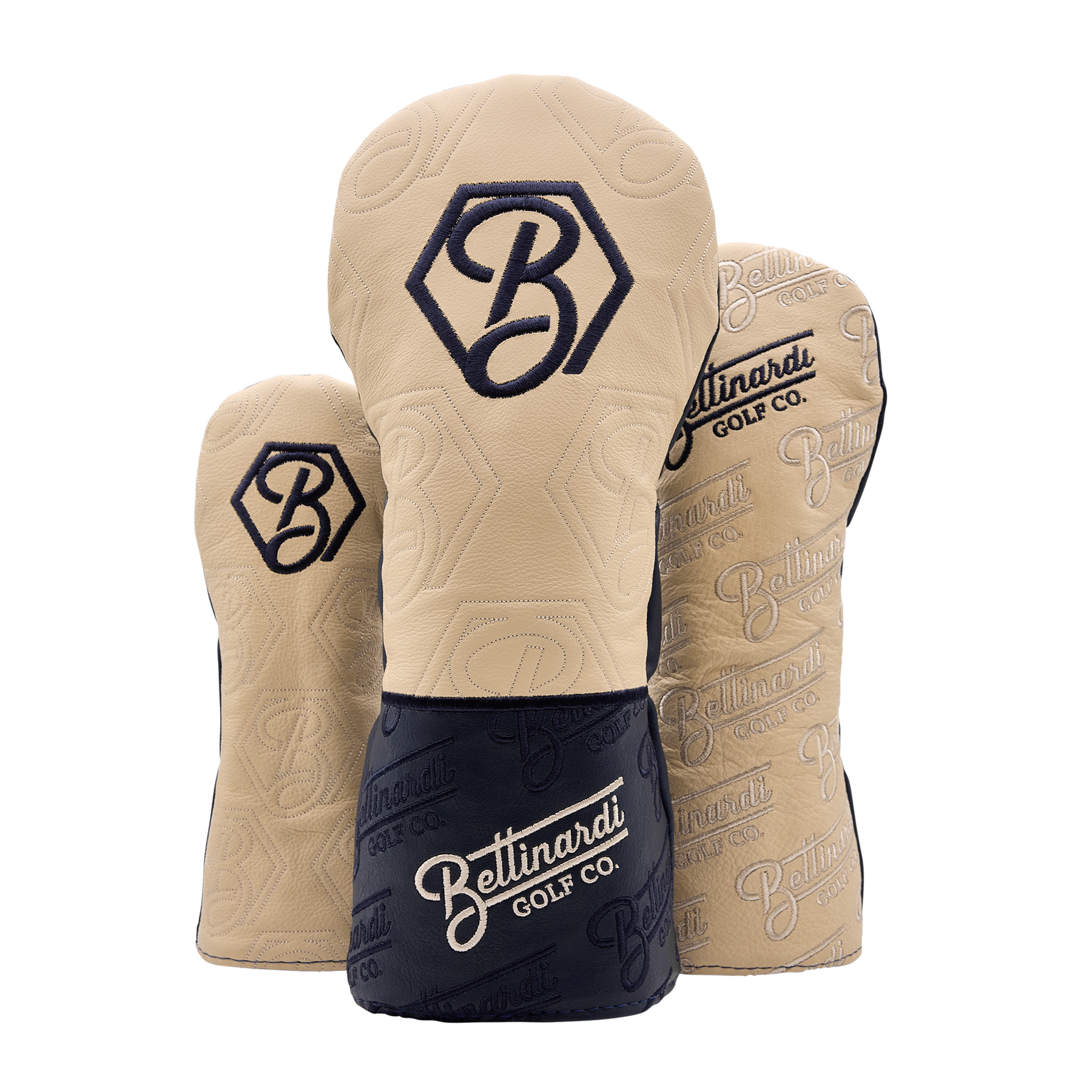 The Bettinardi Golf Co. Script wood set showcases a retro script Hex B pattern over an ivory base on the front, and the back features a smooth navy base with Bettinardi Golf Co. embroidered in ivory. Finished with a navy interior, this set offers options for a driver cover, 3-wood cover, or hybrid cover.