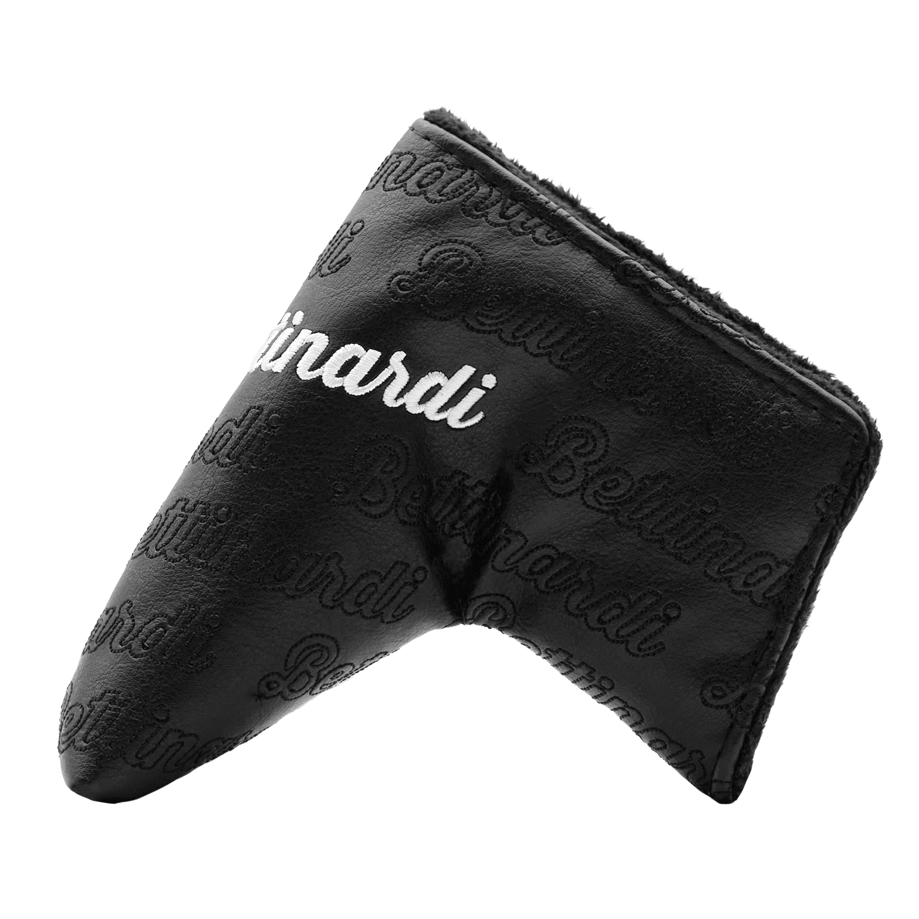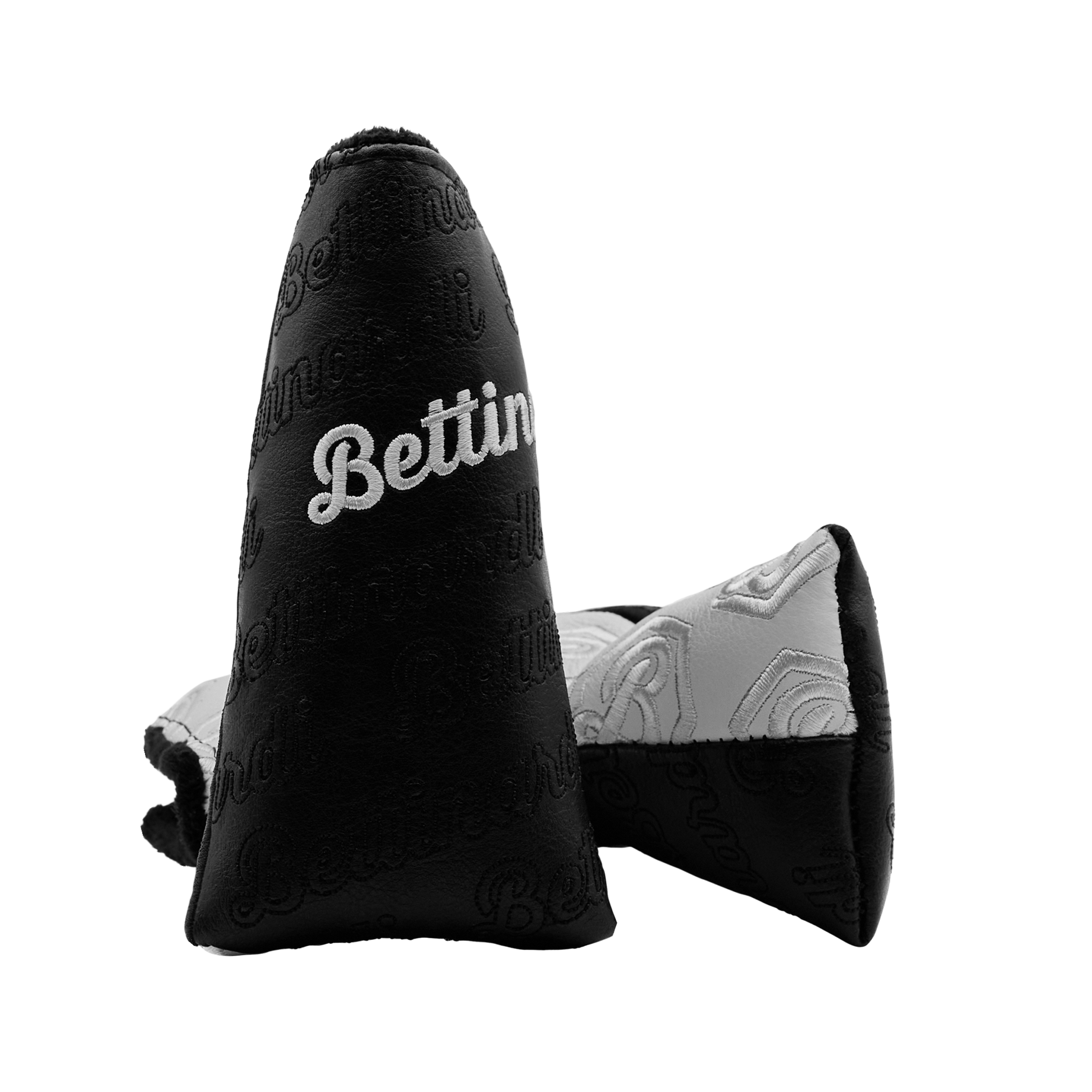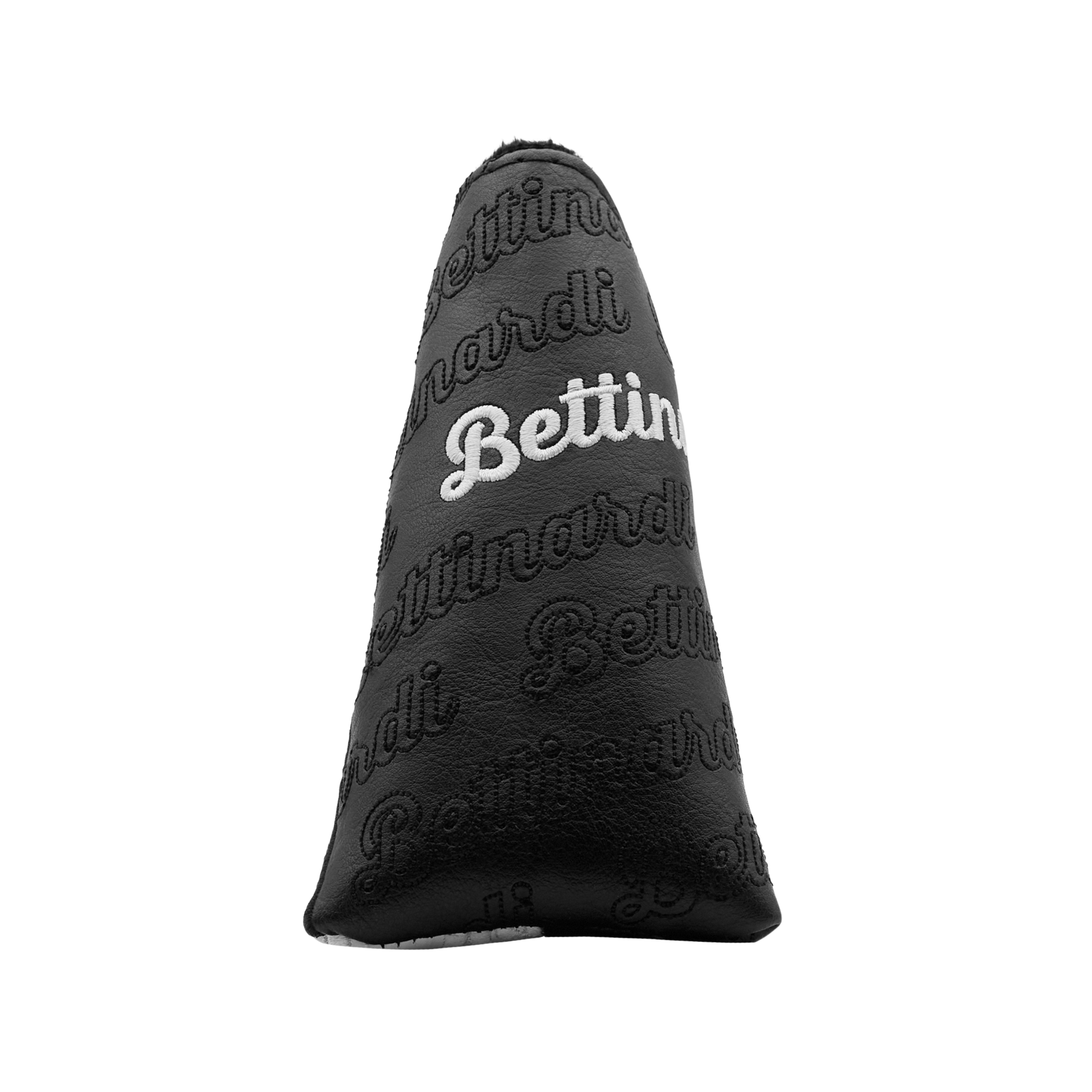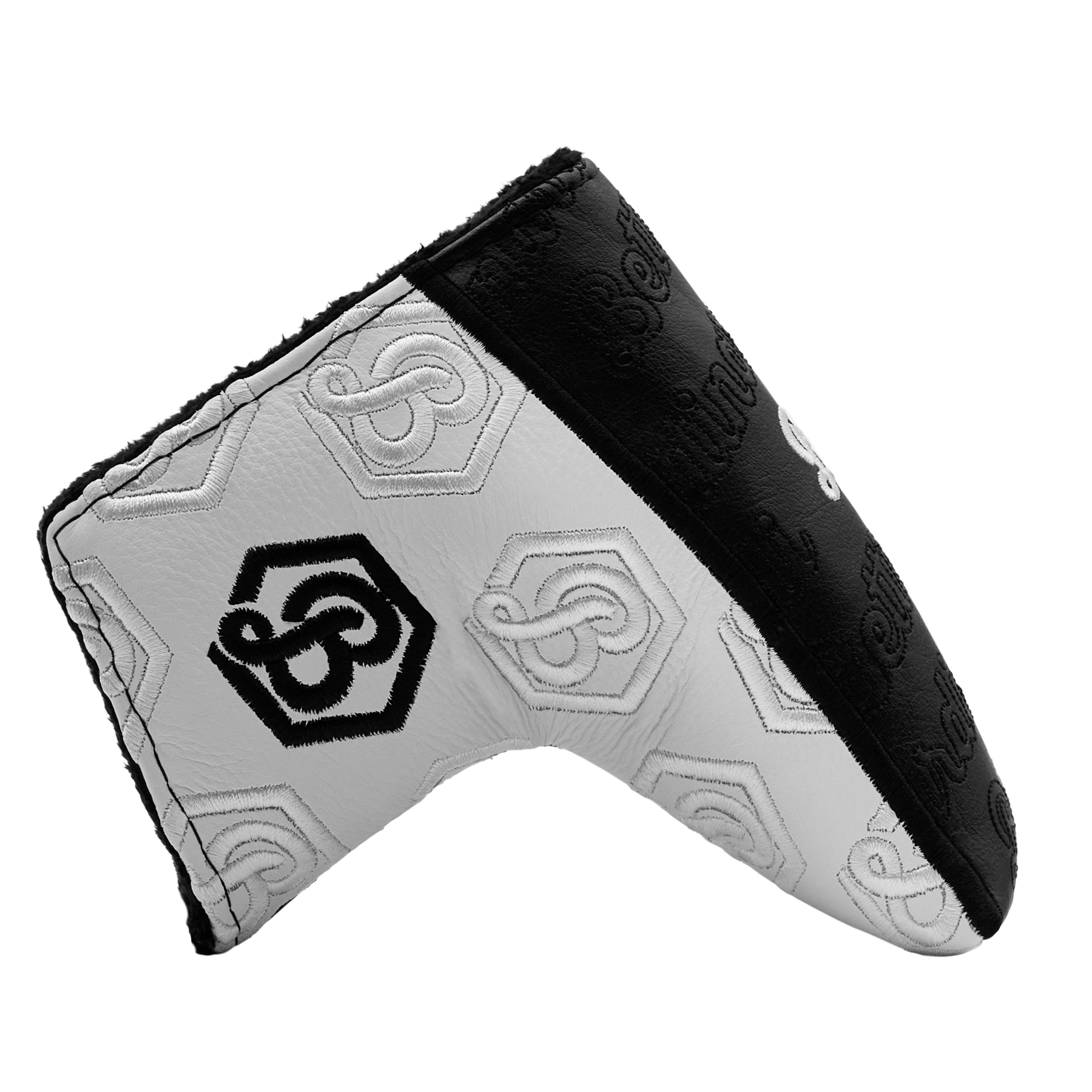 The Bettinardi Script Hex B blade putter headcover features a Bettinardi script pattern and white highlight stitched onto a smooth black base, with a classic Hex B pattern on white. This two-tone headcover is finished with a black plush interior and magnetic closure.