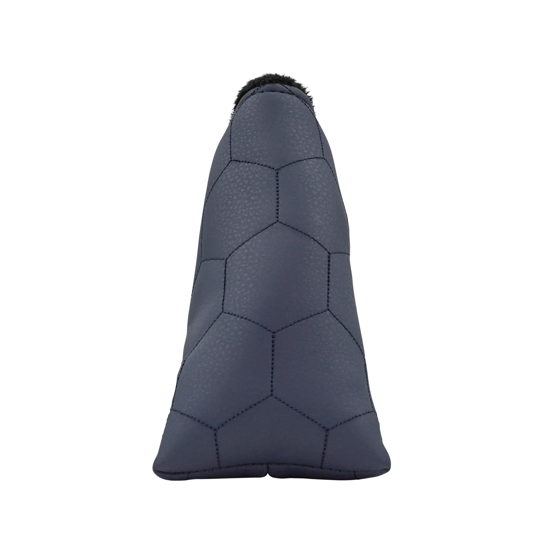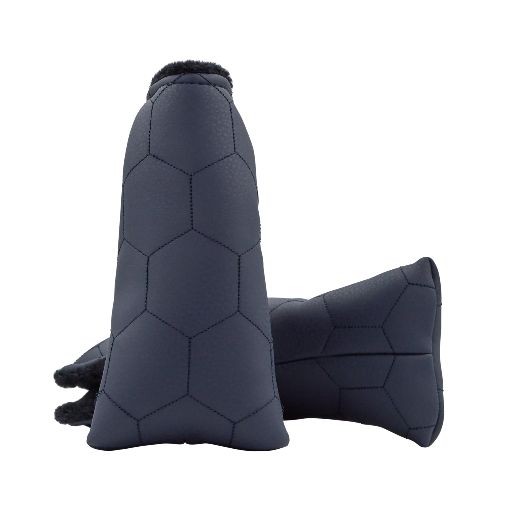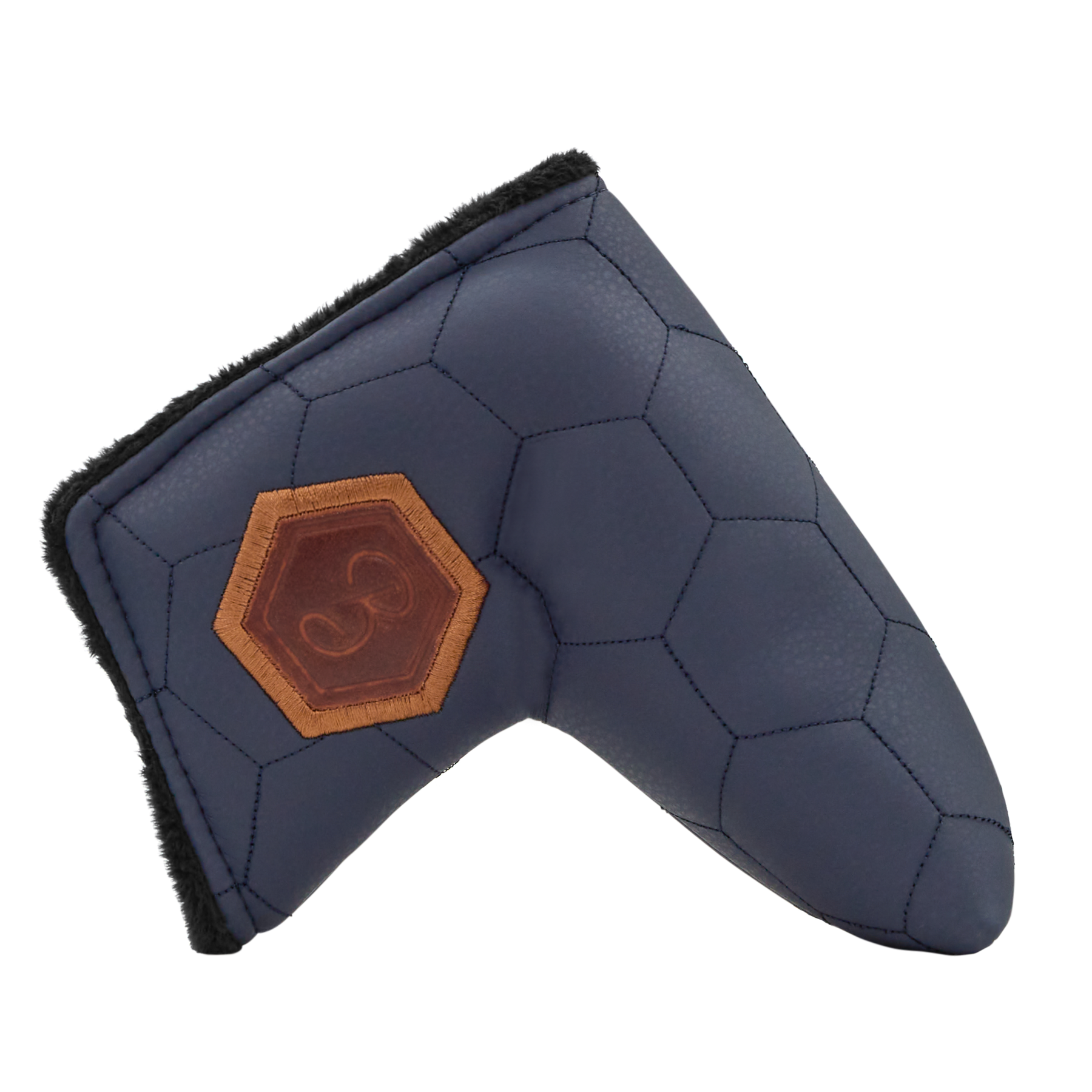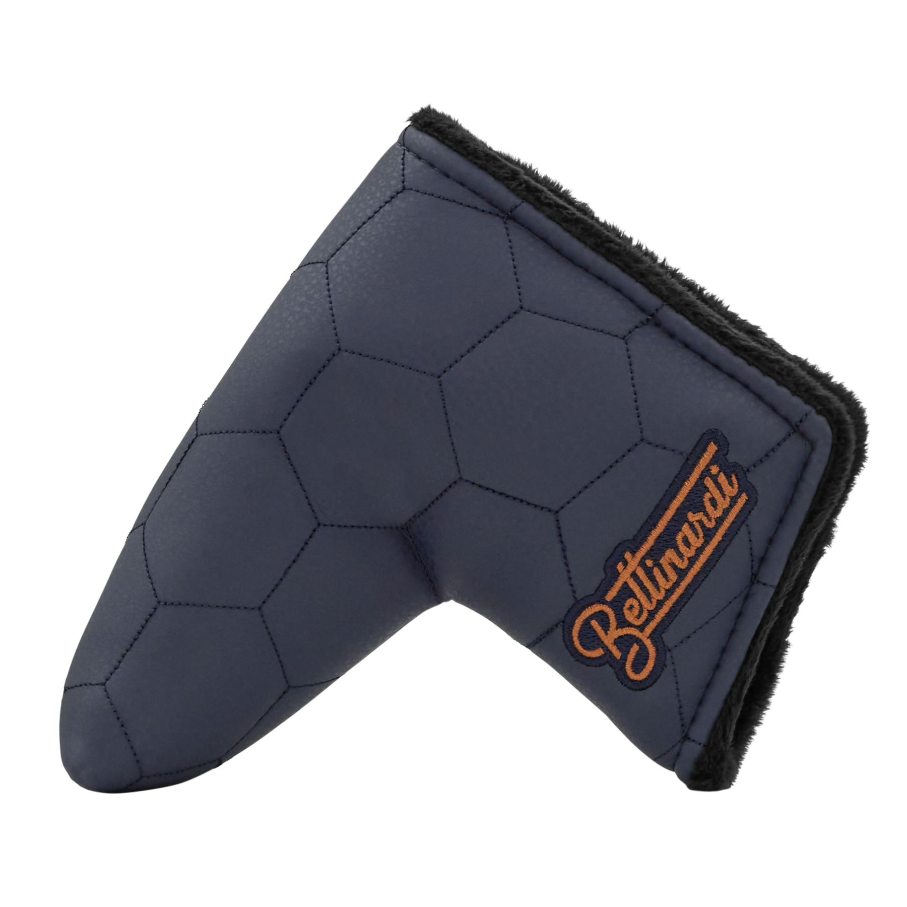 Designed for the golfer with an eye for subtle luxury, this Bettinardi Script Quilted Hex blade putter headcover showcases a refined navy-on-navy hexagon embroidered pattern throughout, with a Hex B Horween leather applique on one side and a tan-and-navy embroidered Bettinardi script logo on the other. A plush black interior and secure magnetic closure complete this headcover, blending craftsmanship with classic Bettinardi style.