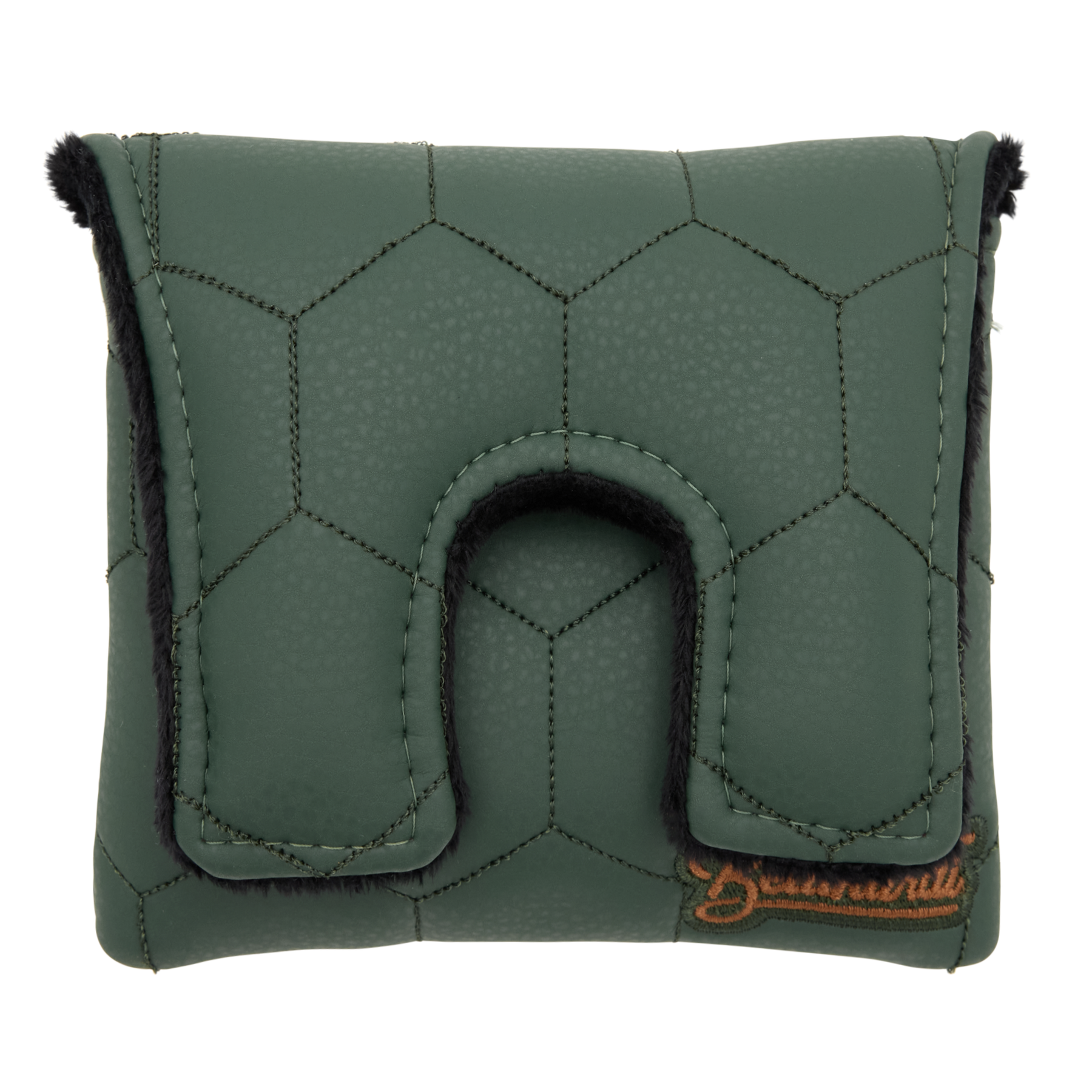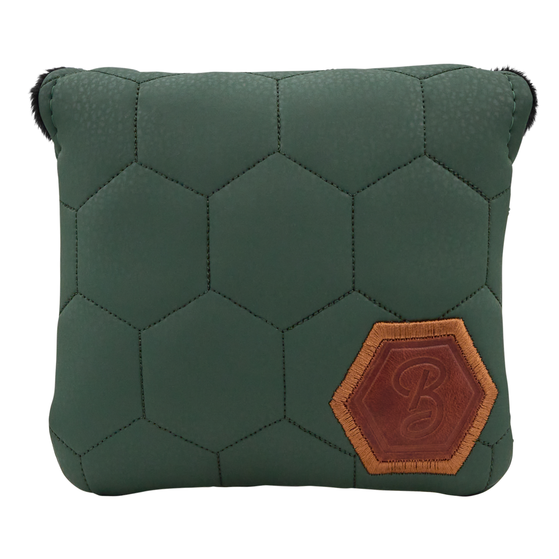 Designed for the golfer with an eye for subtle luxury, this Bettinardi Script Quilted Hex center shaft mallet putter headcover showcases a refined green-on-green hexagon embroidered pattern across the front with a Hex B Horween leather applique in the bottom corner. The back features a tan-and-green embroidered Bettinardi script logo, expertly stitched for a timeless look. A plush black interior and secure magnetic closure complete this headcover, blending craftsmanship with classic Bettinardi style.