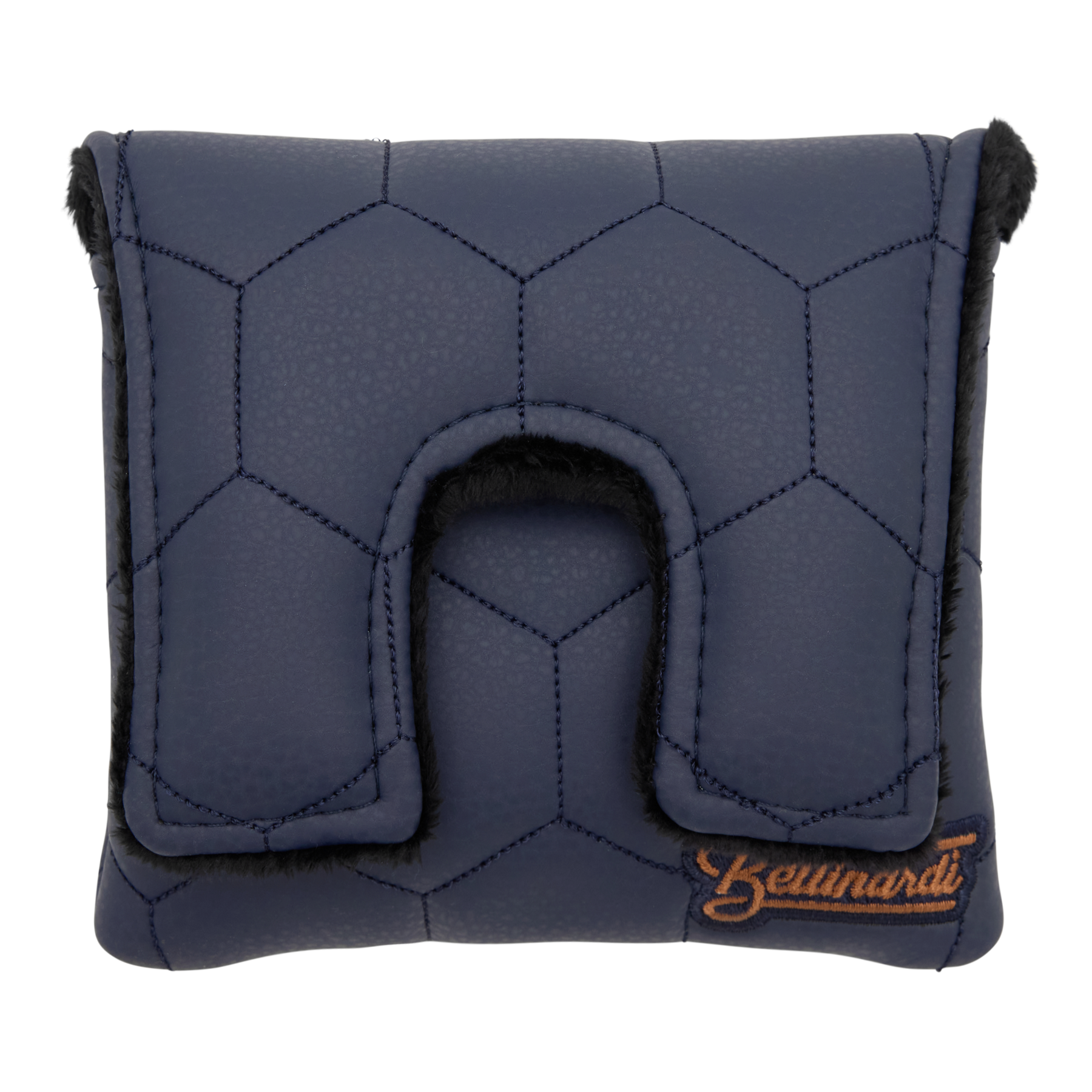 Designed for the golfer with an eye for subtle luxury, this Bettinardi Script Quilted Hex mallet putter headcover showcases a refined navy-on-navy hexagon embroidered pattern across the front with a Hex B Horween leather applique in the bottom corner. The back features a tan-and-navy embroidered Bettinardi script logo, expertly stitched for a timeless look. A plush black interior and secure magnetic closure complete this headcover, blending craftsmanship with classic Bettinardi style.