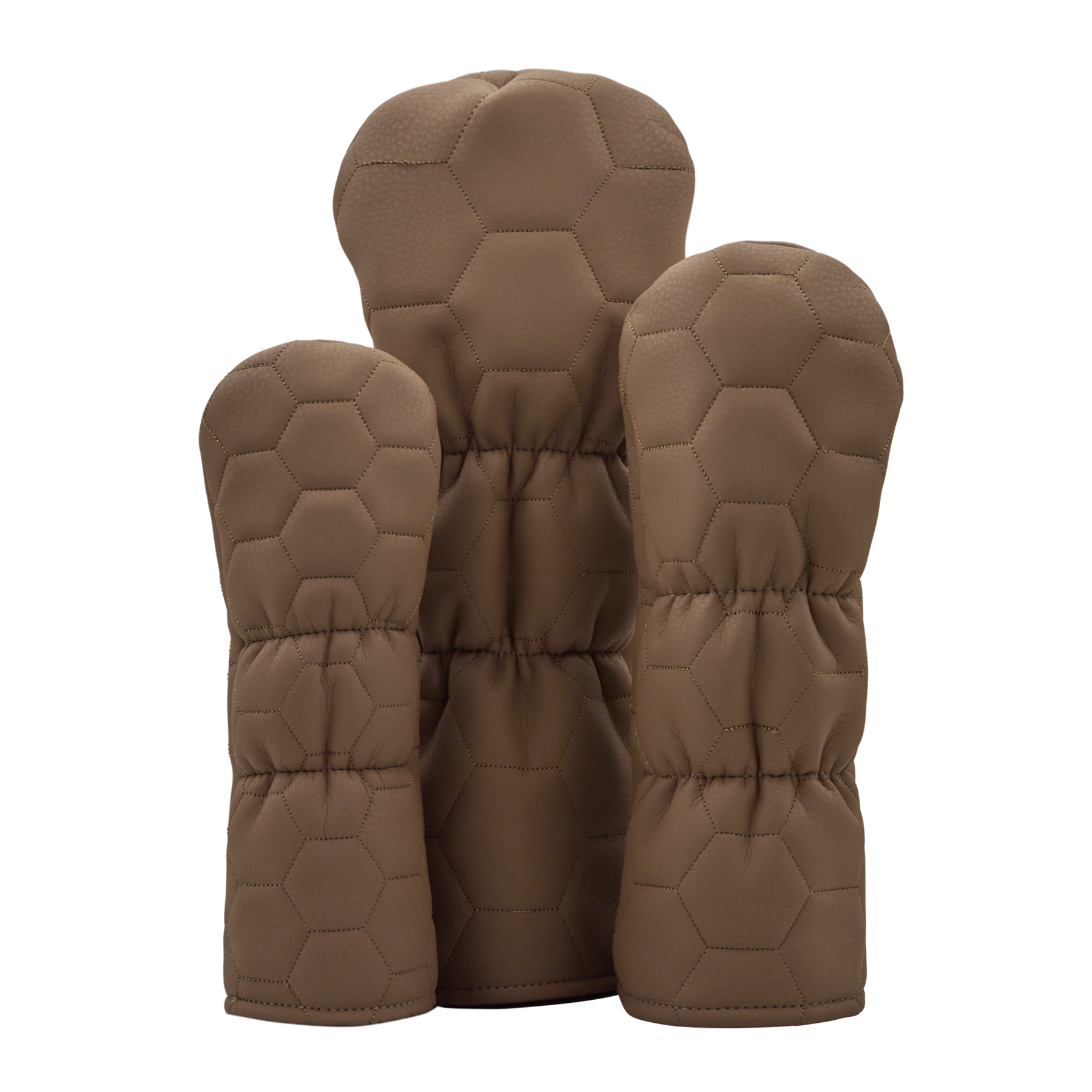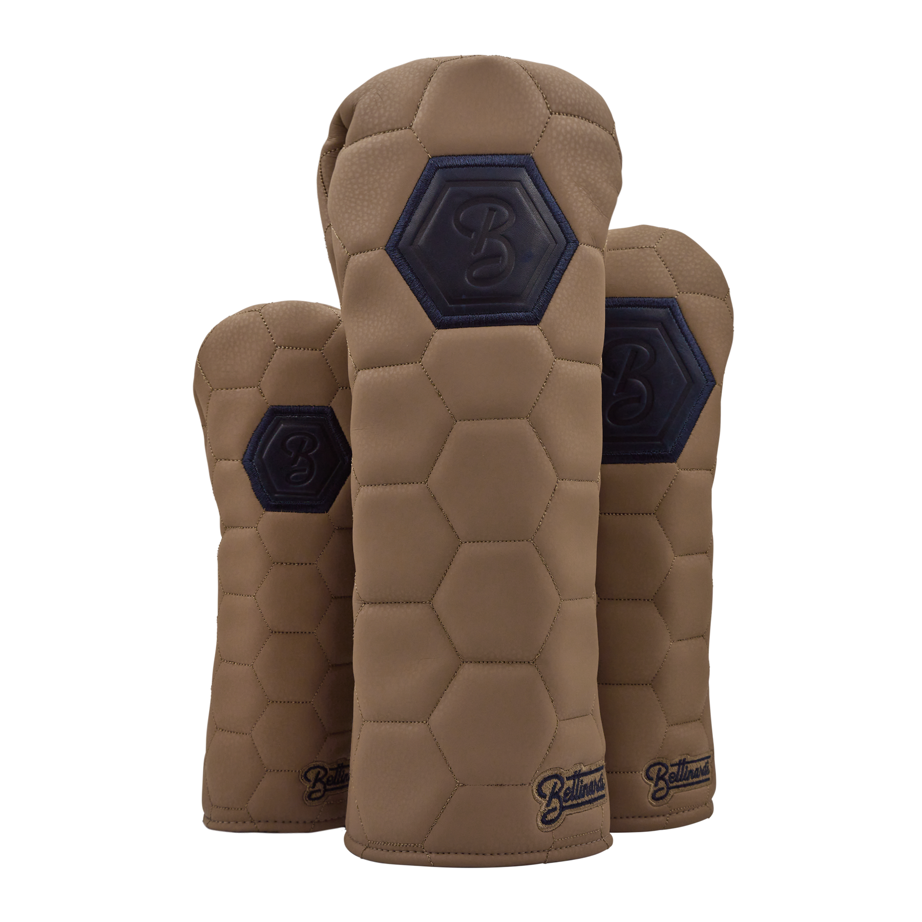 Designed for the golfer with an eye for subtle luxury, this Bettinardi Script Quilted Hex wood set features a refined tan-on-tan hexagon embroidered pattern across the front and back. The back showcases a Horween leather applique at the top along with a navy-and-tan Bettinardi script logo embroidered at the bottom. Finished with a plush black interior, this set includes options for a driver cover, 3-wood cover, or hybrid cover.