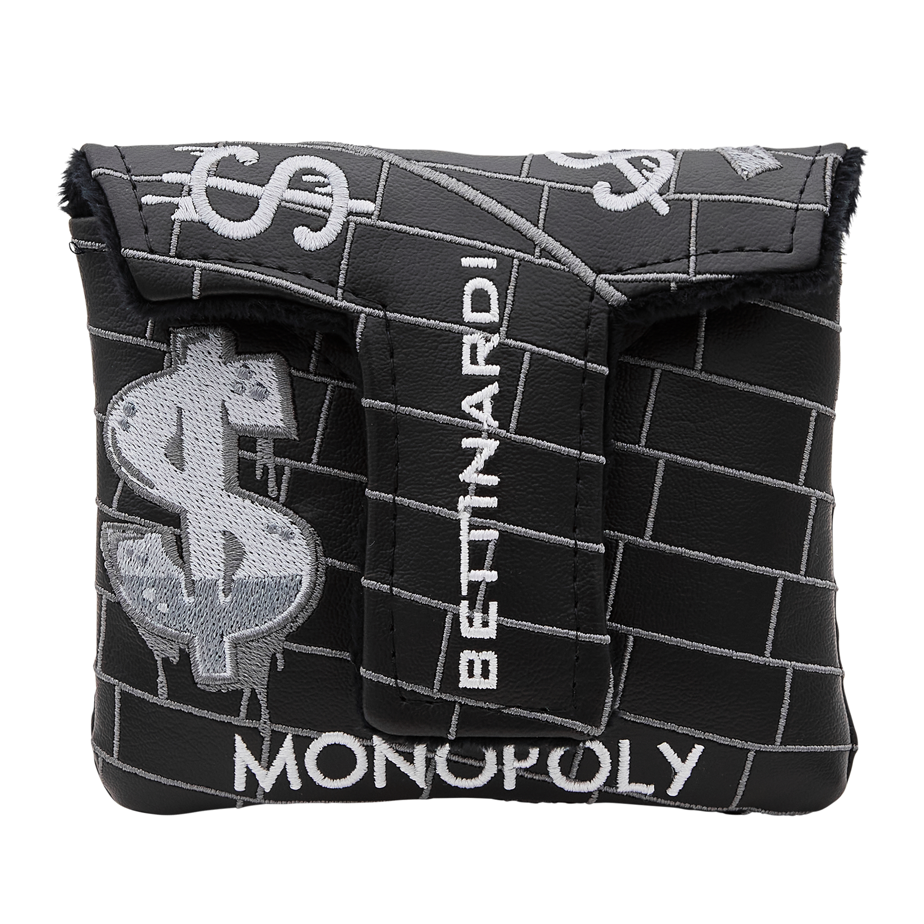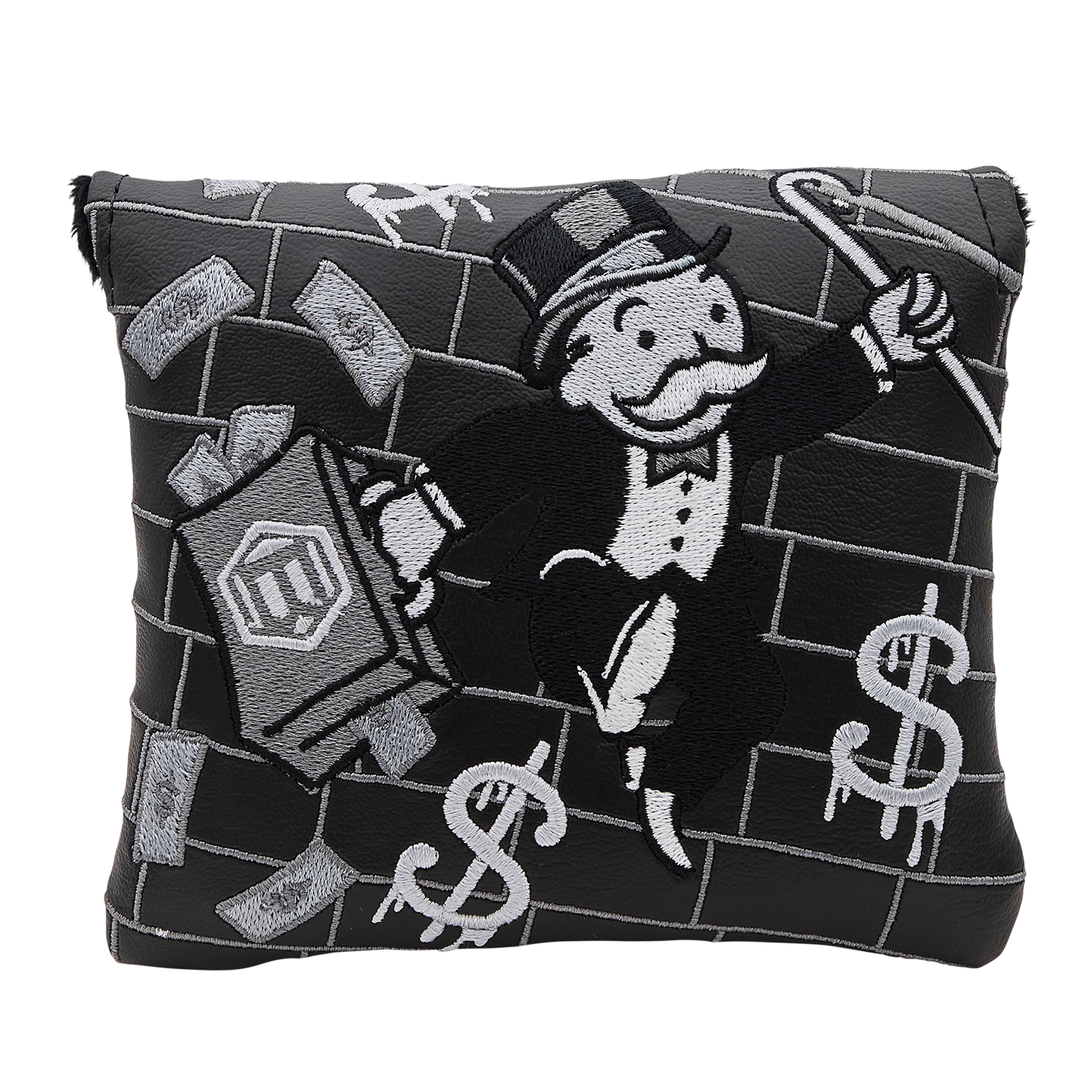 BREAKING FREE! Mr. Monopoly has just escaped Jail and is making a run for it, with his briefcase bursting with cash and eyes set on GO. This headcover features Mr. Monopoly in motion, stitched on a blackout base, styled like the classic game board and detailed with a brickwork pattern that channels pure Boardwalk flair. Finished with a black plush interior and magnetic closure, it’s your lucky Community Chest pull of the season. Don’t miss your chance, this mallet headcover is racing around the board fast. Limited quantities are available.