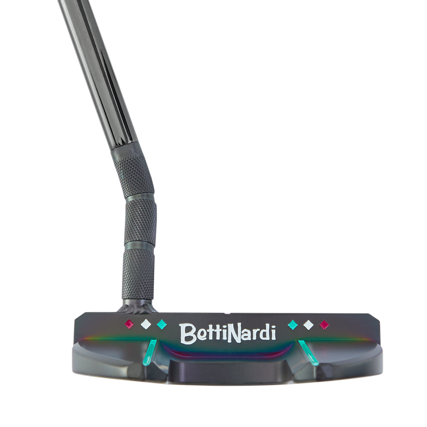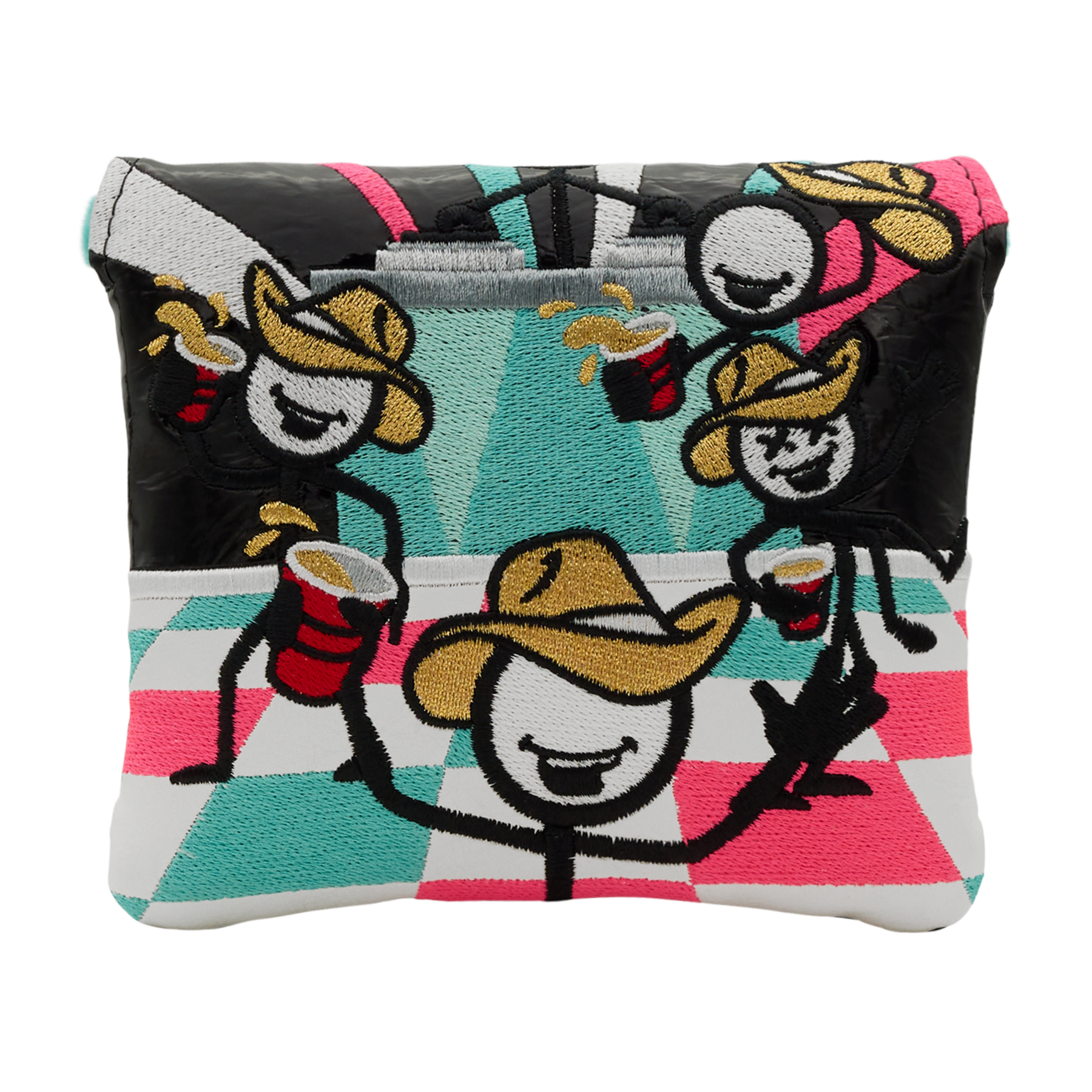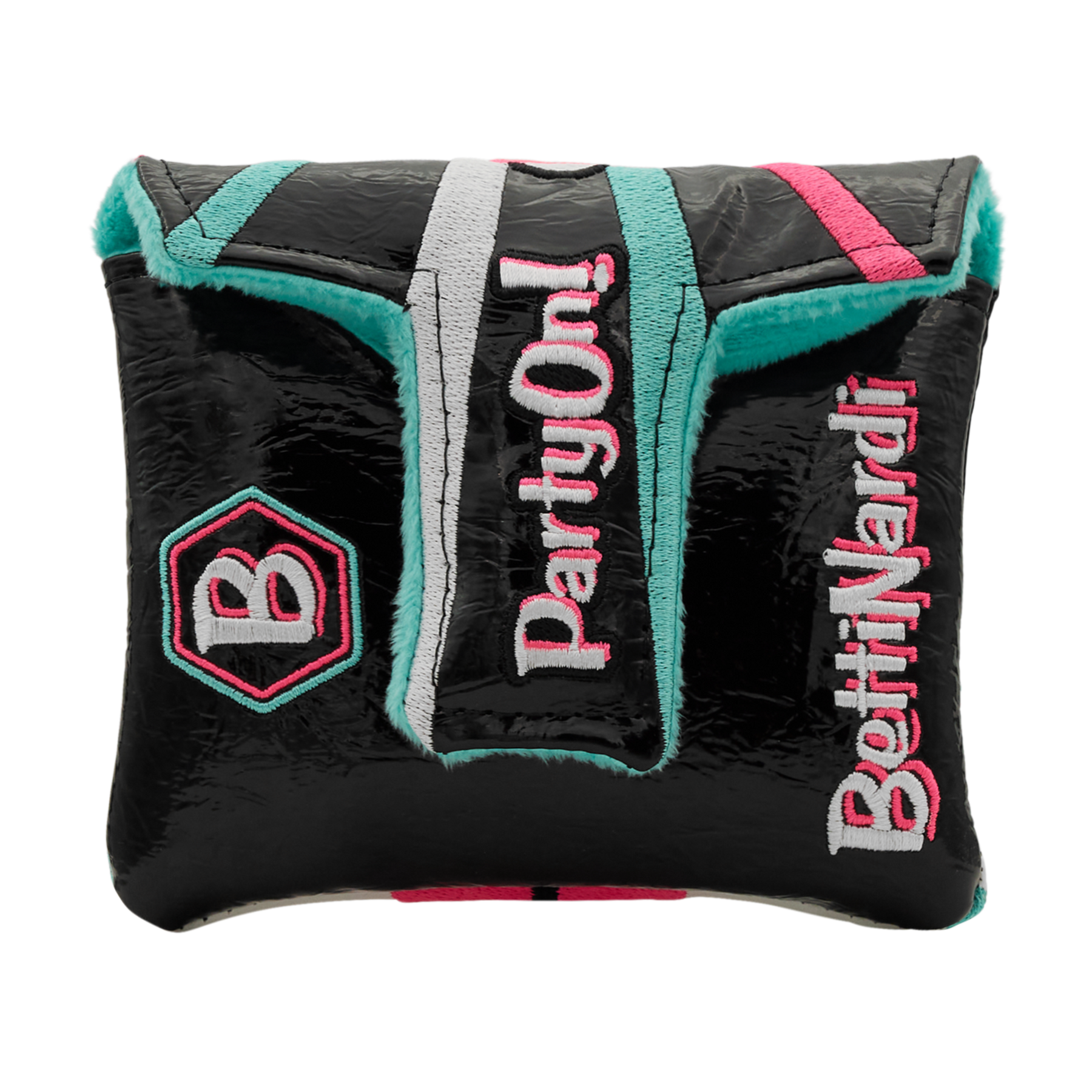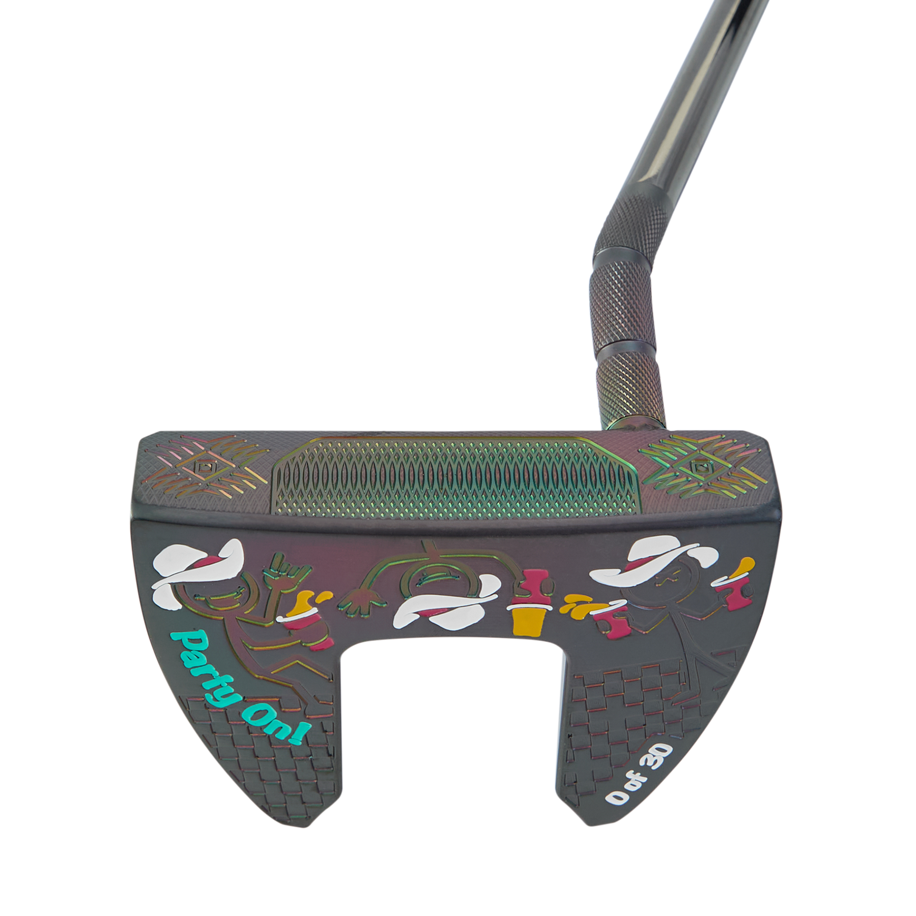 Welcome to the wild wild west! This 1-of-1 Party On!™ BB 6.0 is milled from 303SS to 380 grams and finished in a dimensional Black Rainbow PVD. The sole prominently features the Western Rabble Rousers enjoying their beverages on the dance floor, while the pocket showcases a southwestern Bettinardi wordmark. On the face F.I.T. over Flymill milling is accented by Southwestern motif engravings. Designed with a unique fancy split knurl neck, this putter boasts a single topline and double flangeline alignment. Accented with bright pink, white, sea green, and yellow paintfill, the party never ends with this putter. Comes complete with a Black PVD shaft, Bettinardi HIVE Pink Standard Grip, and a Party On!™ Disco Desert Party Mallet Putter Headcover. Limited quantities are available. Limit 1 per person, good luck!