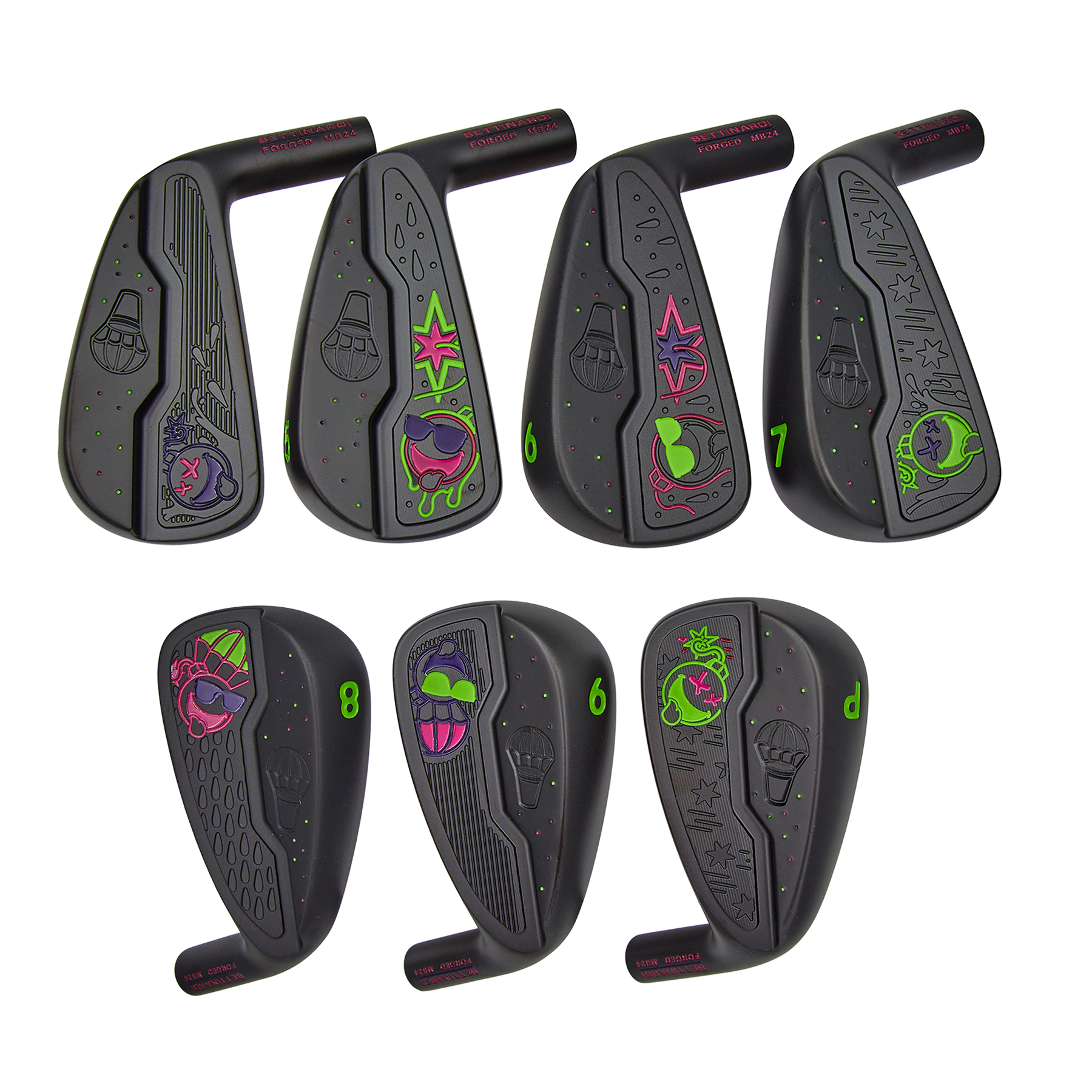 Bombs away! This Airstrike Bomb Black Ox MB24 Iron Set features engravings of the Poison and Sunglasses Bombs dropping with parachuting Transfusions™ over droplet, striped, and star-patterned backgrounds, accented in purple, green, and pink paintfills. Characterized by a thinner topline and a differential muscleback designed for precise weighting, the MB24 irons maximize control with added forgiveness in a player’s profile. These irons will ship with our True Temper DG Mid 100 S shaft and black Golf Pride Tour Velvet grip at our standard length, loft, and lie. Only one set available. Please reach out to thehive@bettinardi.com for any changes. Best of luck! These irons have a raw finish that will rust over time. They should be oiled with a light cloth each time after use.