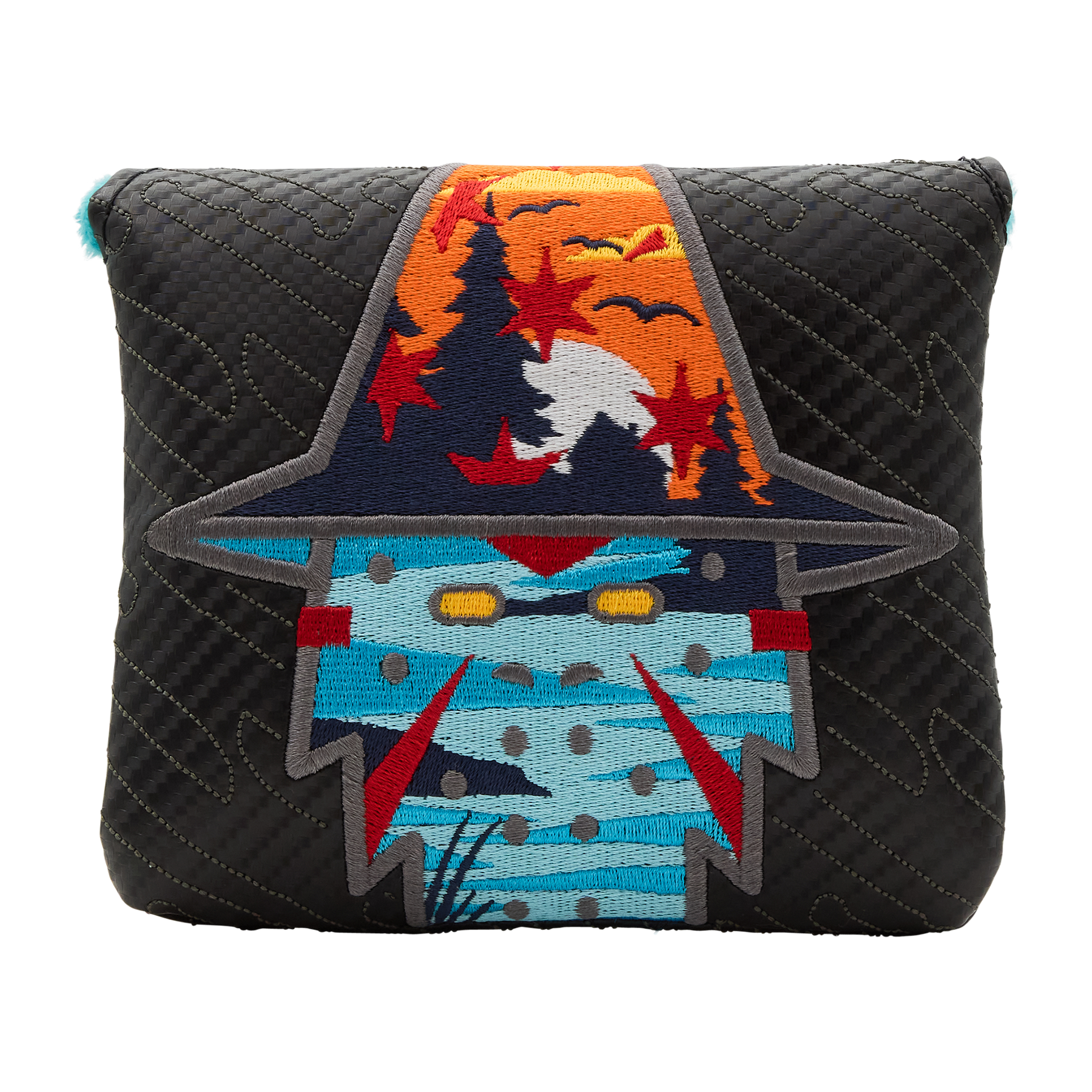 Think you can survive a night at camp? This mallet putter headcover, inspired by classic retro thriller poster art, is designed on a black carbon fiber textured base. The Masked Wizard's silhouette outlines a view of the camp across the blue lake, as the sun sets in fiery contrast against dark pine trees in the distance. The reverse side features bright red embroidered Betti the 13th and Bettinardi wordmarks and a Hex B. Completed with teal plush interior and a magnetic closure, this headcover will keep your putter safe... but you're on your own once the sun goes down. Quantities are as limited as your chance of survival. Limit 1 per person, claim if you dare!