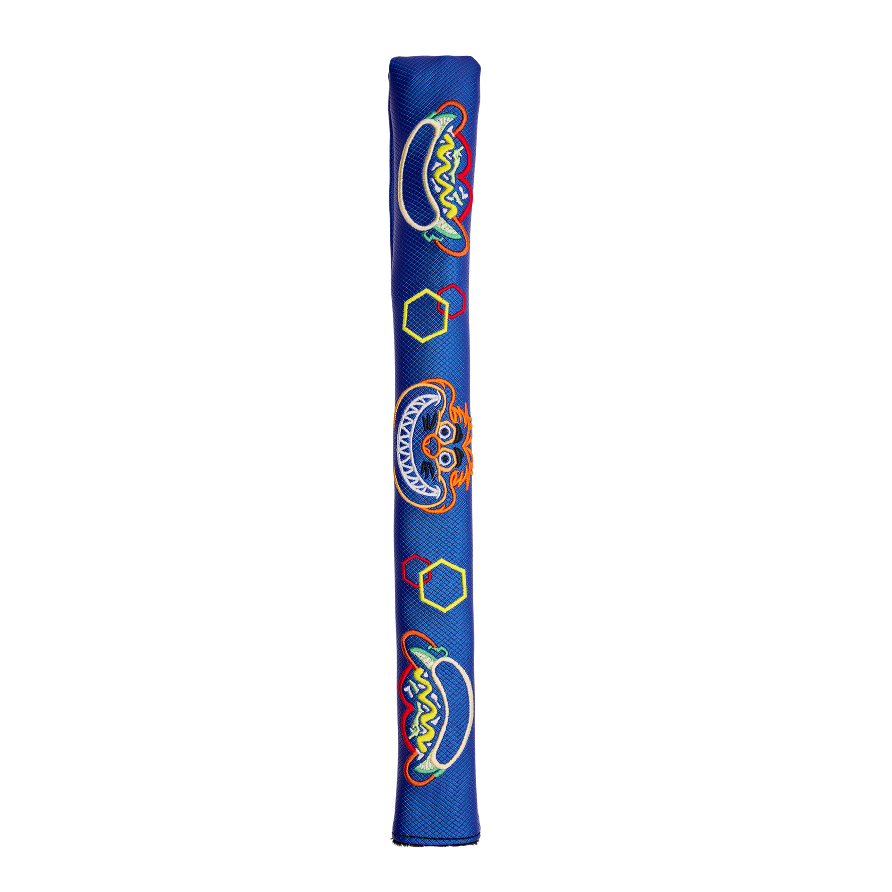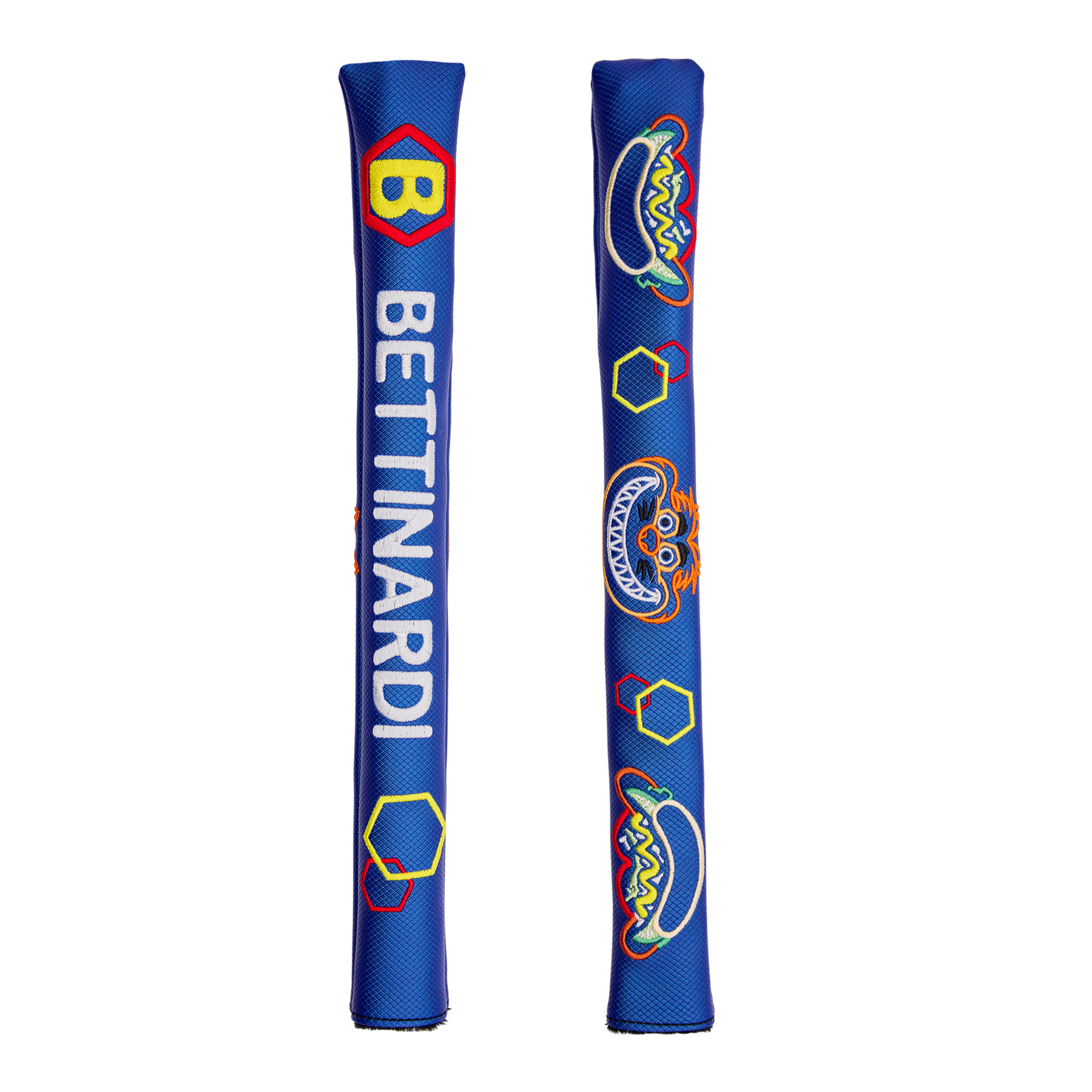This alignment stick cover features the Grail Cat, floating red and yellow Hex Bs and the iconic Chicago dog outlines embroidered over a blue textured base. The backside displays a Bettinardi wordmark and red and yellow Hex B. Finished with a black plush interior, this alignment stick cover will add the perfect touch of flavor to your bag. Limited quantities are available. Limit 1 per person! Good Luck!