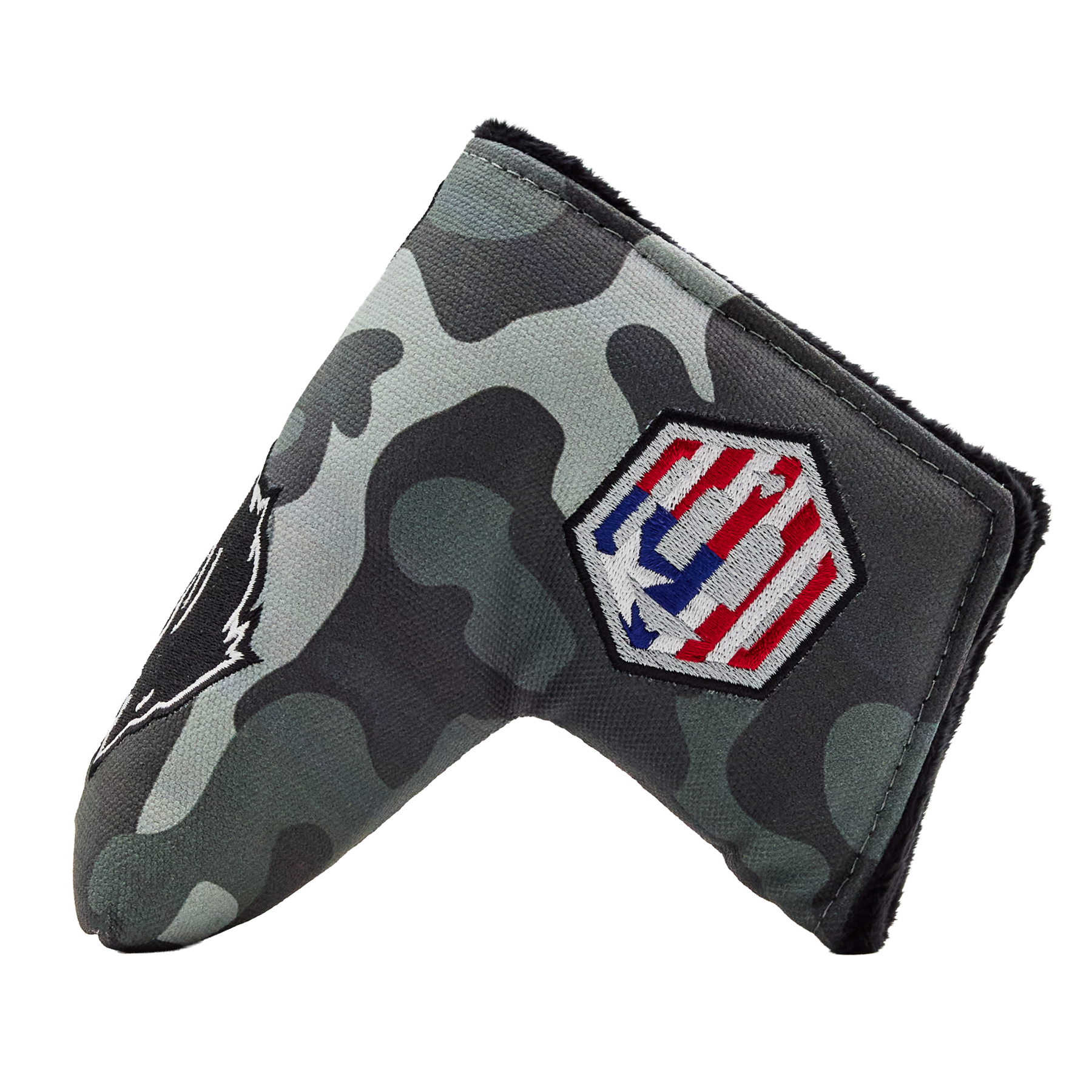 Show your teams loyalty with the Detroit Lions Camo Blade Putter Headcover! Designed on a dark gray camo canvas featuring the Lions logo on front and American Hex B on the side. Finished with a black plush interior and magnetic closure. Limit 1 per person. Good luck!