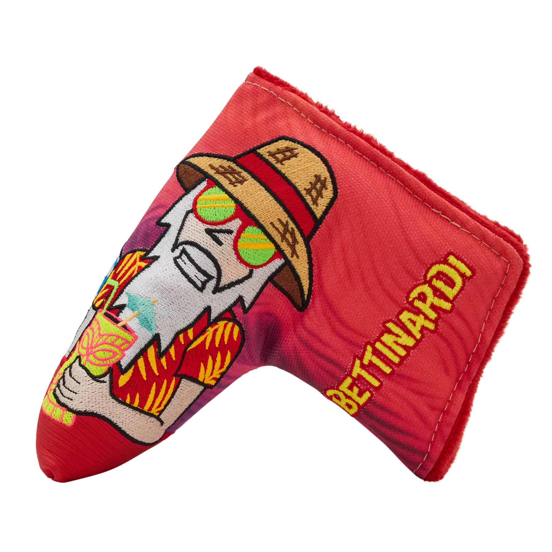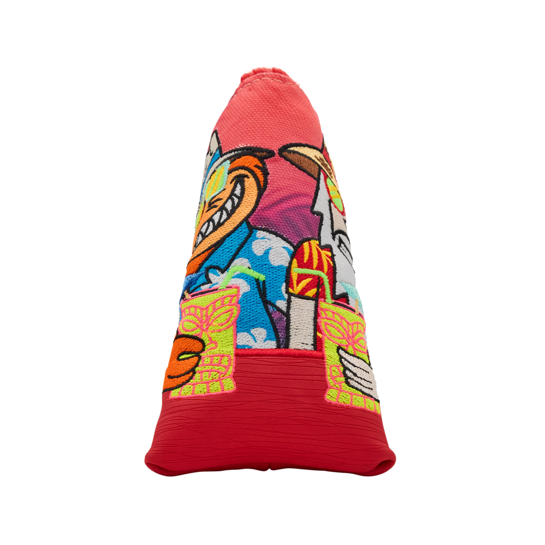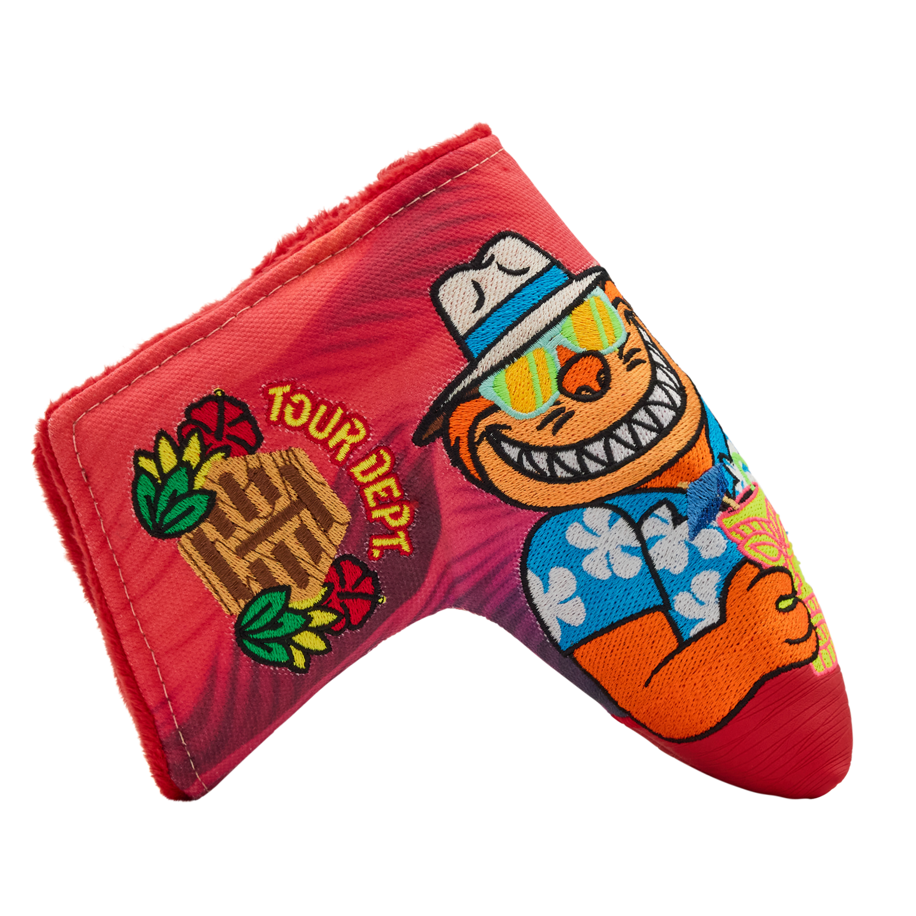 It's 5 o'clock somewhere! This FAI blade putter headcover features the Fat Cat and Wizard chilled out enjoying some rest and relaxation, embroidered onto a red sunset background. One side features a tiki-themed Bettinardi wordmark embroidered in red and yellow, while the opposite features a tropical Tour Dept. logo. Finished with a red plush interior, this headcover is designed to keep your putter protected and bring a pop of island flair to your bag. Only 1 available, good luck!