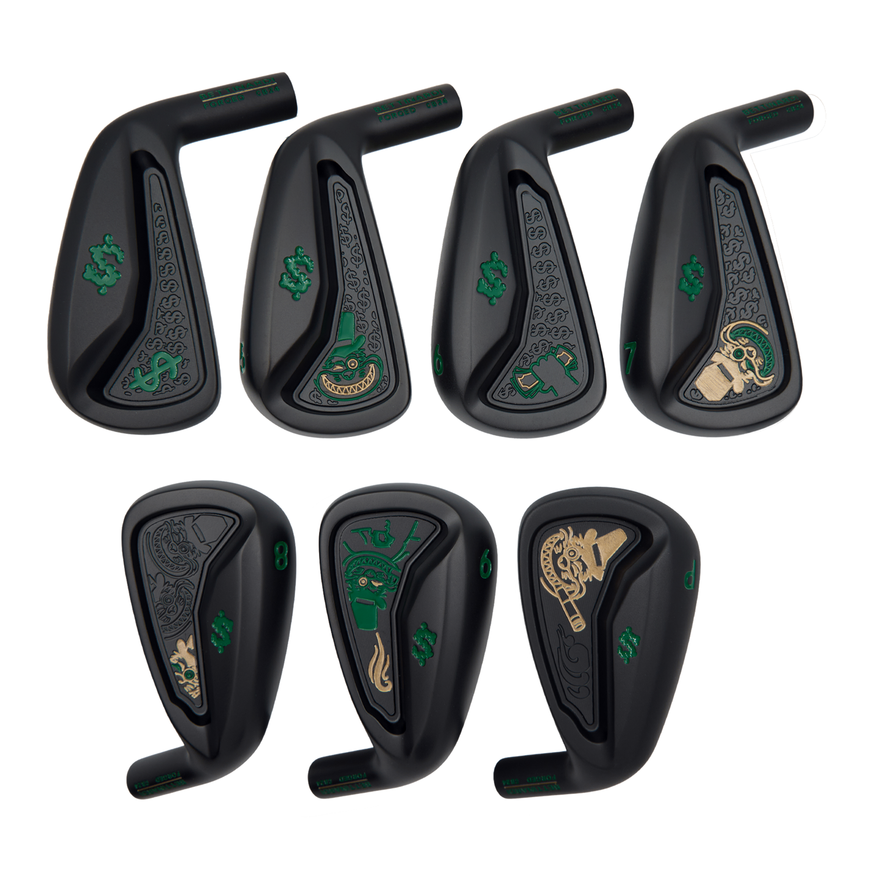 This Matte Black PVD CB24 set features our Gangster Cat with his two essentials: his cigar and a fistful of dollar bills, accented in green and gold paintfills. Crafted for the ultimate playability, the CB24 irons combine modern engineering with classic design. For those who demand both accuracy and distance, these irons seamlessly blend a traditional forged feel with innovative technology. Characterized by an optimal progressive cavity and perimeter weighting for maximum MOI, the CB24 irons strike a perfect balance of distance and forgiveness. These irons will ship with our True Temper DG Mid 100 S shaft and black Golf Pride Tour Velvet grip at our standard length, loft, and lie. Only one set available. Please reach out to thehive@bettinardi.com for any changes. Best of luck!