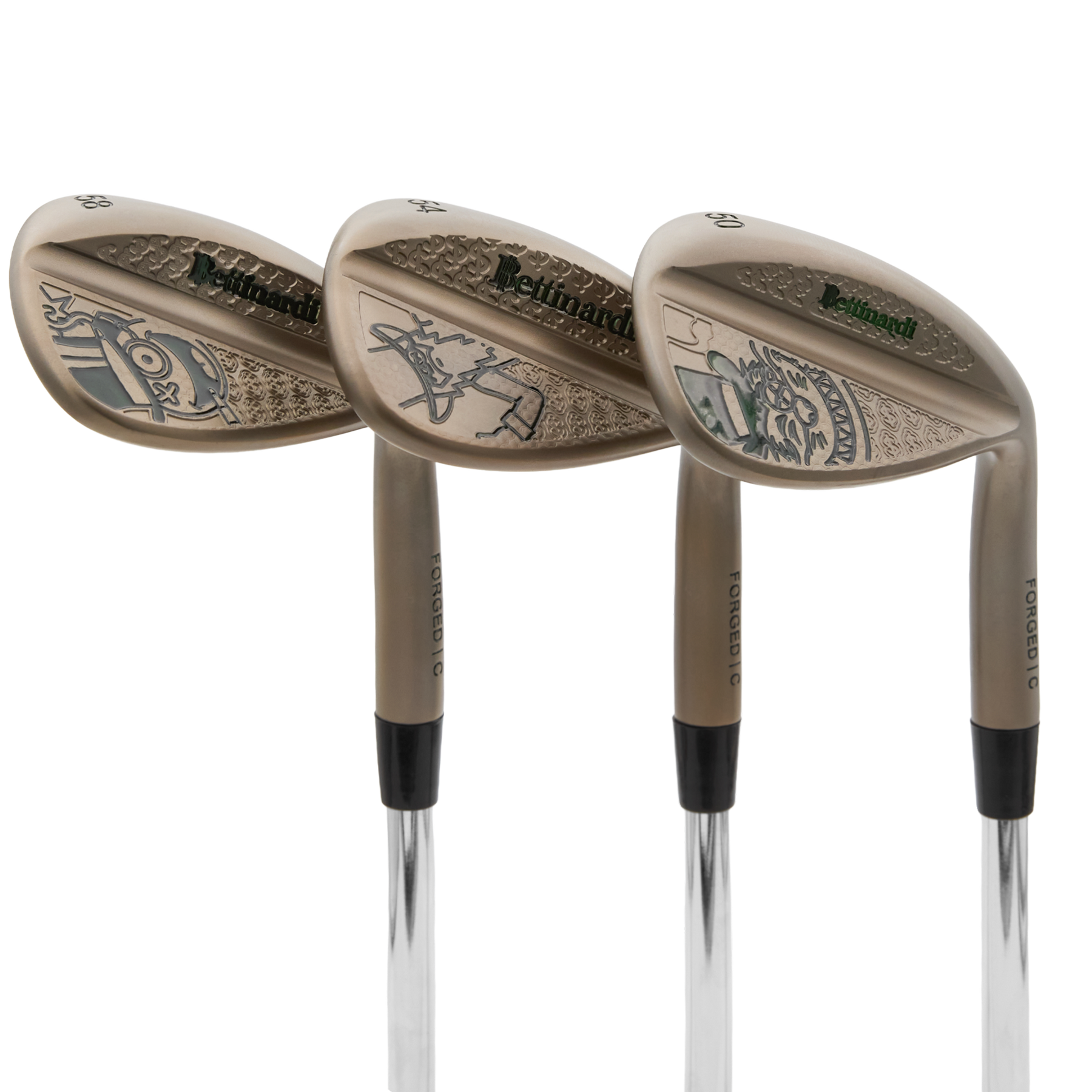 On this wedge set, the gang's all here. These HLX 6.0 wedges feature the Gangster Wizard, Cat, and Bomb engraved over a stamped money sign pattern. Showcased in our Gold Flame finish accented with black paintfills, this C-grind wedge set includes 50°, 54°, and 58° lofts. Limited quantities are available. Limit 1 per person. Good luck!