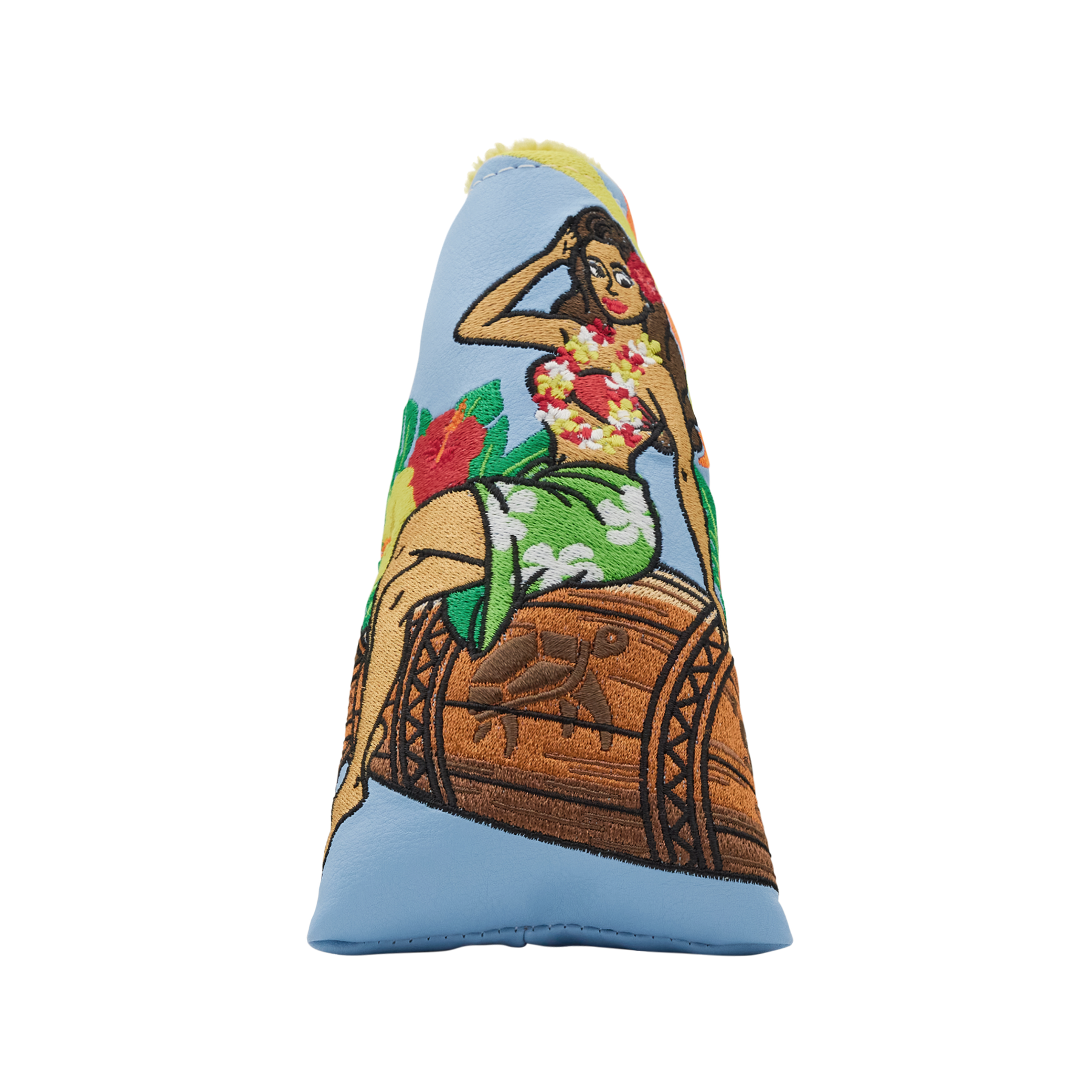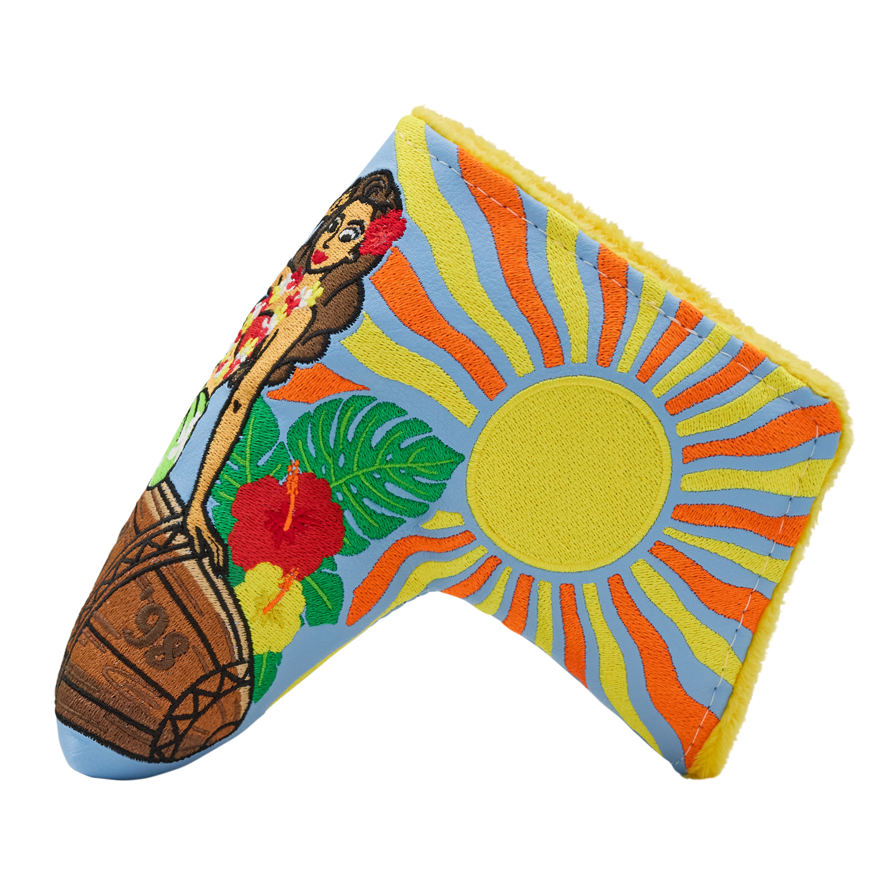 Aloha! On this headcover, the Betti Bomber is embroidered over a light blue base, lei'd back and soaking up the sun on her tiki wood bomb. The side is finished with an orange hibiscus Hex B and Bettinardi wordmark and finished with a yellow plush interior with a magnetic closure. This headcover is designed to keep your putter safe on and off every green, and bring some tropical charm to your bag! Limited quantities are available. Limit 1 per person, good luck!