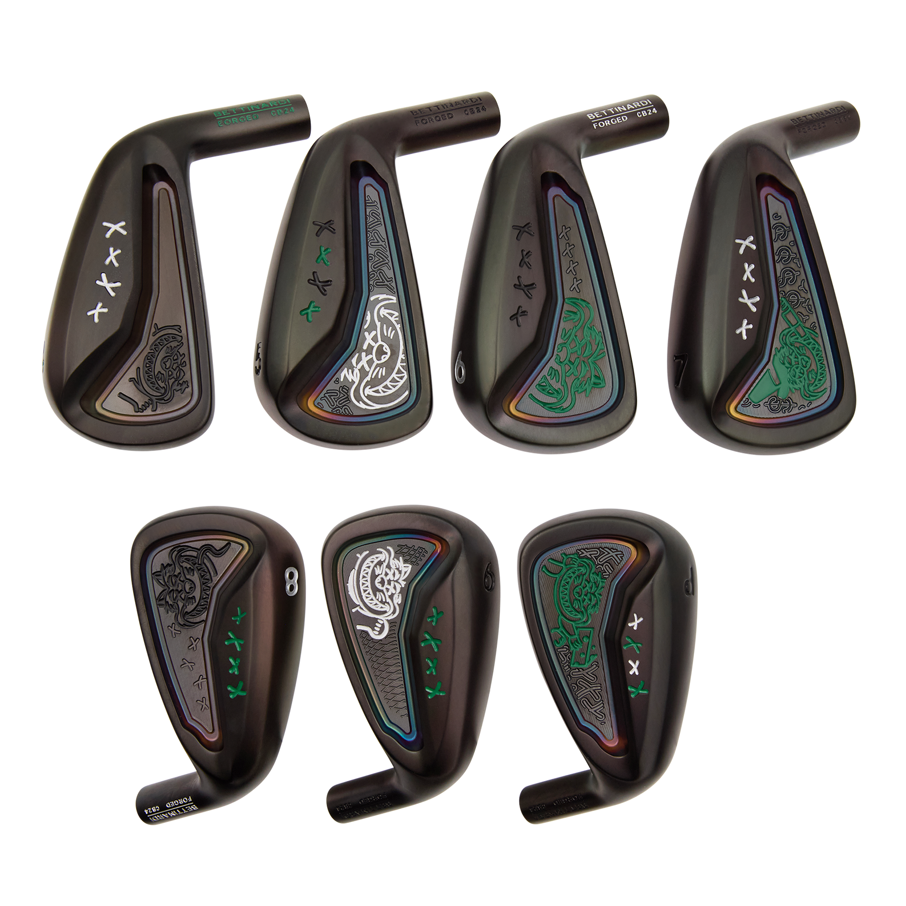 This Multi Poison Fat Cat Black Rainbow PVD CB24 Iron Set features engravings of the many faces of the Poison Fat Cat with poison X's and dollar sign patterns, accented with silver, green, and black paintfill. Crafted for the ultimate playability, the CB24 irons combine modern engineering with classic design. For those who demand both accuracy and distance, these irons seamlessly blend a traditional forged feel with innovative technology. Characterized by an optimal progressive cavity and perimeter weighting for maximum MOI, the CB24 irons strike a perfect balance of distance and forgiveness. These irons will ship with our True Temper DG Mid 100 S shaft and black Golf Pride Tour Velvet grip at our standard length, loft, and lie. Please reach out to thehive@bettinardi.com for any changes. Limited quantities are available. Limit 1 per person. Good luck!