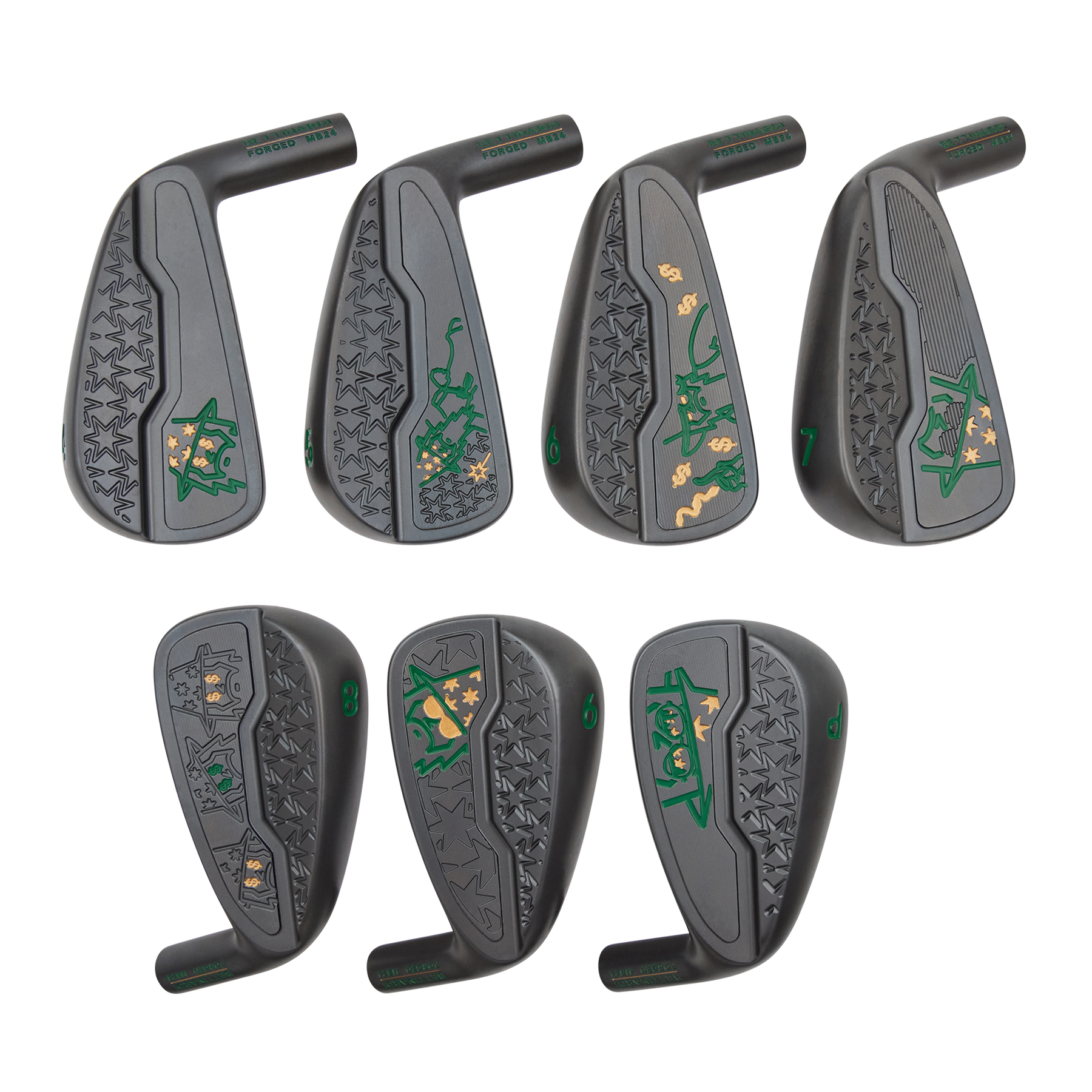 This Multi Wizard Black Ox MB24 Iron Set features engravings of the many faces of the Windy City Wizard accented with green and gold paintfills and embellished with a star pattern. Characterized by a thinner topline and a differential muscleback designed for precise weighting, the MB24 irons maximize control with added forgiveness in a player’s profile. These irons will ship with our True Temper DG Mid 100 S shaft and black Golf Pride Tour Velvet grip at our standard length, loft, and lie. Please reach out to thehive@bettinardi.com for any changes. Limited quantities are available. Limit 1 per person. Good luck! These irons have a raw finish that will rust over time. They should be oiled with a light cloth each time after use.