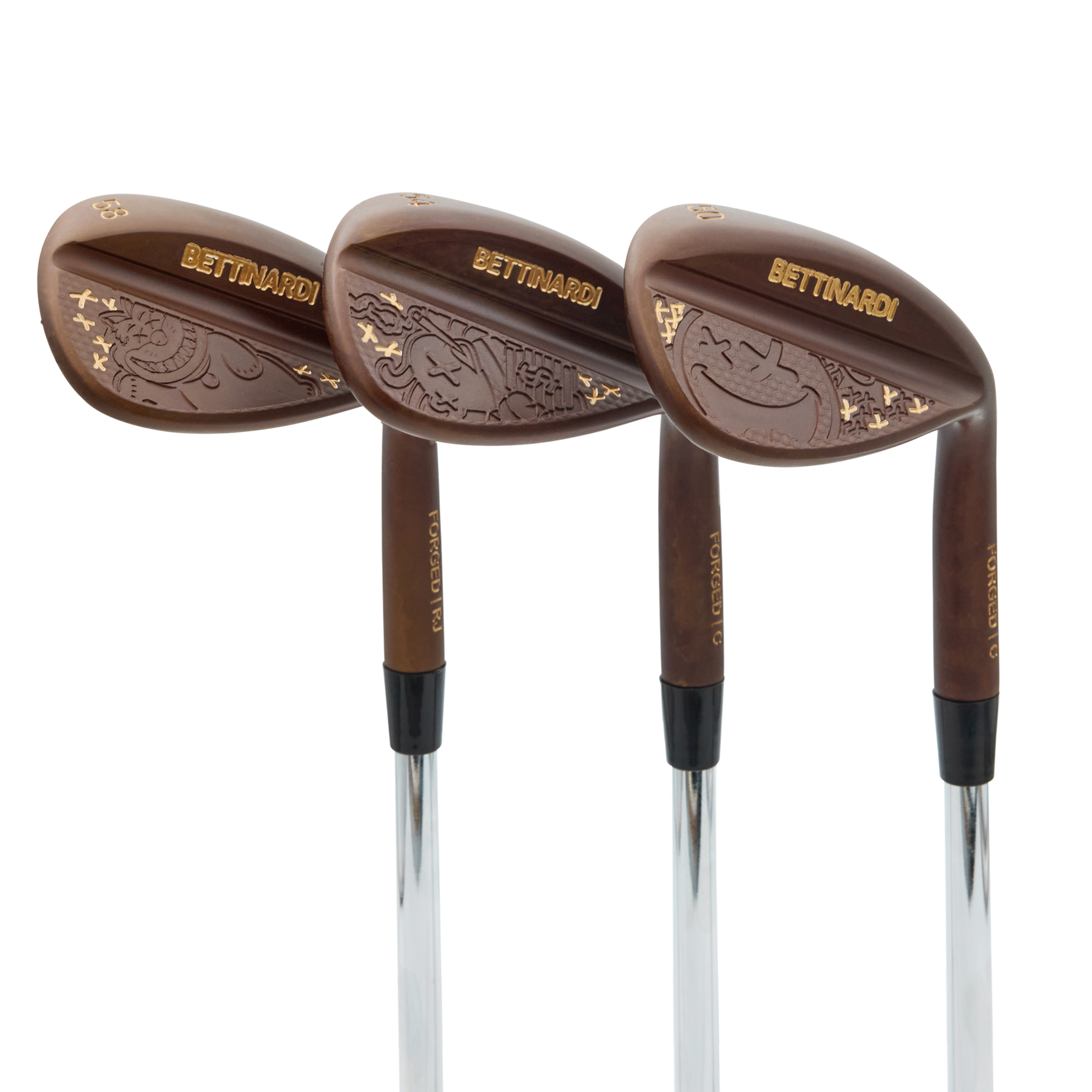 Look dangerous (but play nice) with this set! These HLX 6.0 wedges feature the Poison Bomb, Stinger, and Cat engravings. Finished with gleaming Japanese Bronze and metallic gold paintfills, this multi-grind wedge set includes 50°, 54°, and 58° lofts. Limited quantities are available. Limit 1 per person. Good luck!