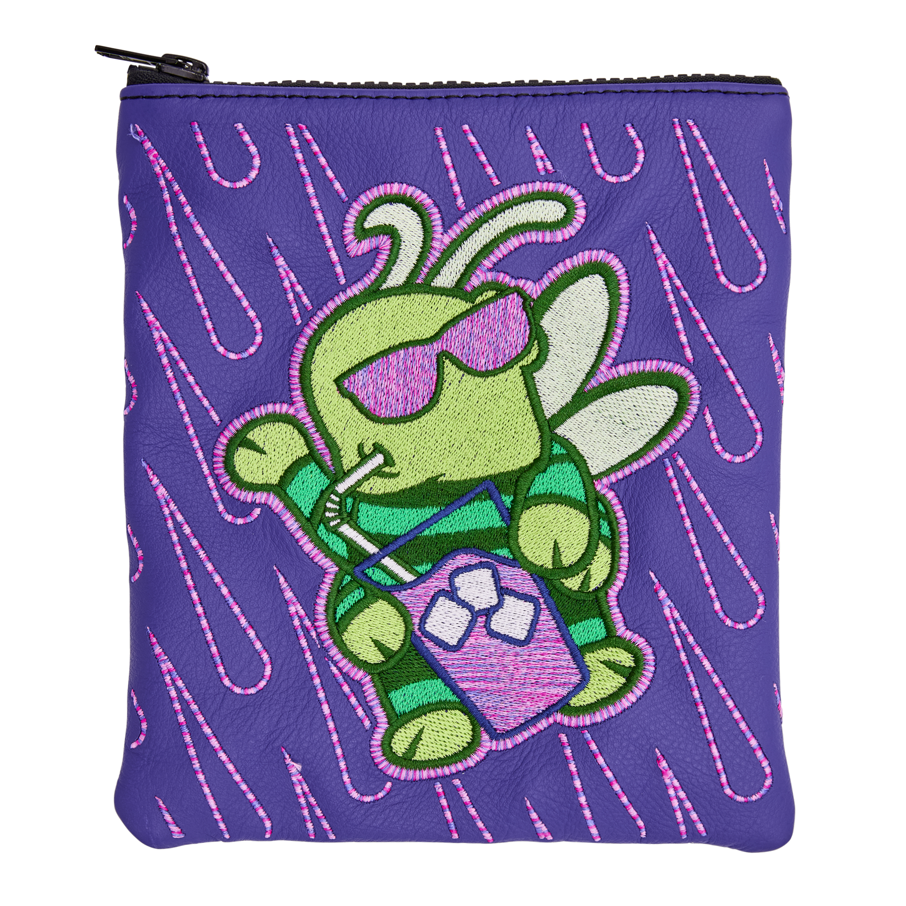 The Lucky Stinger's favorite beverage is a Transfusion™ of course! This valuables pouch features our Lucky Stinger sipping on a delicious golf course beverage in a purple and green colorway. Stitched on a leather base and finished with a black plush interior and a zipper closure, this valuables pouch is sure to keep your items secure on and off the course. Limited quantities are available. Limit 1 per person. Good luck!