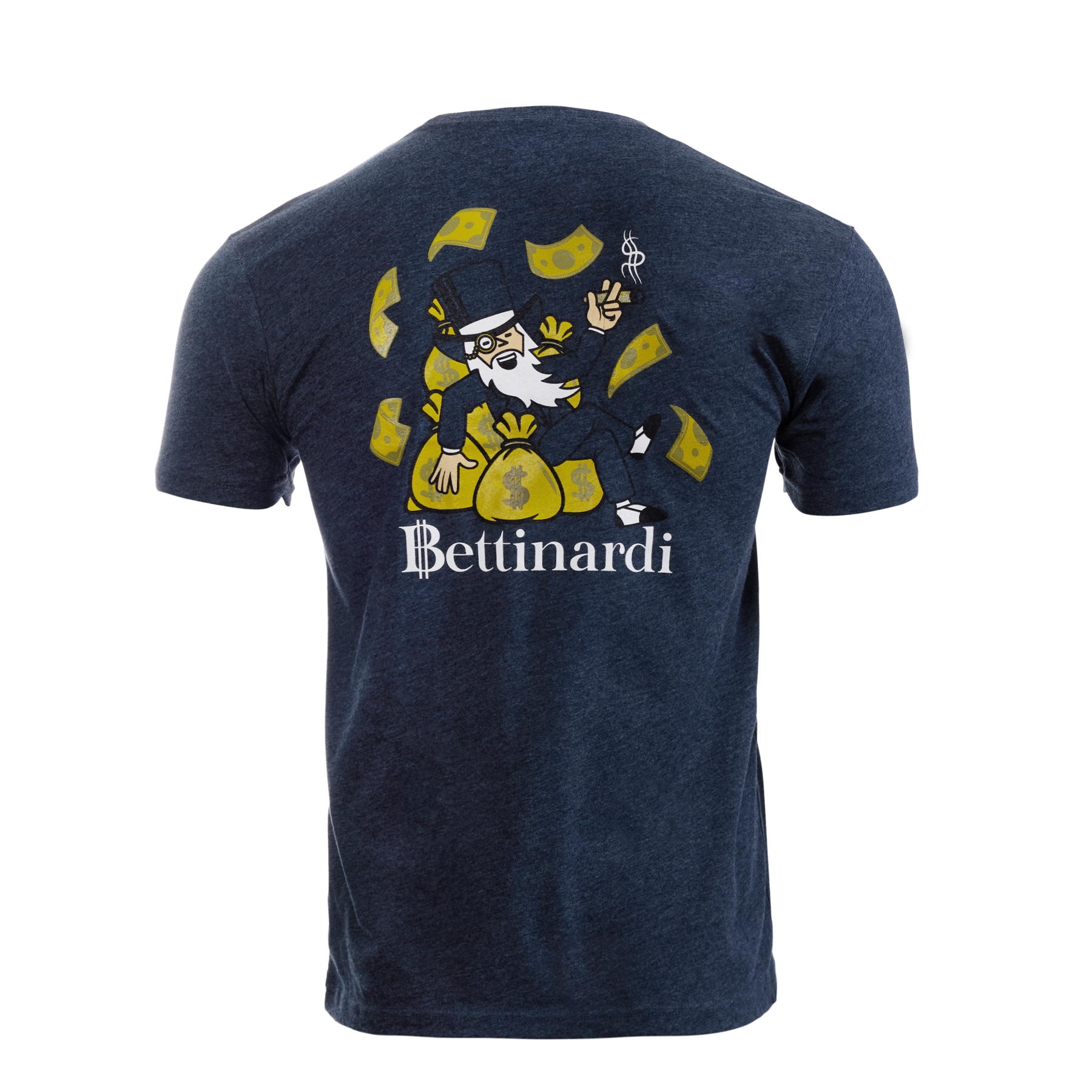 Rake it up! This navy blue T-shirt features the Wall Street Hex B on the front left chest, while the back features the Moneybags Wizard with piles of cash and a Bettinardi wordmark. Limited quantities are available. Limit 1 per person, good luck! (60% combed ringspun Cotton, 40% Polyester)