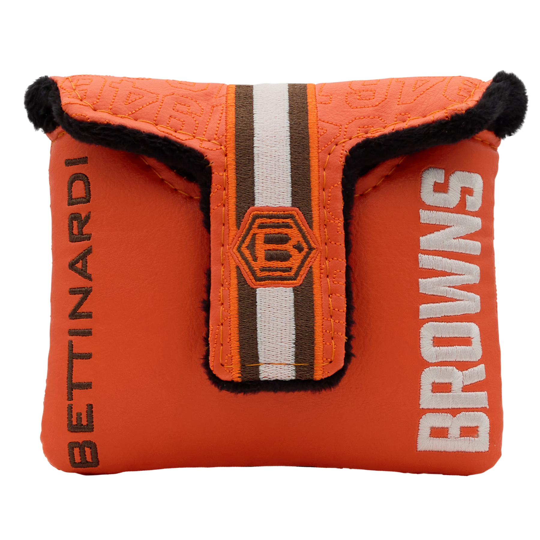Our throwback Cleveland Browns mallet headcover showcases the classic mark on the front with "Browns" and a Hex B in the center on the back, with white and brown accent wordmarks. Finished with a black plush interior and a magnetic closure, this mallet headcover protects your putter while showcasing your Cleveland Browns pride on every green. Limited quantities available.