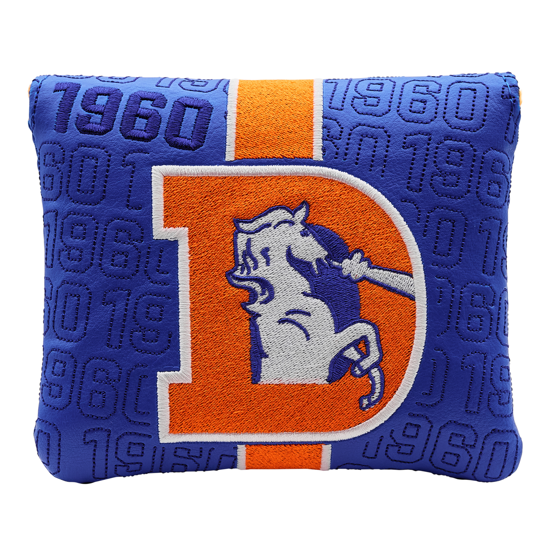 Our throwback Denver Broncos mallet headcover showcases the classic mark on the front with "Denver Broncos" and a Hex B in the center on the back, with white accent wordmarks. Finished with a orange plush interior and a magnetic closure, this mallet headcover protects your putter while showcasing your Denver Broncos pride on every green. Limited quantities available.