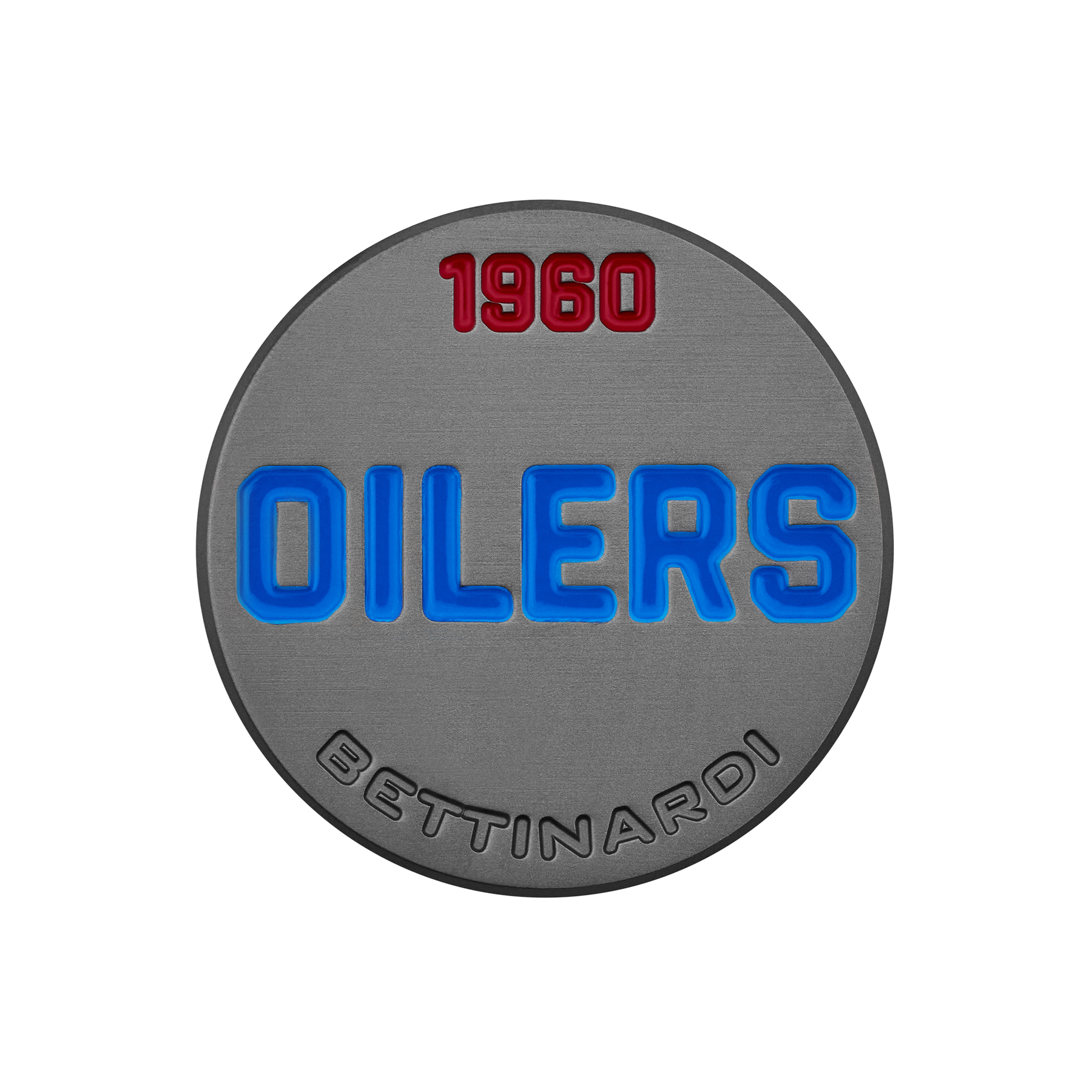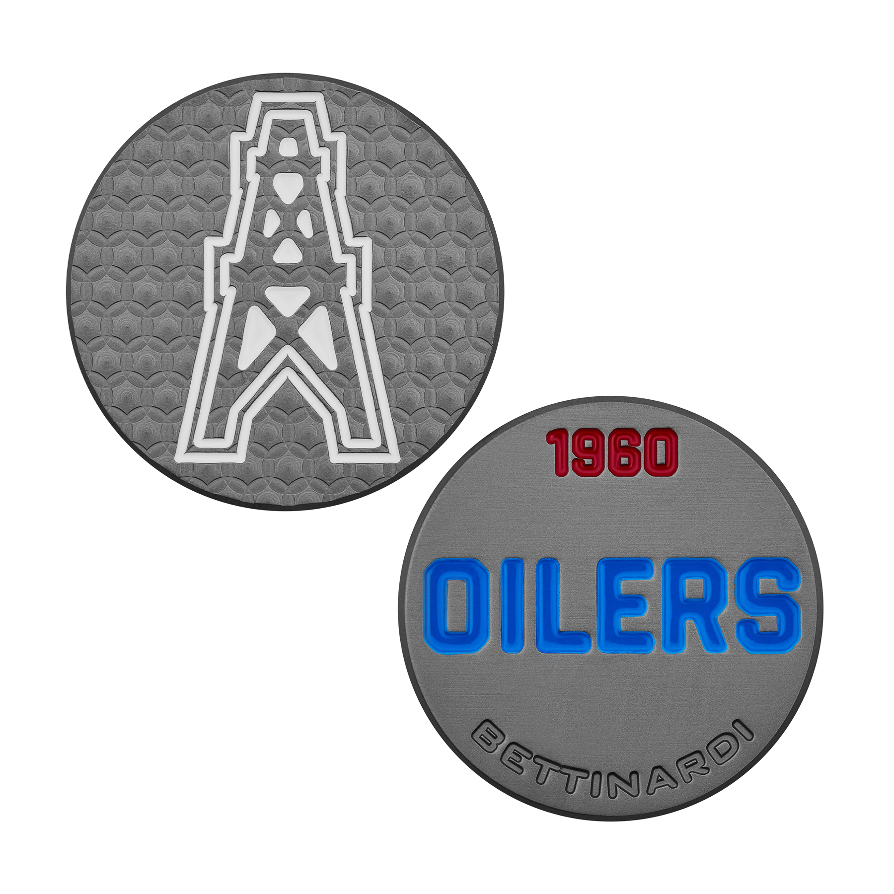 This throwback Houston Oilers classic mark is finished in Black Ox and milled over Micro Honeycomb™ on the front in white, with a Houston Oilers wordmark on the backside in blue and red paint fills. Limited quantities are available.