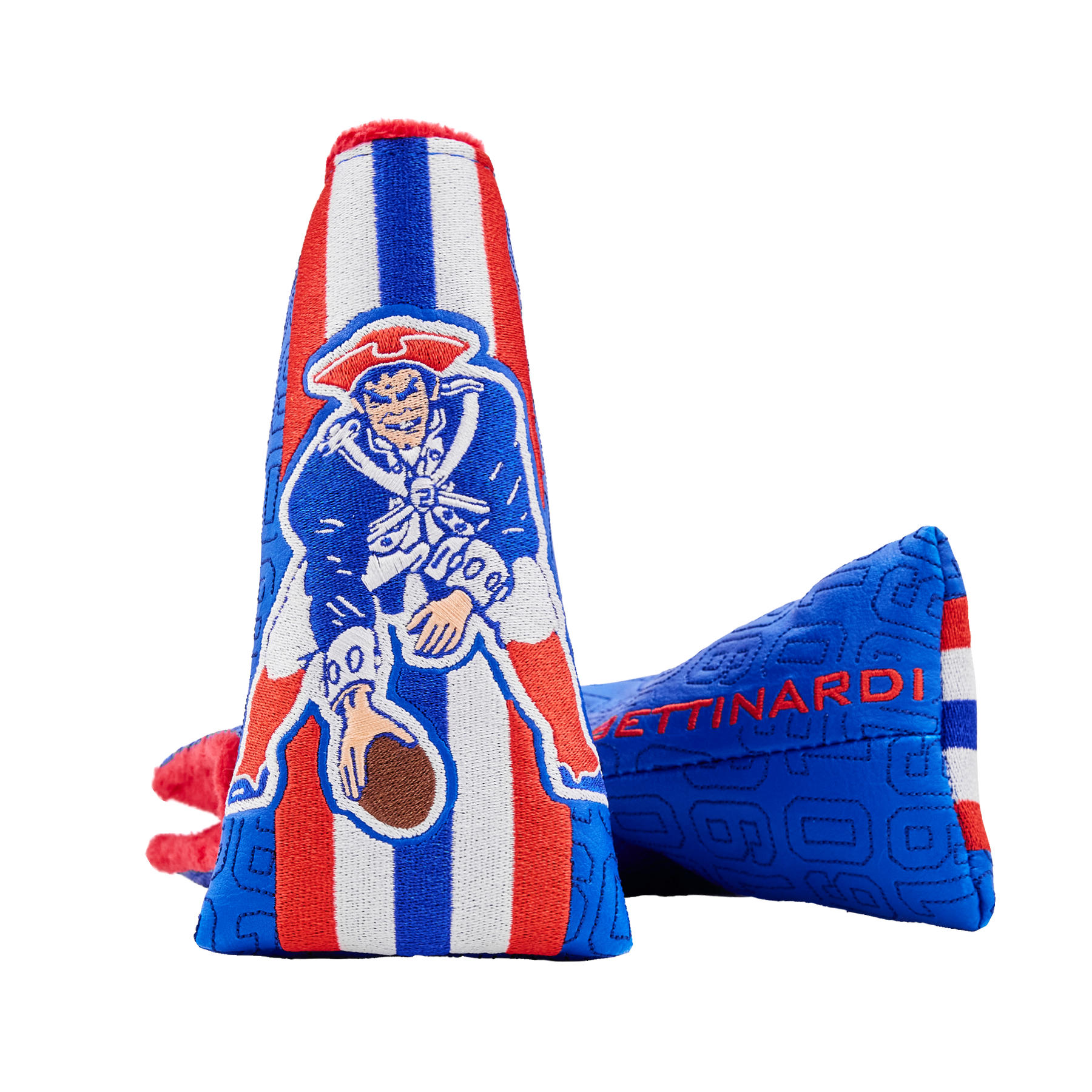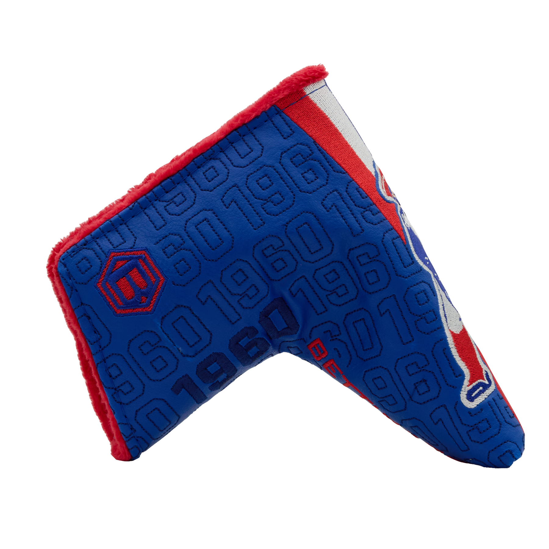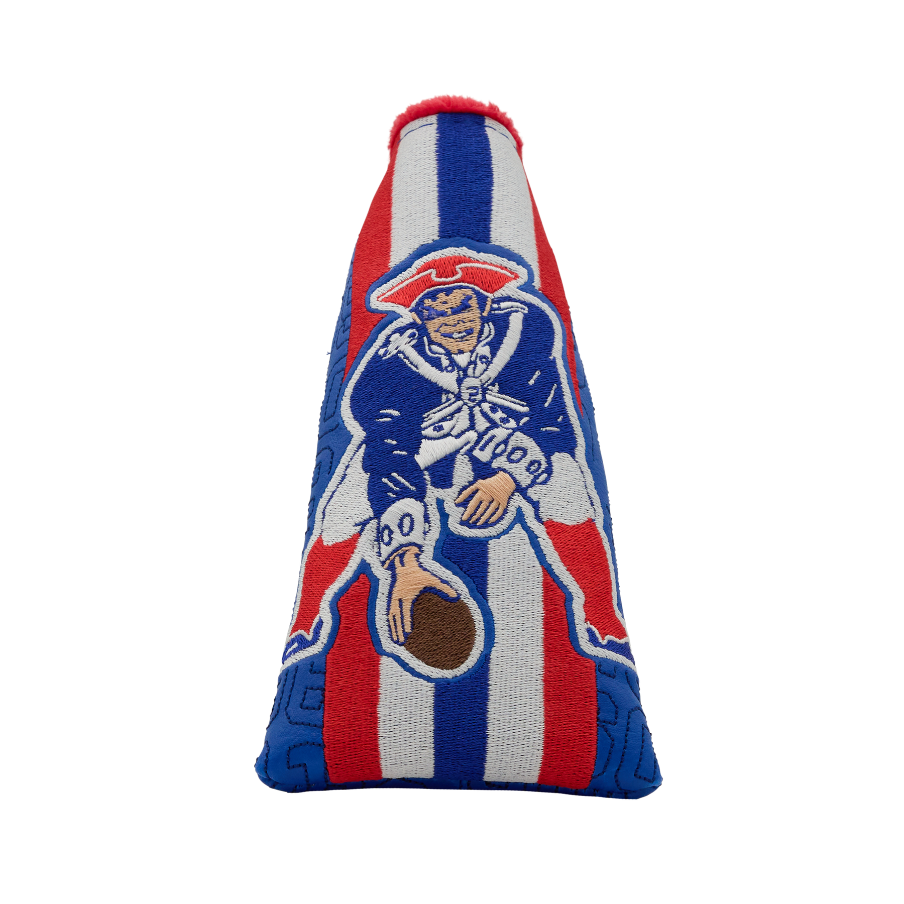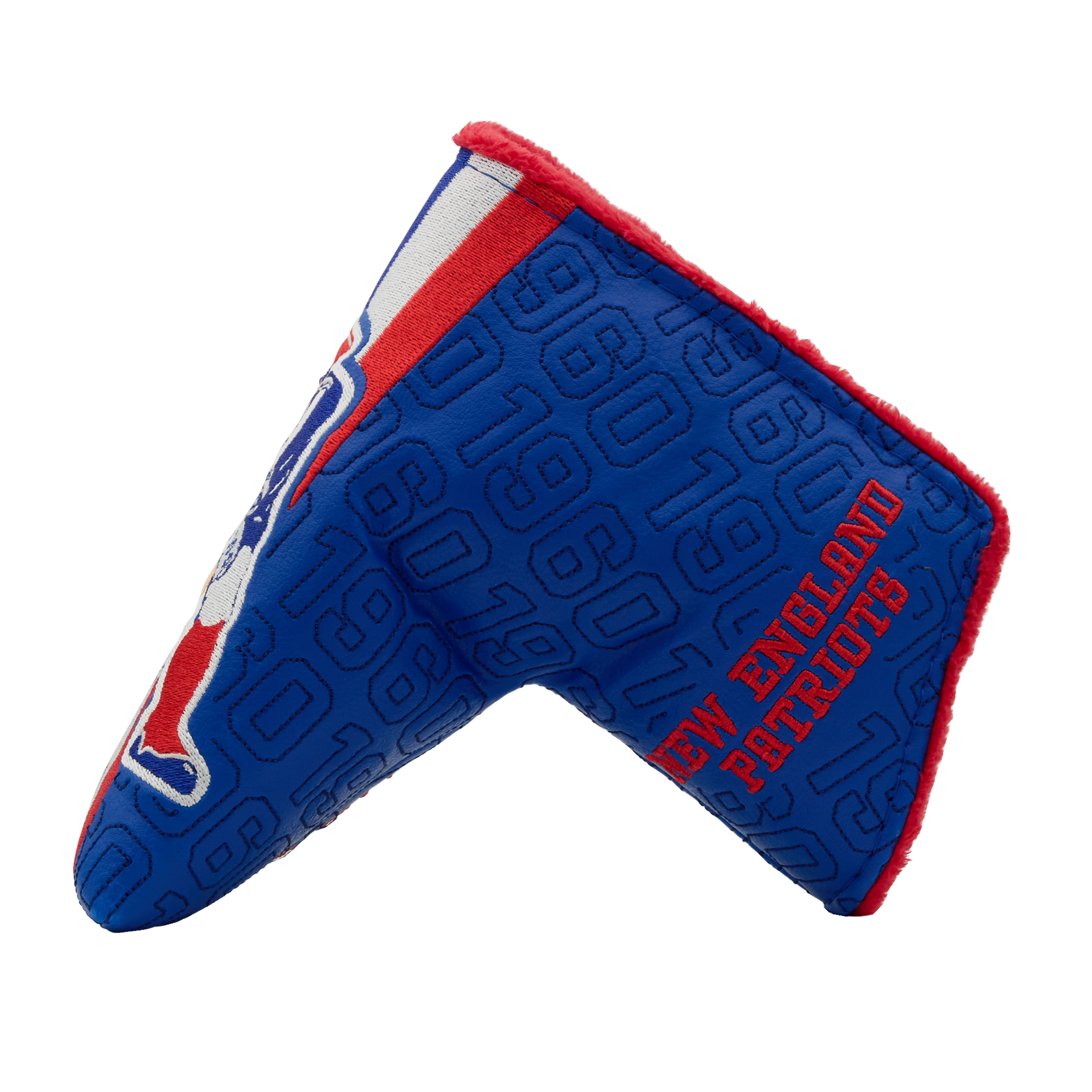 Our throwback New England Patriots blade headcover showcases the classic mark on the front with "New England Patriots" on the side and a Hex B on the opposite side, with red accent wordmarks. Finished with a red plush interior and a magnetic closure, this blade putter headcover protects your putter while showcasing your New England Patriots pride on every green. Limited quantities available.
