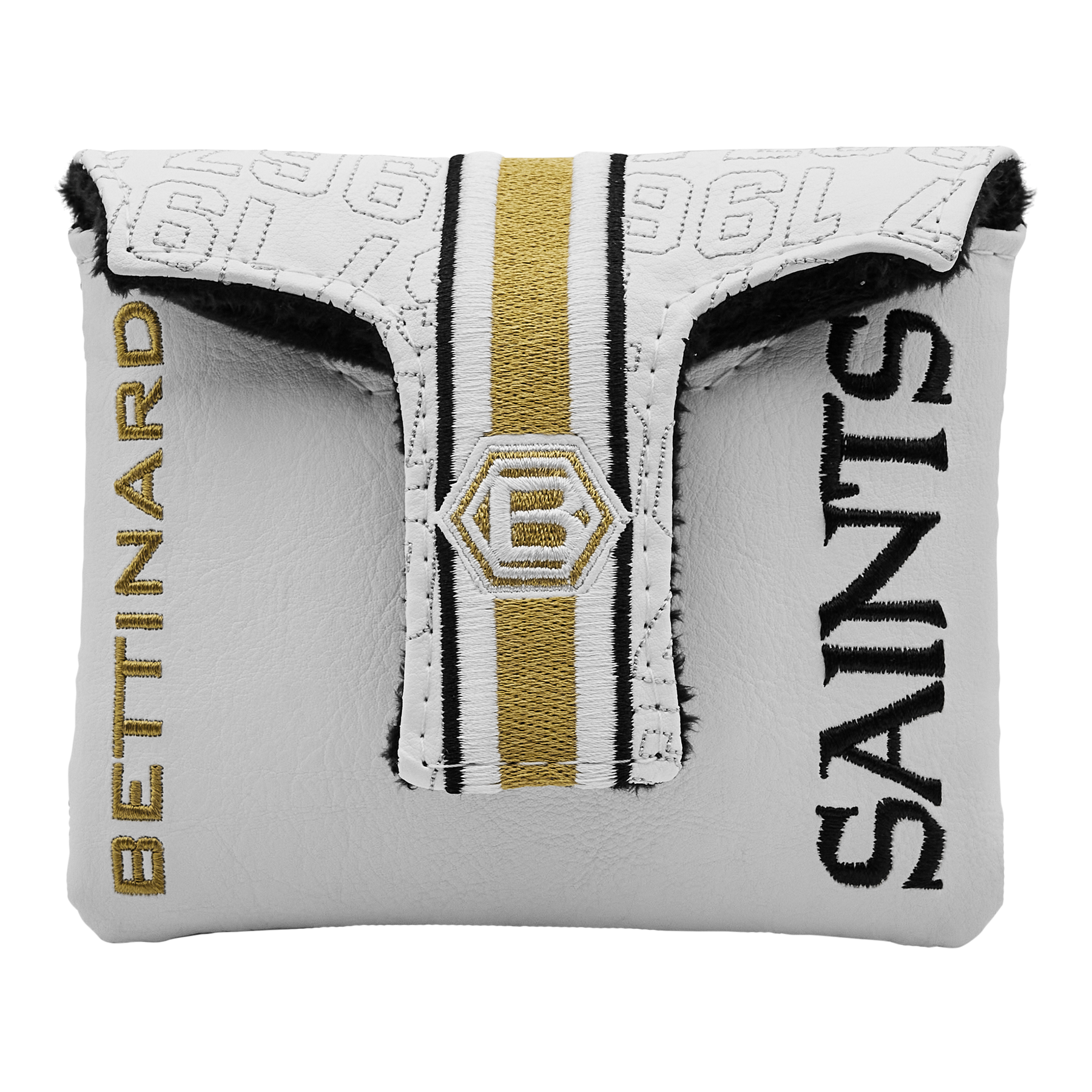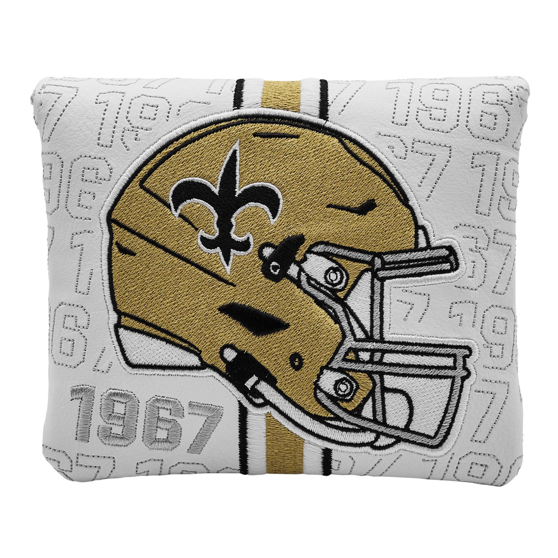 Our throwback New Orleans Saints mallet headcover showcases the classic helmet on the front with "Saints" and a Hex B in the center on the back, with white accent wordmarks. Finished with a black plush interior and a magnetic closure, this mallet headcover protects your putter while showcasing your New Orleans Saints pride on every green. Limited quantities available.