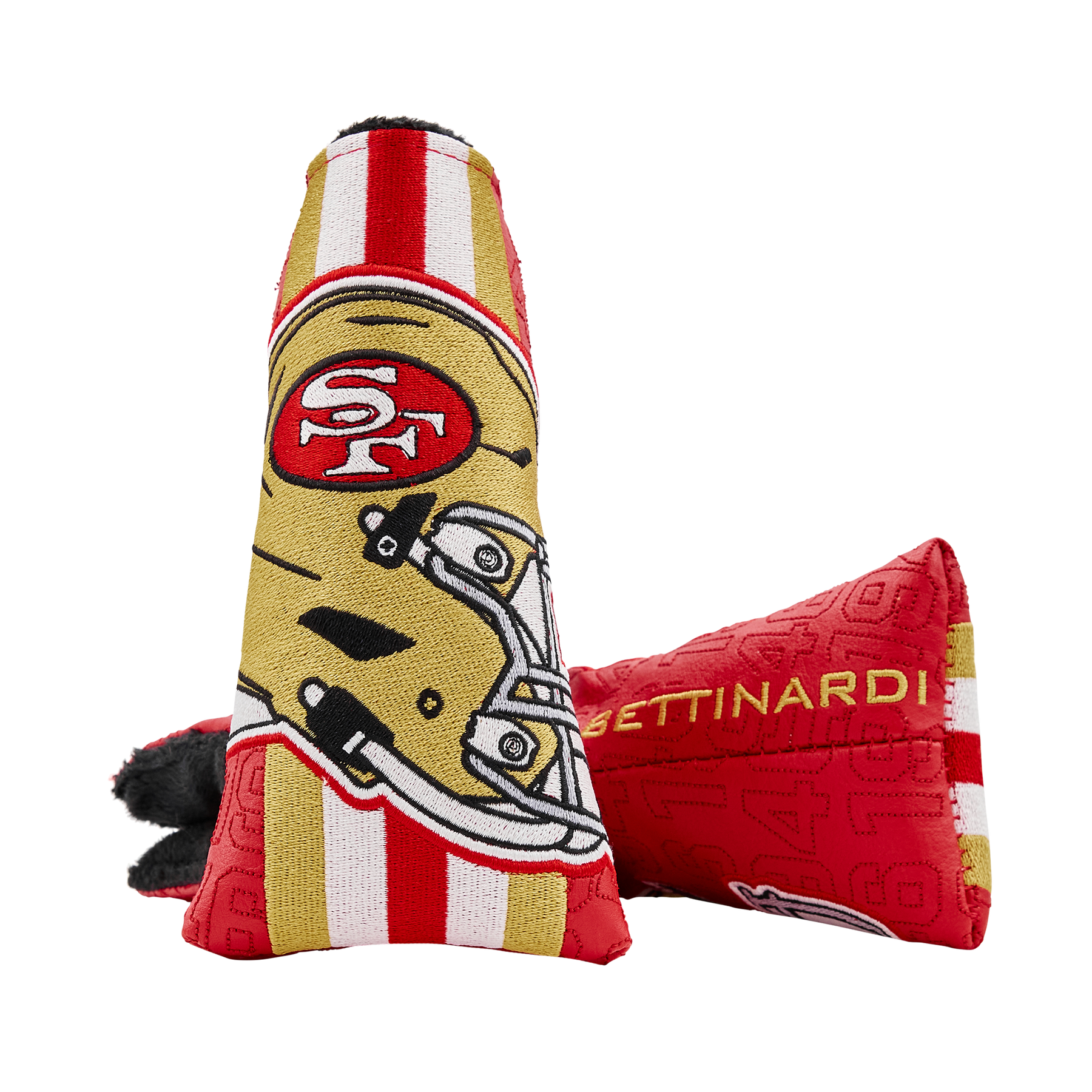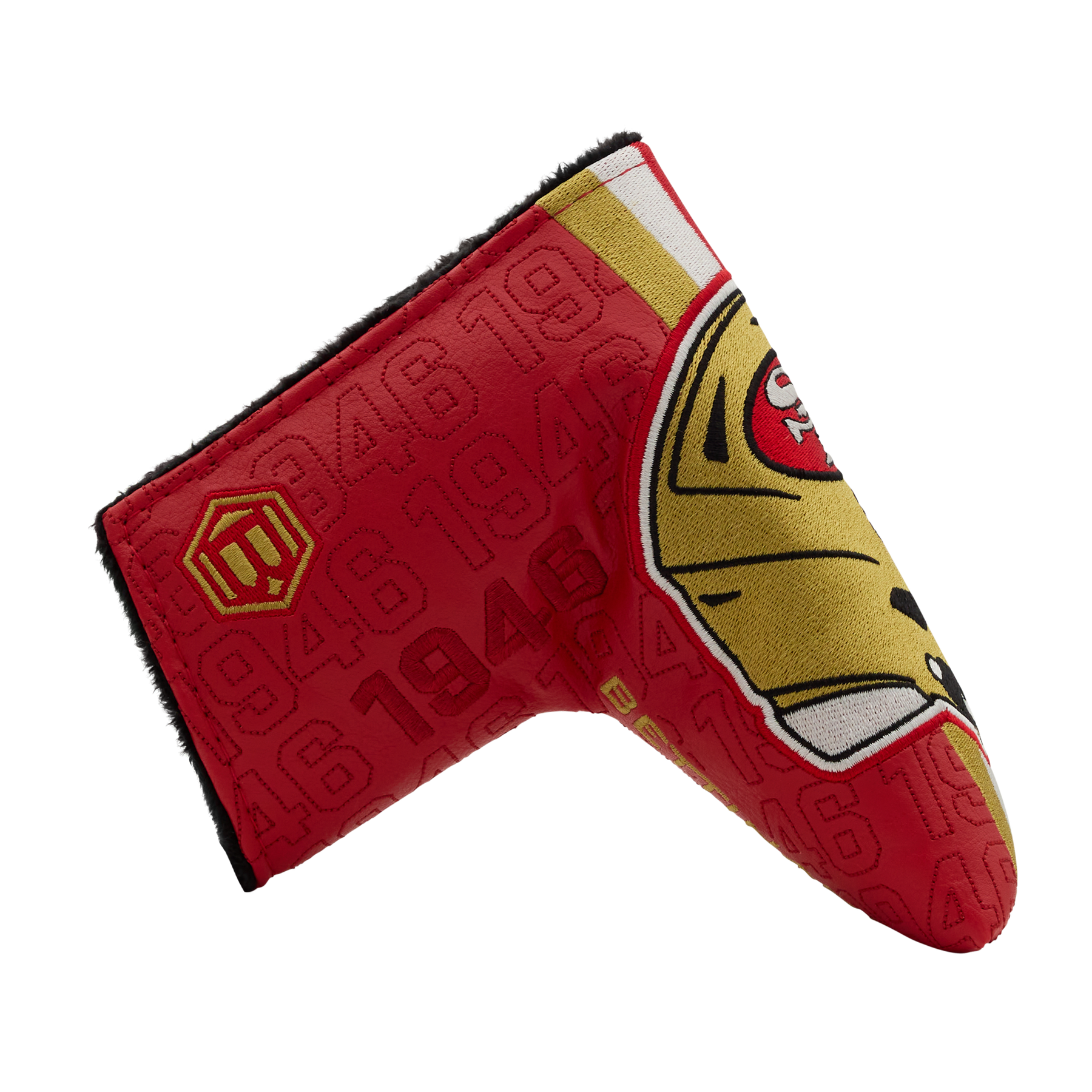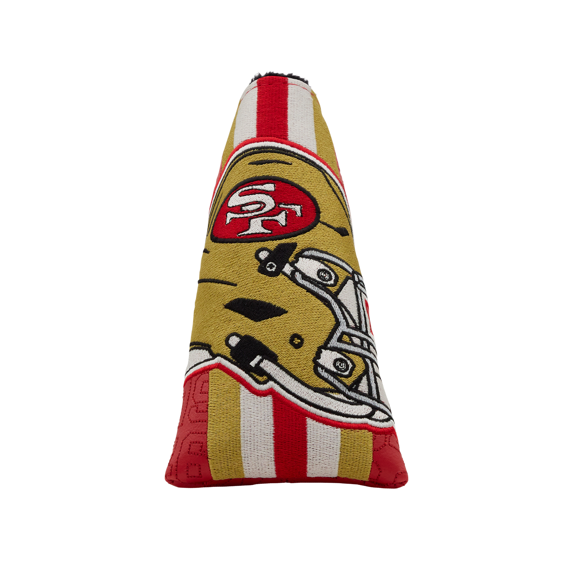 Our throwback San Francisco 49ers blade headcover showcases the classic helmet on the front with "49ers" on the side and a Hex B on the opposite side, with gold and white accent wordmarks. Finished with a black plush interior and a magnetic closure, this blade putter headcover protects your putter while showcasing your San Francisco 49ers pride on every green. Limited quantities available.