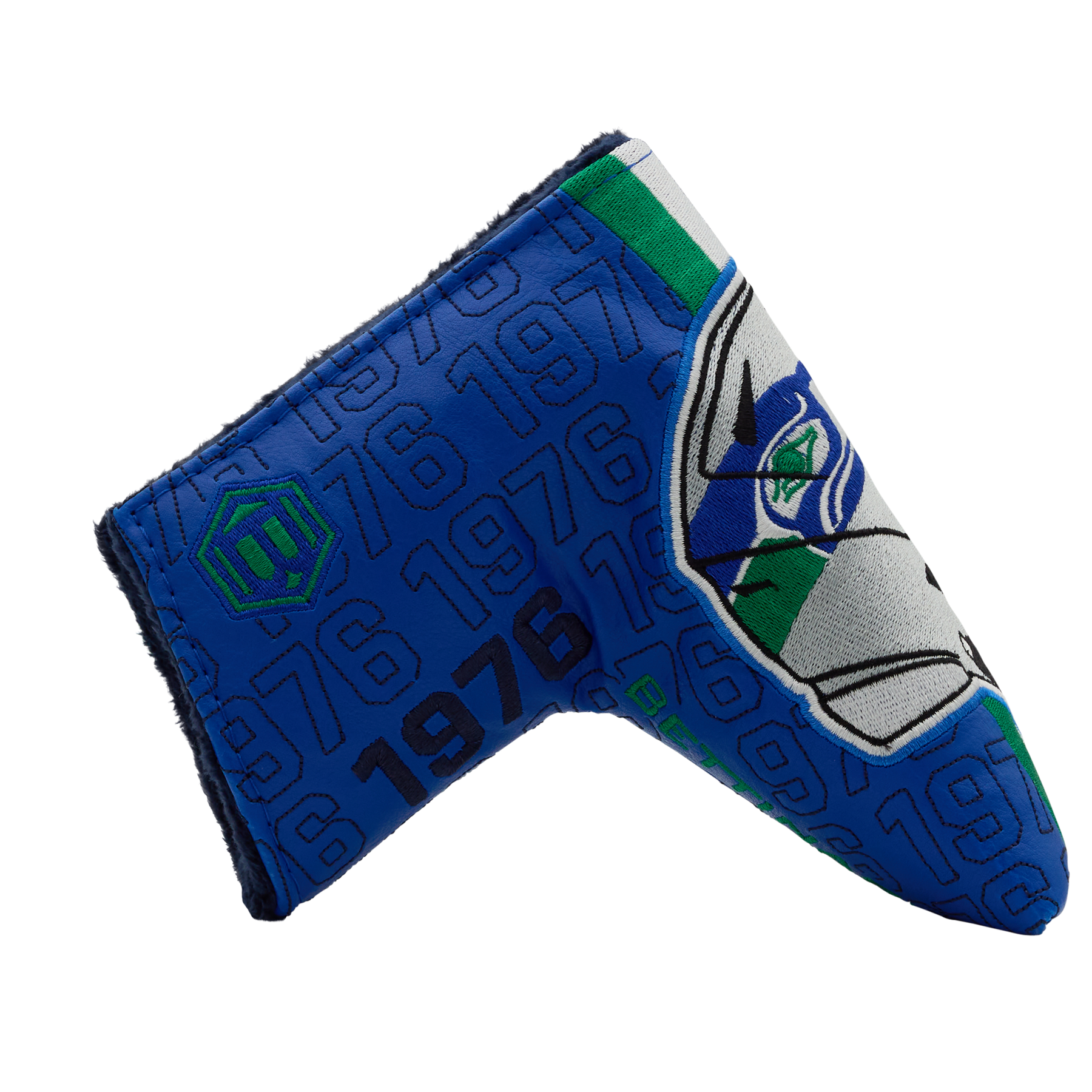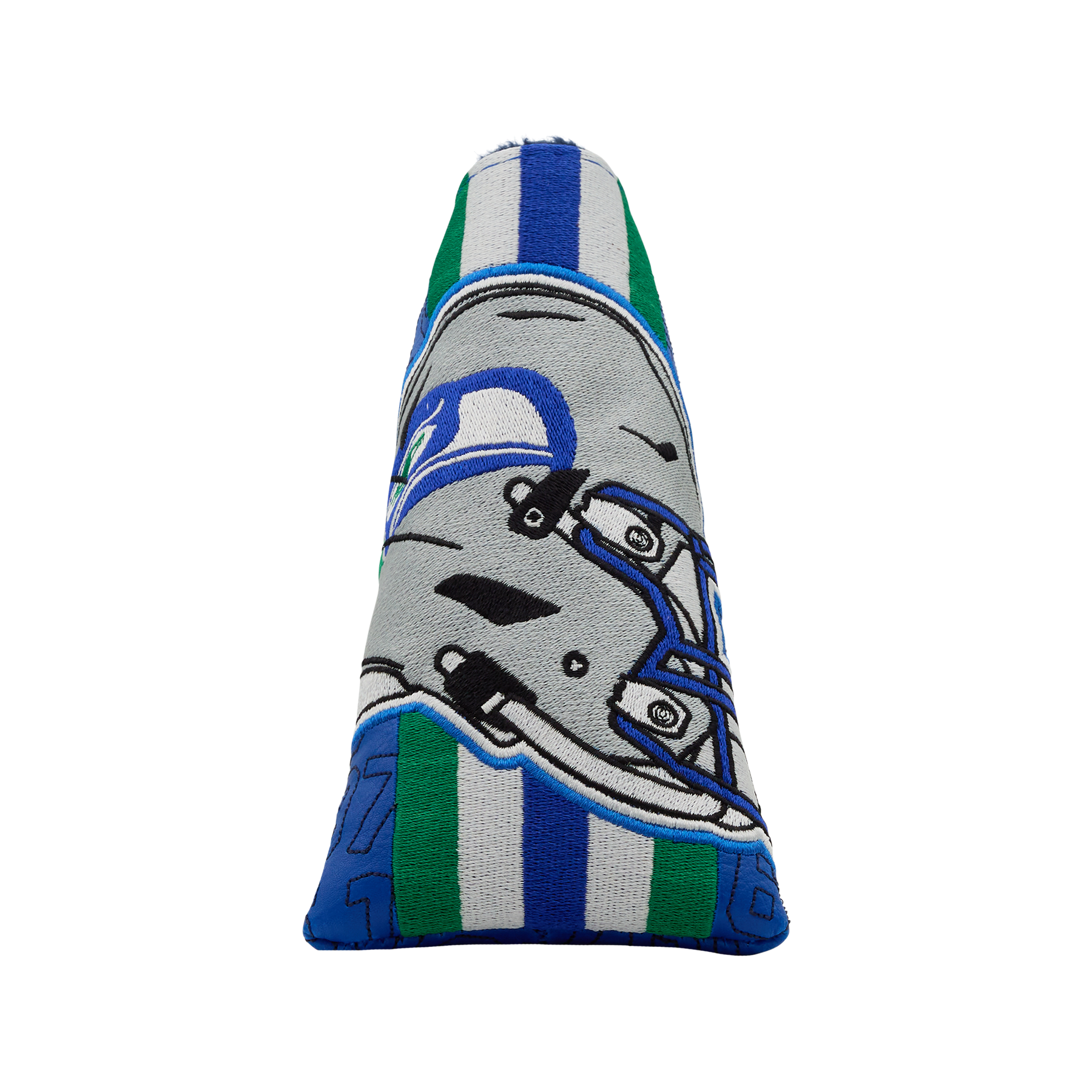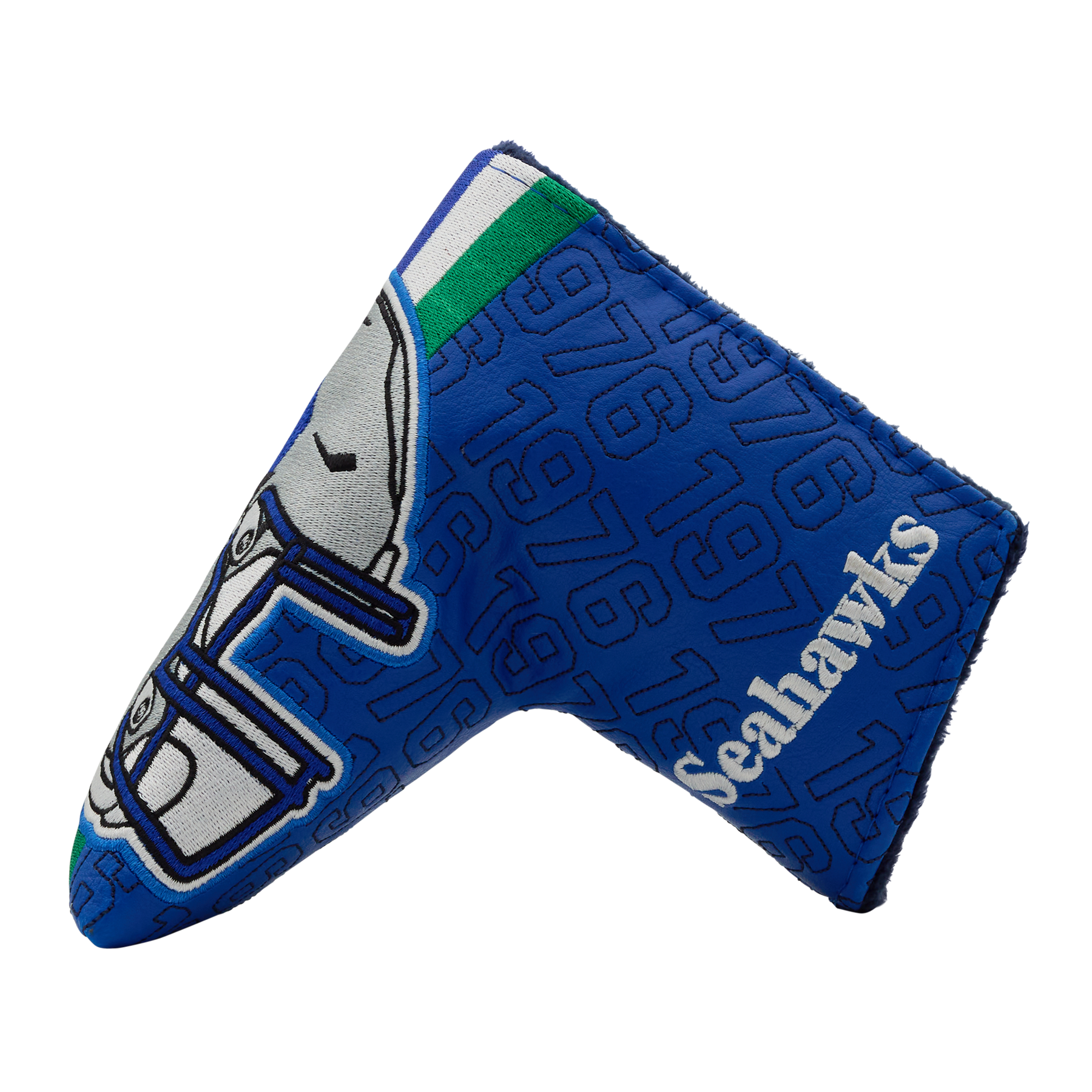 Our throwback Seattle Seahawks blade headcover showcases the classic helmet on the front with "Seahawks" on the side and a Hex B on the opposite side, with green and white accent wordmarks. Finished with a navy plush interior and a magnetic closure, this blade putter headcover protects your putter while showcasing your Seattle Seahawks pride on every green. Limited quantities available.