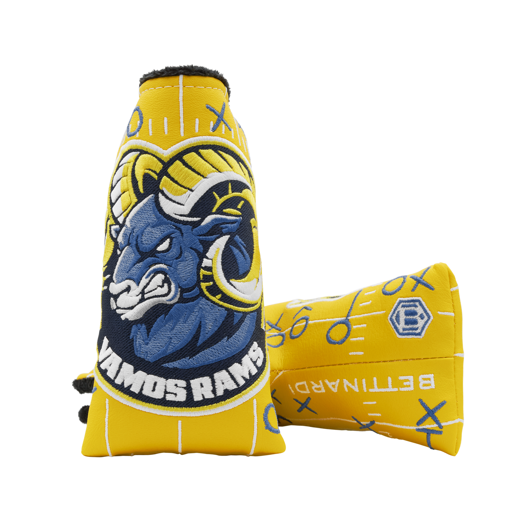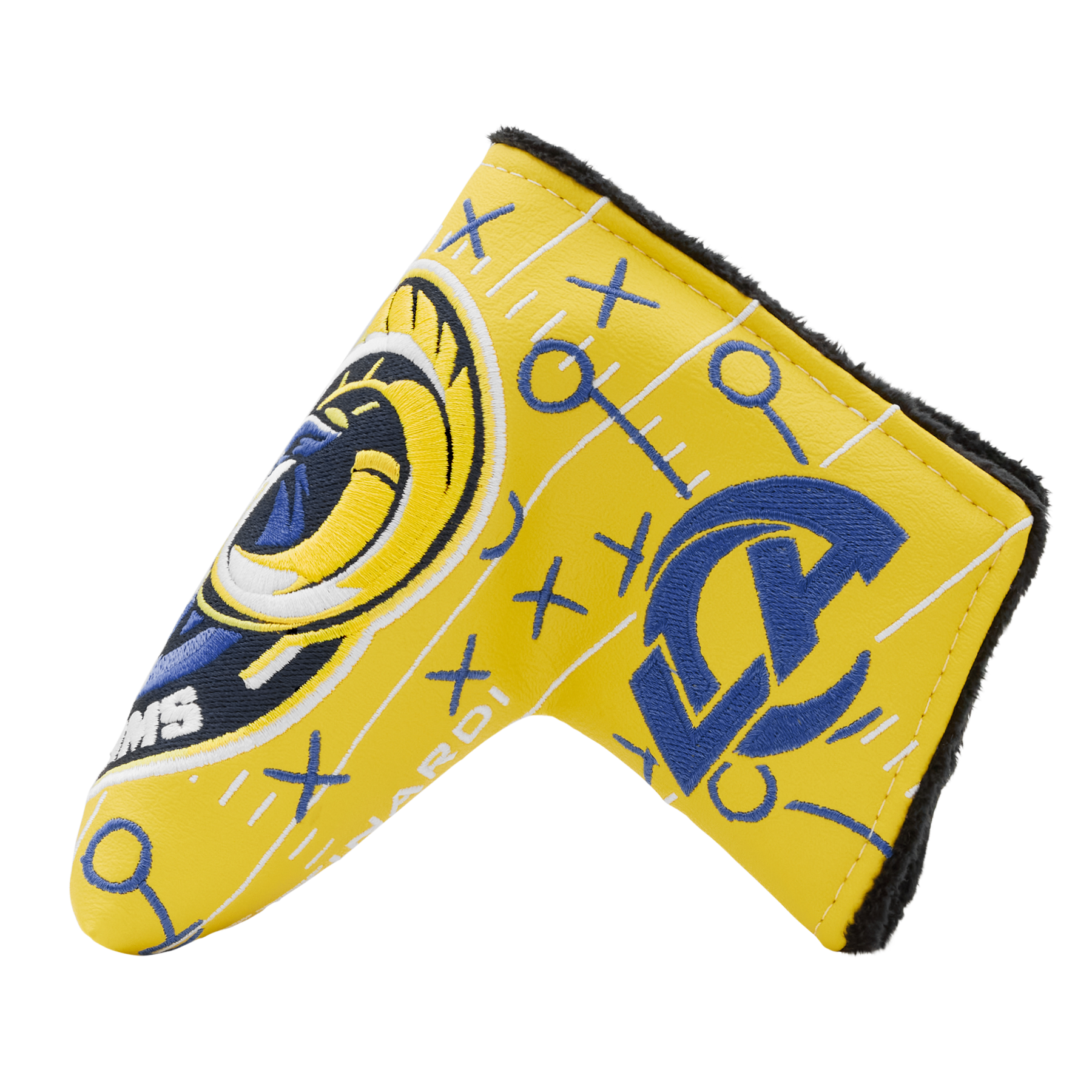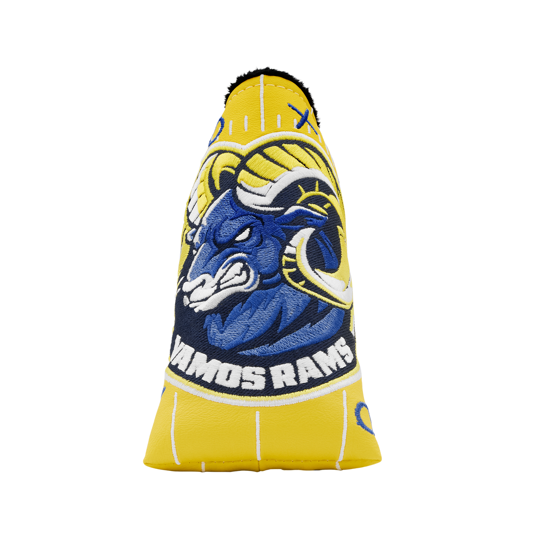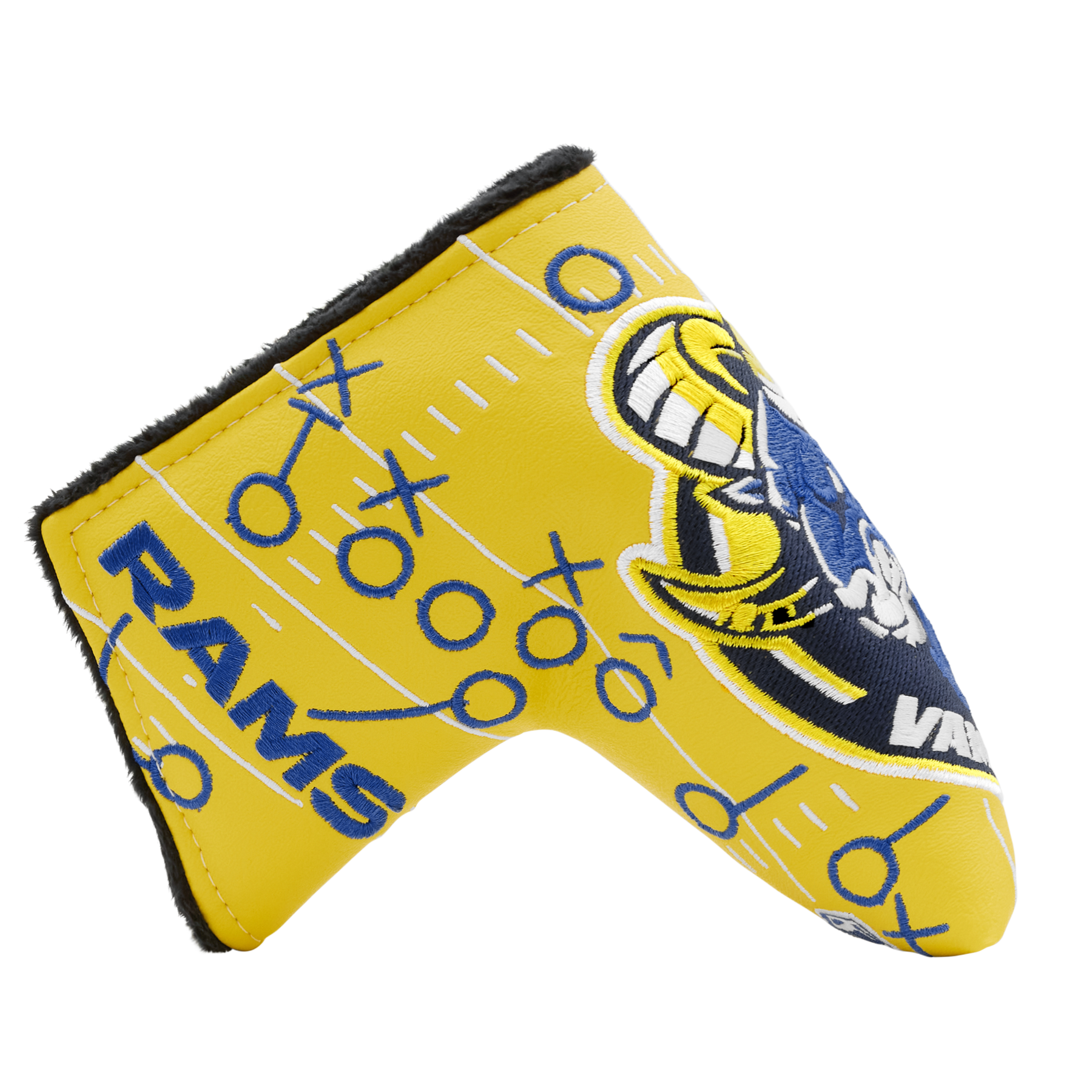 Our X's and O's Vamos Rams Blade Putter Headcover showcases a charging ram on the front with a Rams wordmark and Hex B on one side, an LA Rams classic wordmark on the opposite side with white wordmarks and showcasing the teams diagram plays throughout. Finished with a blue plush interior and a magnetic closure, this yellow blade putter headcover keeps your putter protected while showcasing your LA Rams pride on every green. Limited quantities available.