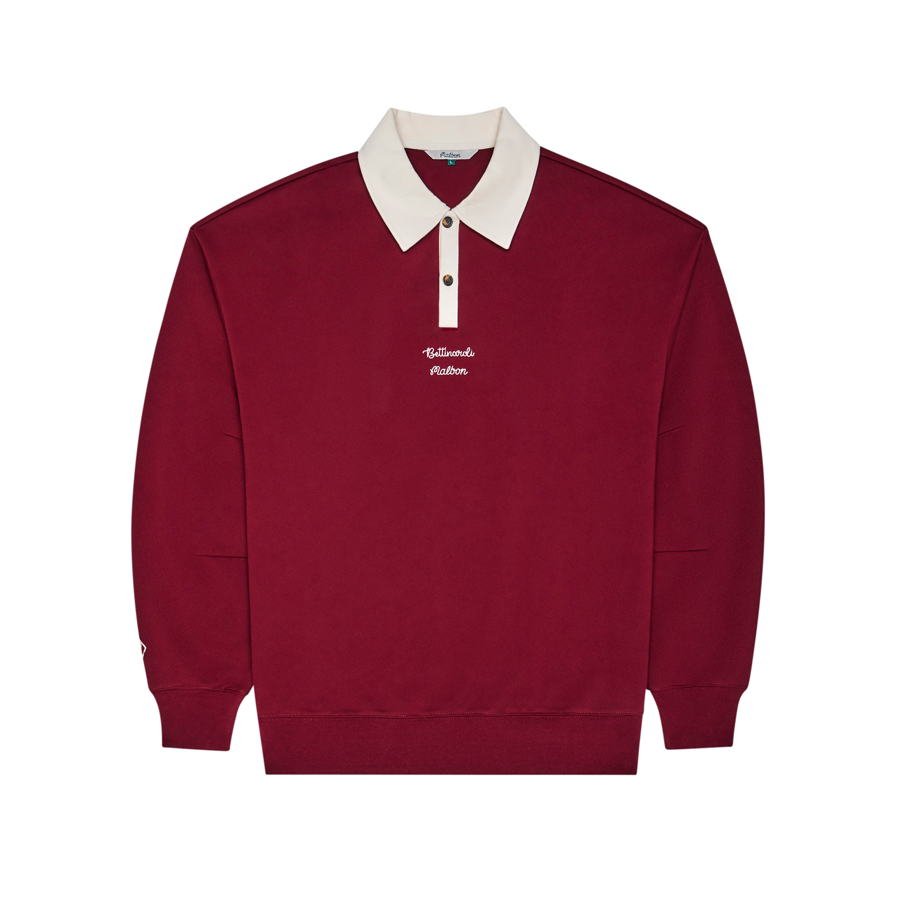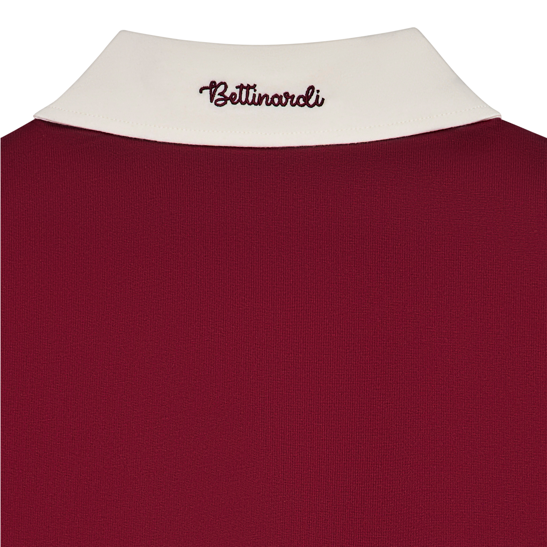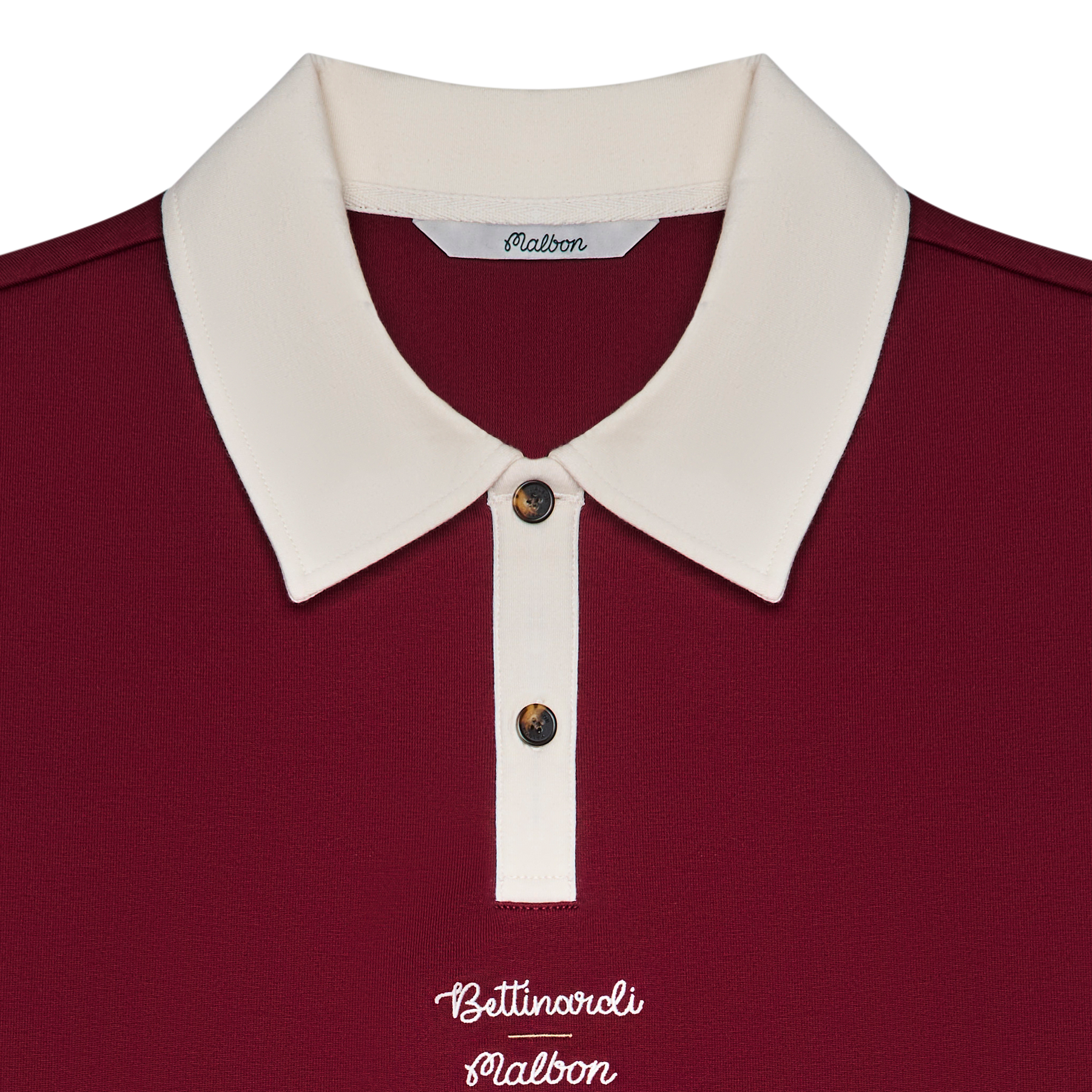 A classic staple of sportswear, the rugby polo gets an elevated update from Malbon and Bettinardi. This rich Cabernet red long-sleeve polo is finished with an ivory collar and embroidered Egret Malbon and Bettinardi marks. (100% Cotton)