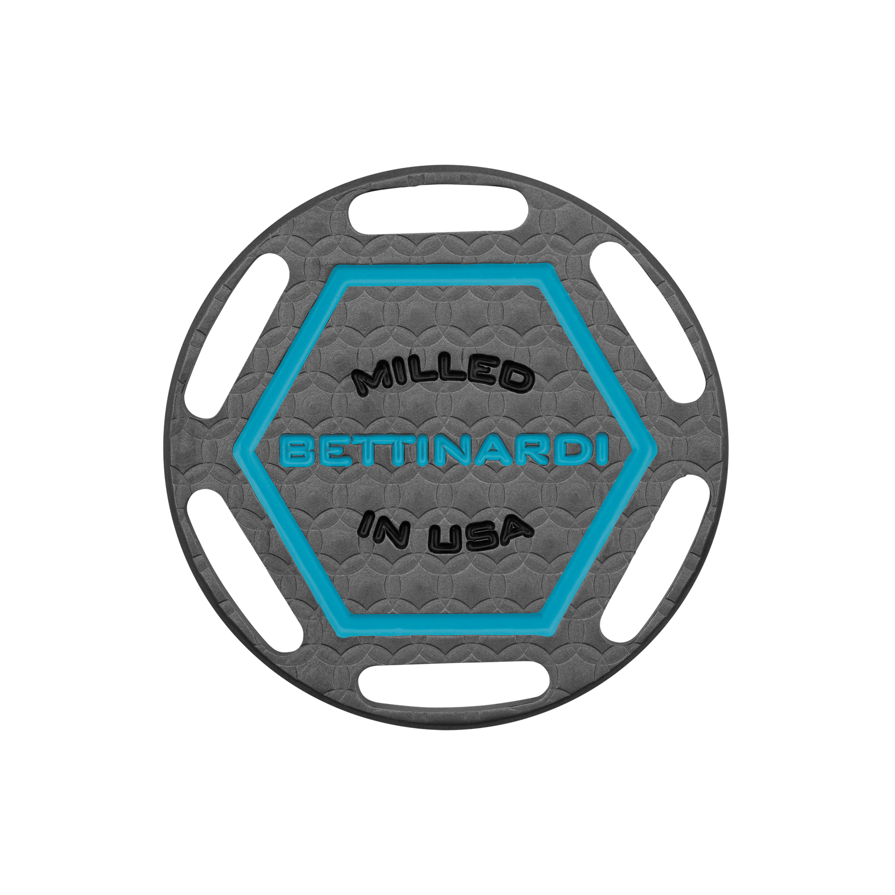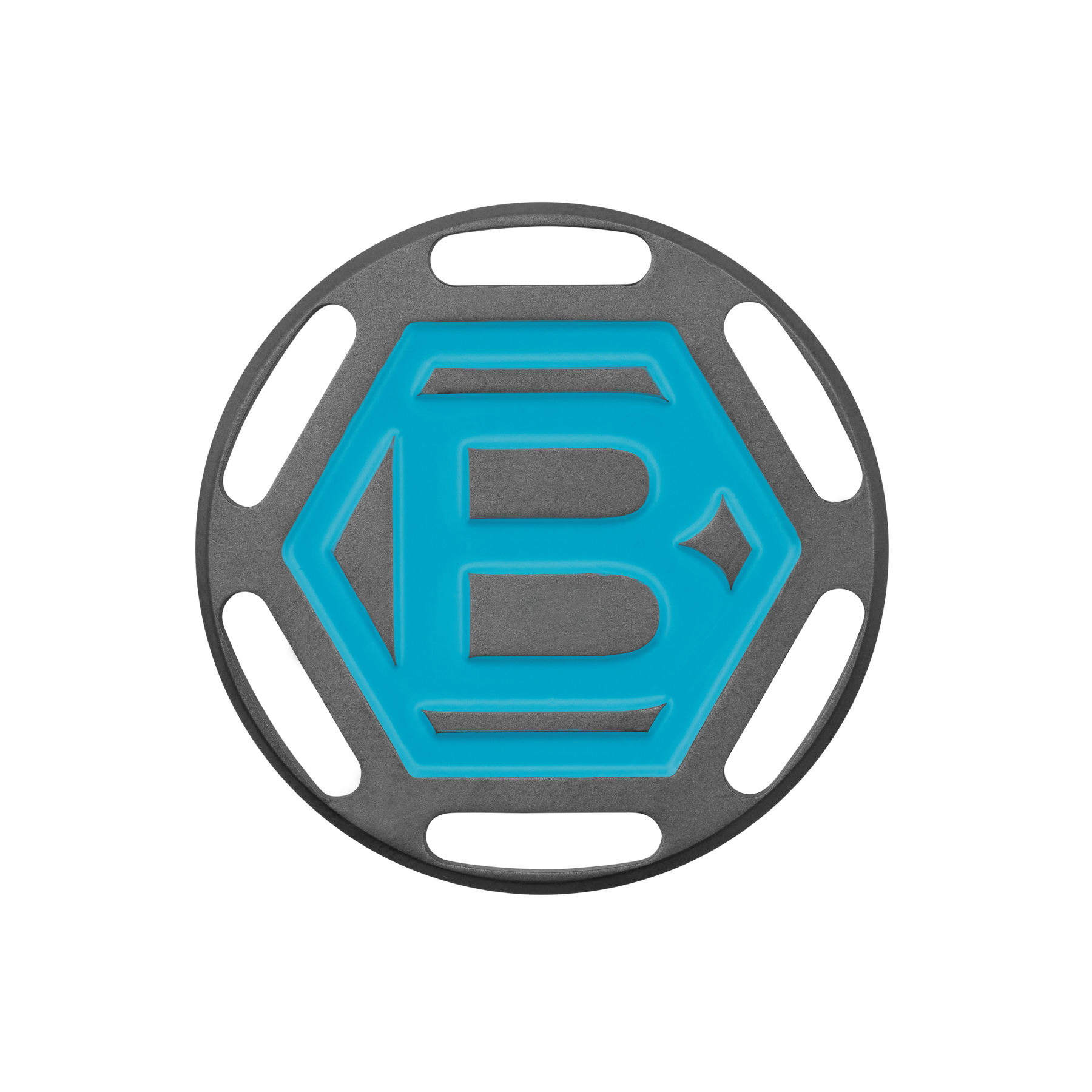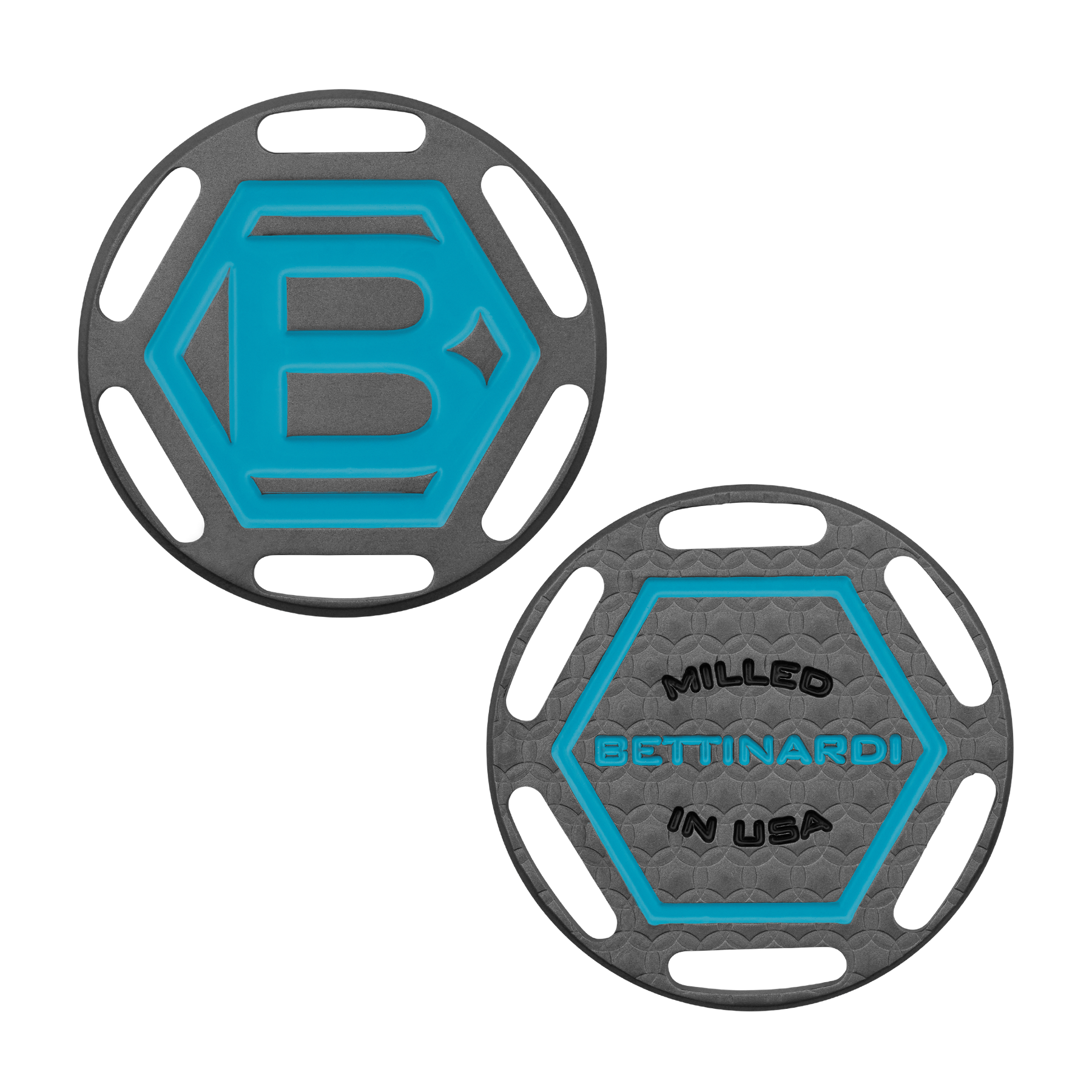 This Micro Honeycomb-milled punch out, Black Ox Hex B ball marker features a light blue Hex B on the front. Milled in the USA wordmark with light blue paintfills is showcased on the back. Limited quantities available.