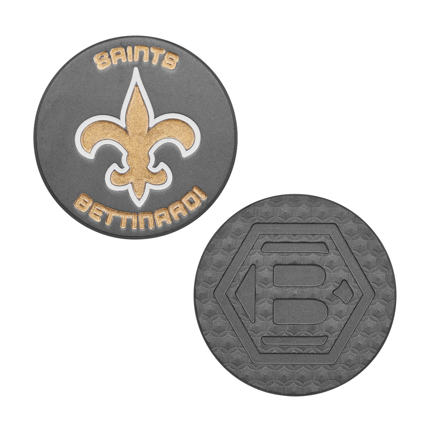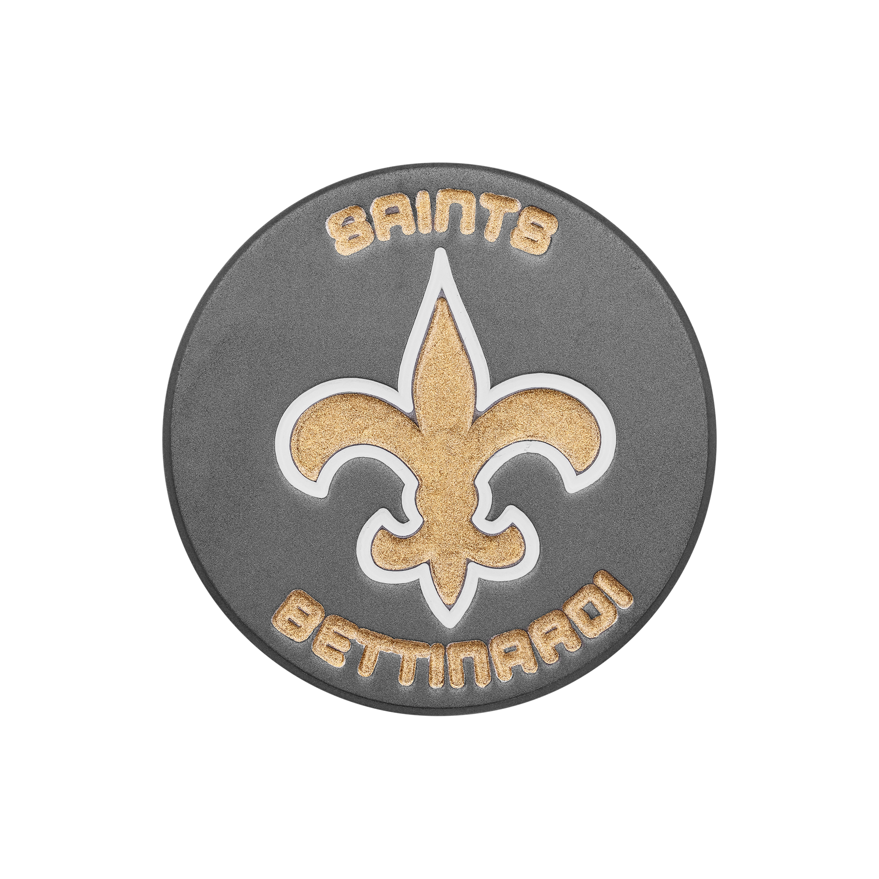 Go Saints! This Black Ox ball marker features the New Orleans Saints logo milled on the front in gold and white paint fills, with a Hex B milled on the backside over Micro Honeycomb™. Limited quantities are available.