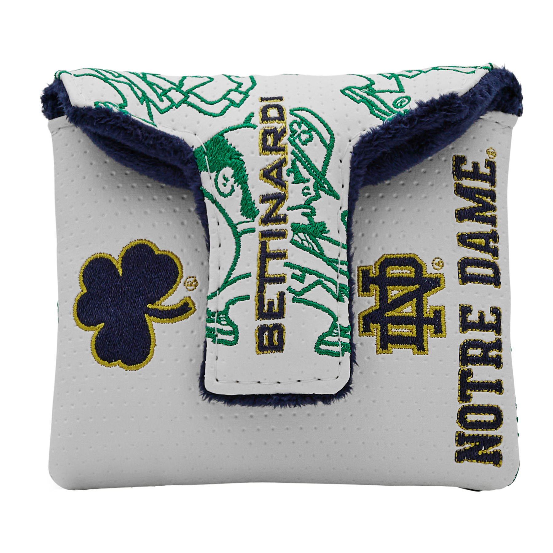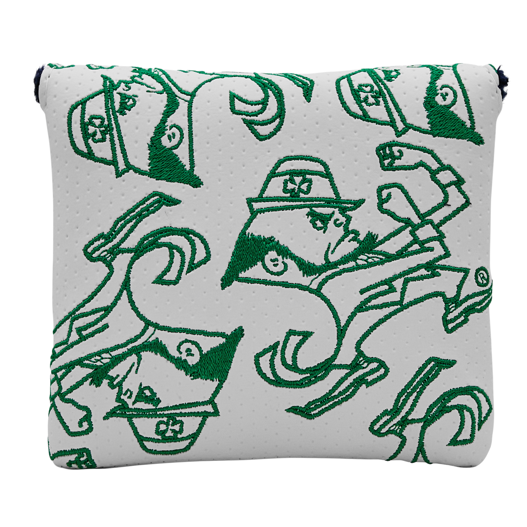 Show your Notre Dame pride with the Dancing Leprechauns Mallet Putter Headcover. Designed on a white base, this headcover features an all-over pattern of the iconic Notre Dame Leprechaun. Finished with a navy interior and secured with a magnetic closure. Limited quantities available.
