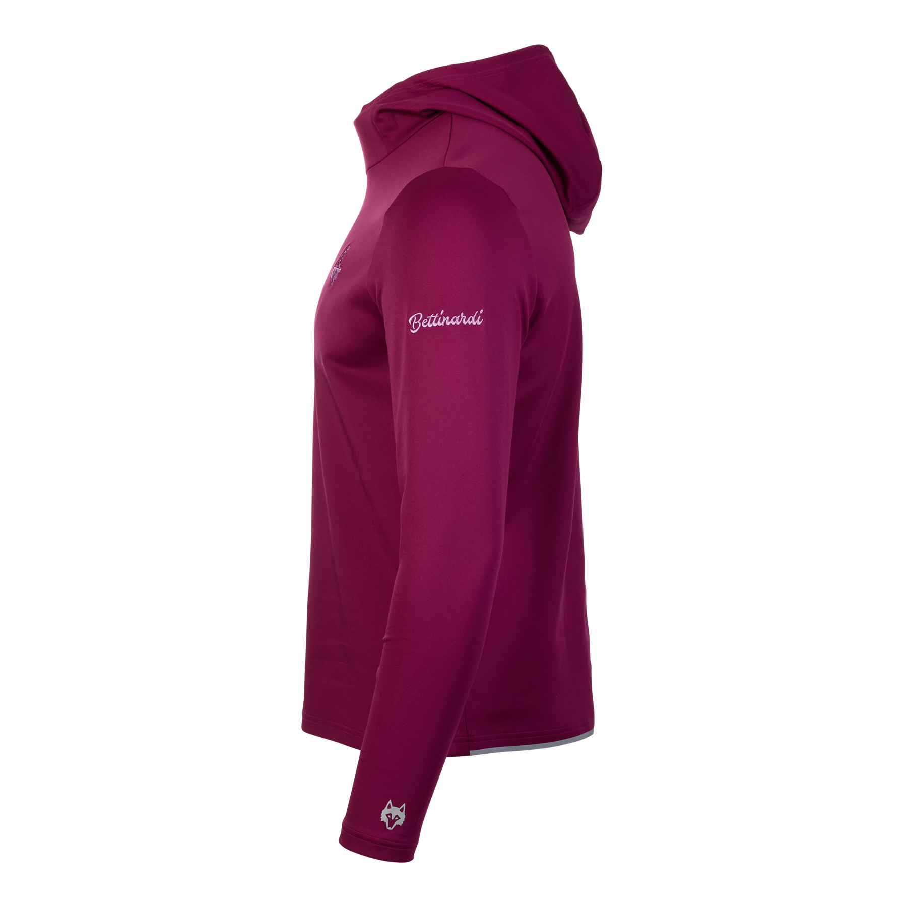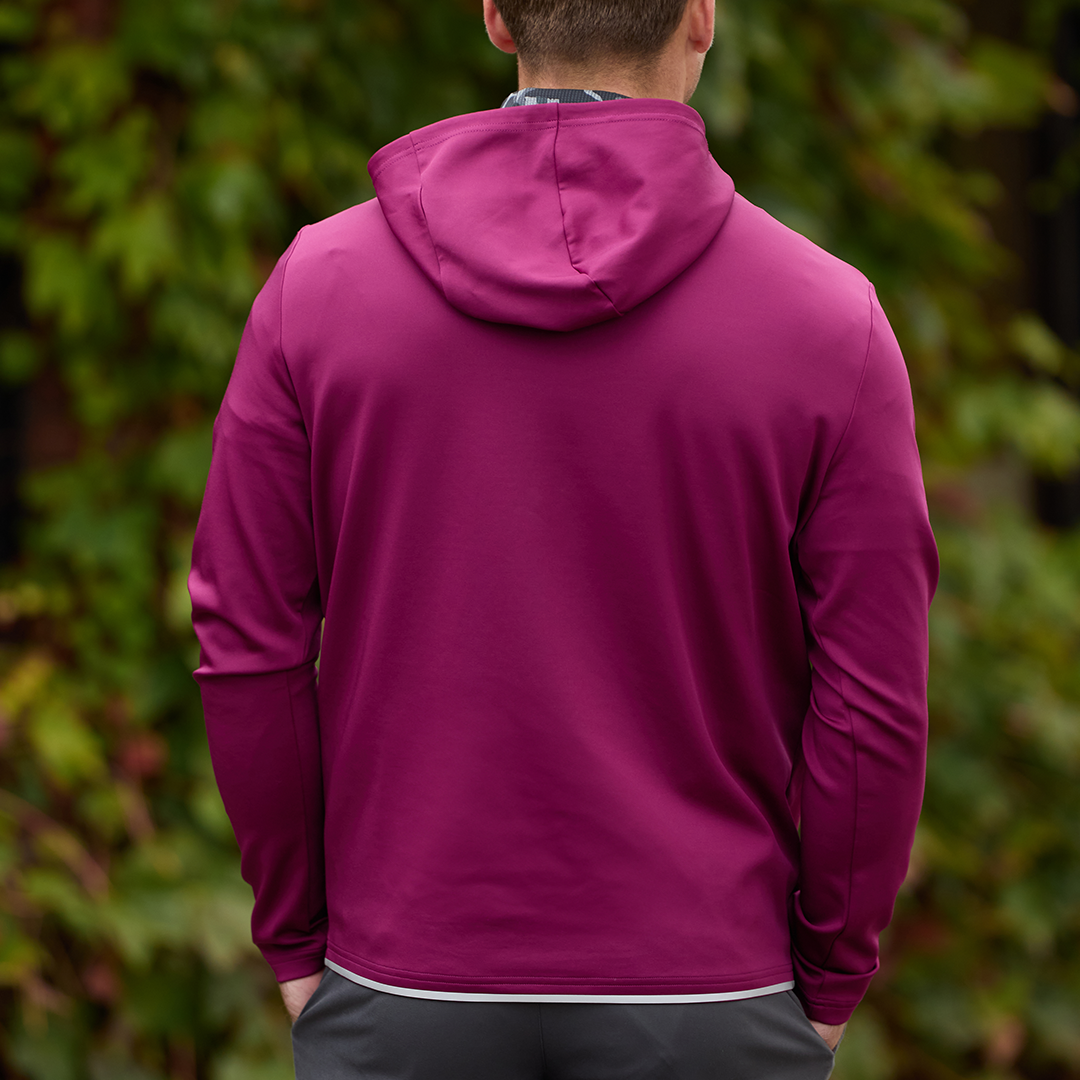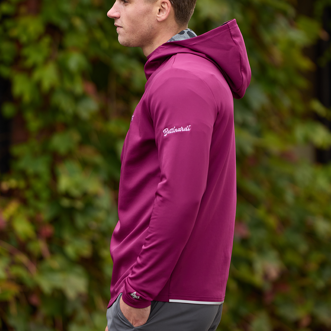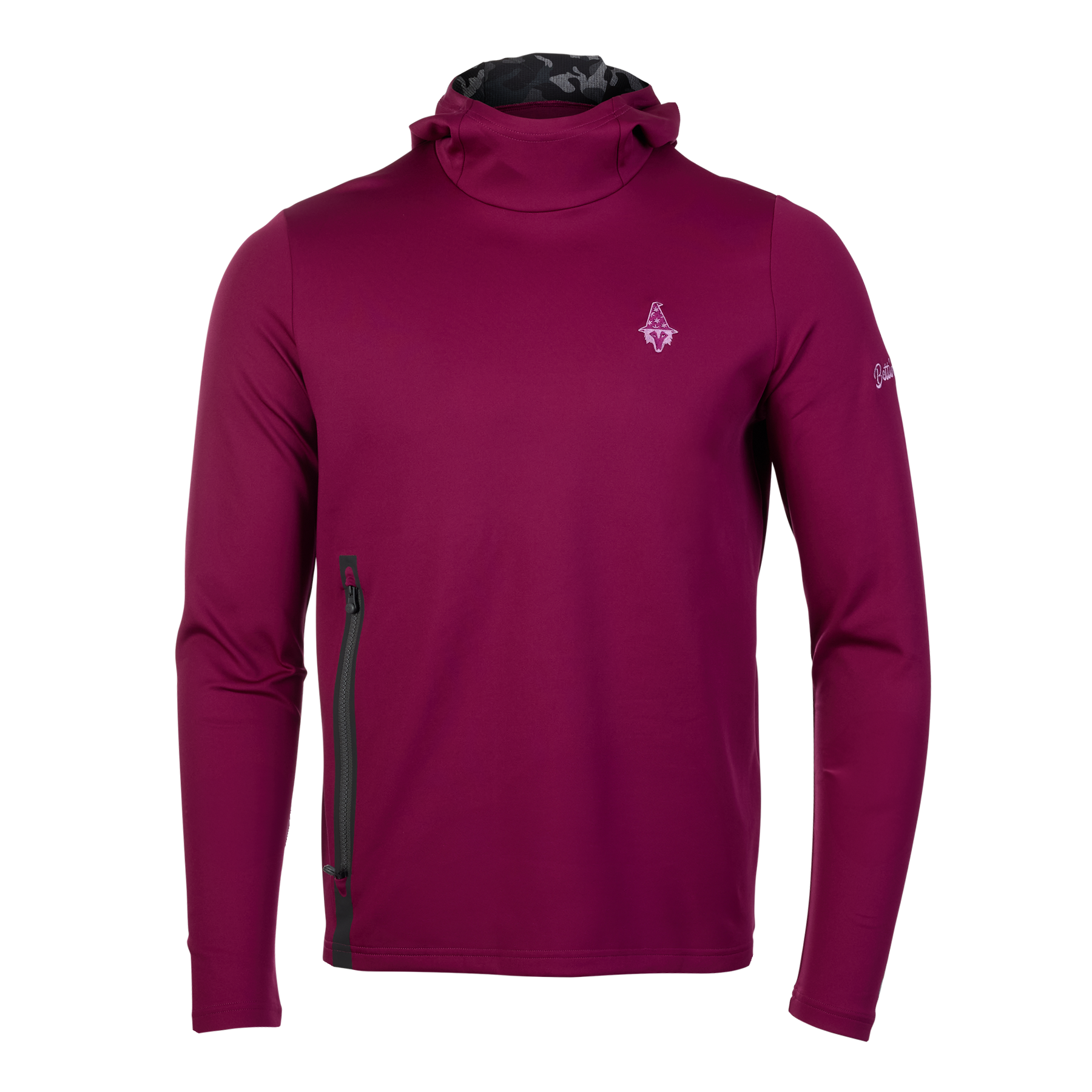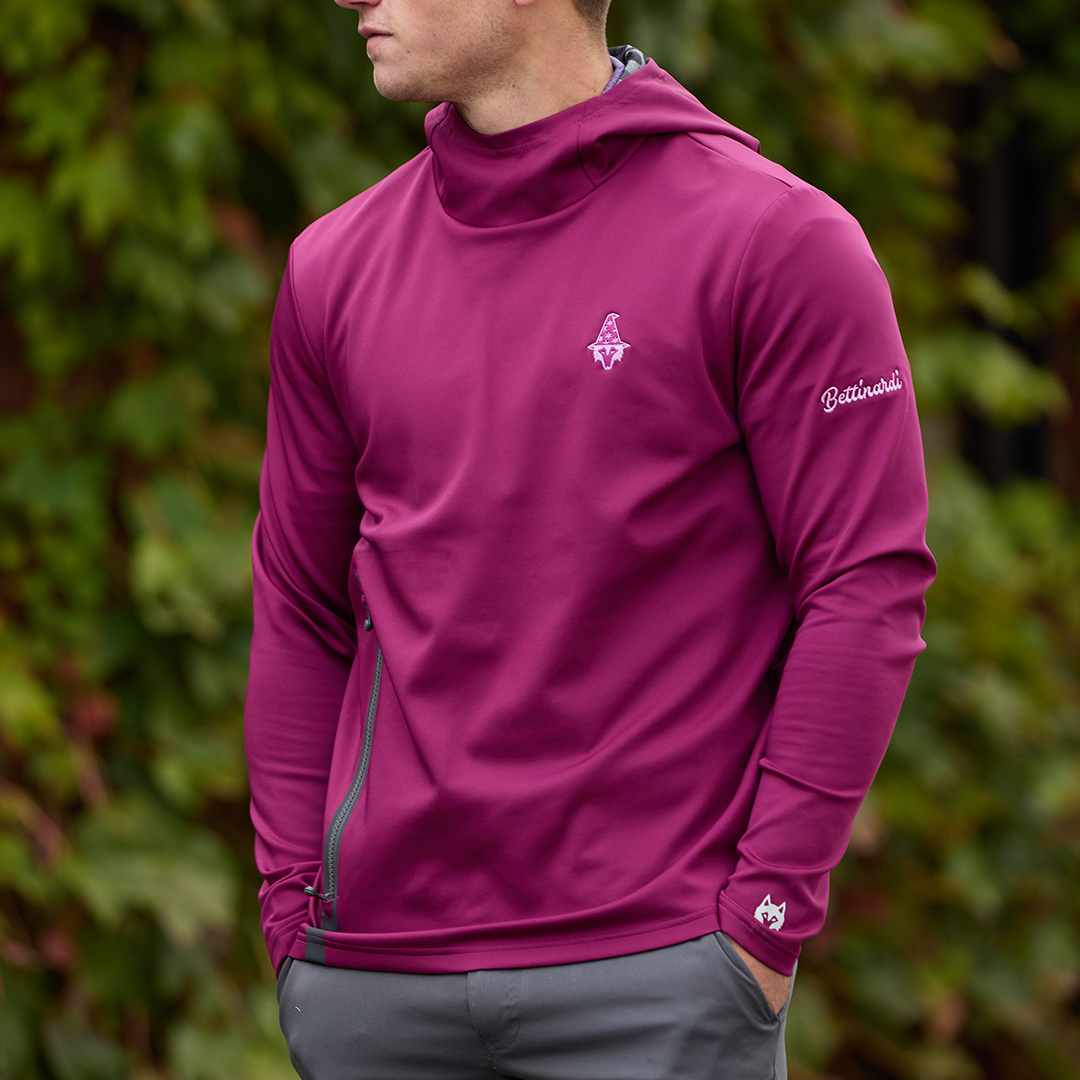 The Wolf Wizard Cokato Hoodie is constructed from a technical blend of nylon and elastane offering antimicrobial and quick-dry properties. Our Wolf Wizard is featured on the left chest while the left sleeve features Bettinardi. Decorated with a perforated camo interior neck, blind seams, and an elongated utility pocket on the front right side of the garment. The brushback knit fabric is breathable and lightweight and provides a luxe feel and plenty of stretch for full mobility. The hood is built as a funnel neck for warmth and style. (45% Nylon, 40% Cotton, 15% Elastane)