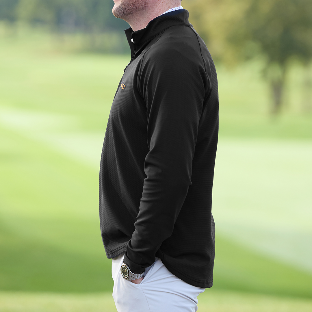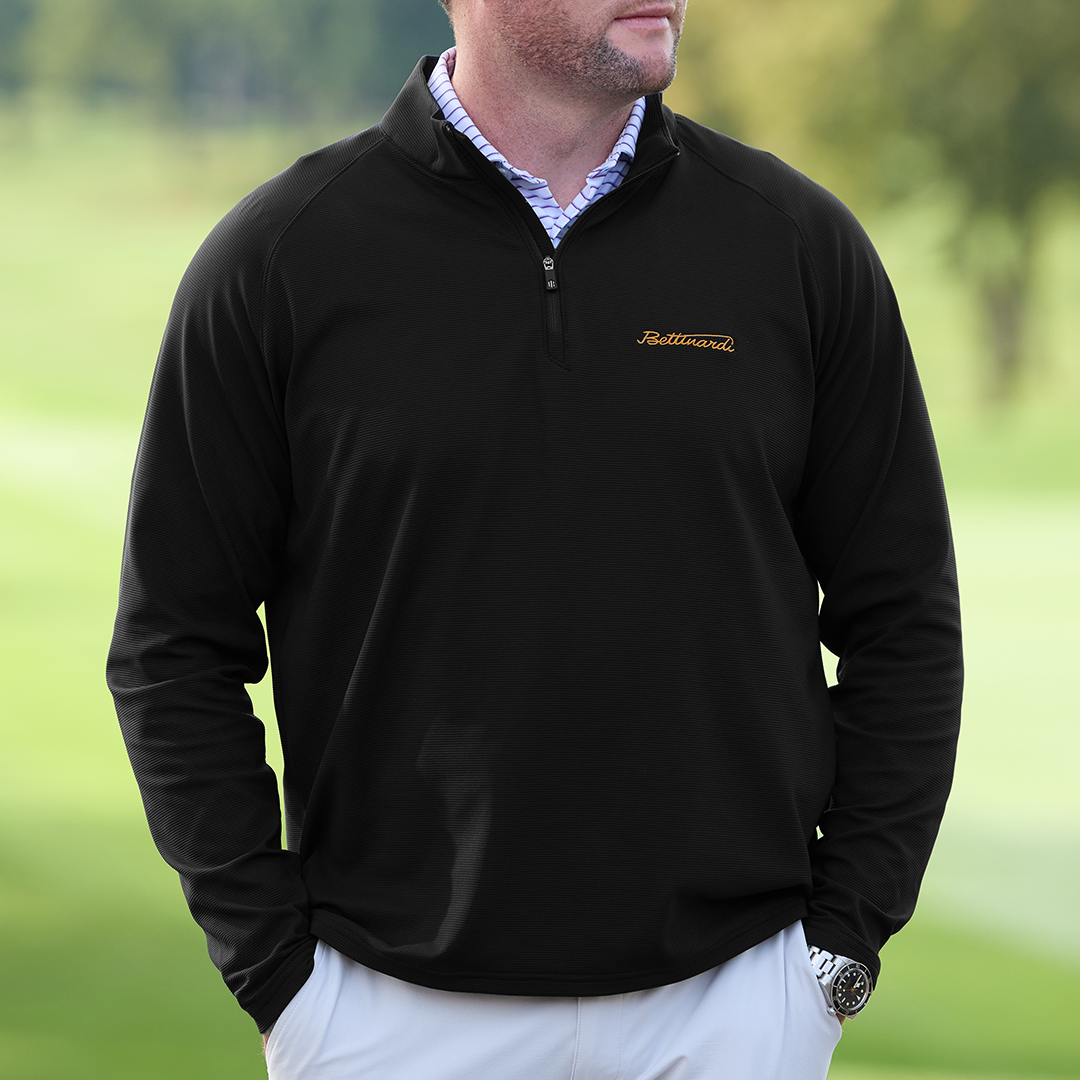 The Retro Bettinardi Stuart pullover, sewn from a luxurious performance blend that’s treated for superior softness on the interior, features the retro Bettinardi on the left chest, UPF 50+ sun protection, moisture wicking, and 4-way stretch. Shrug off the chill of early-morning tee times in this lightweight performance quarter zip with a subtle ribbed texture. (80% Polyester, 20% Elastane)