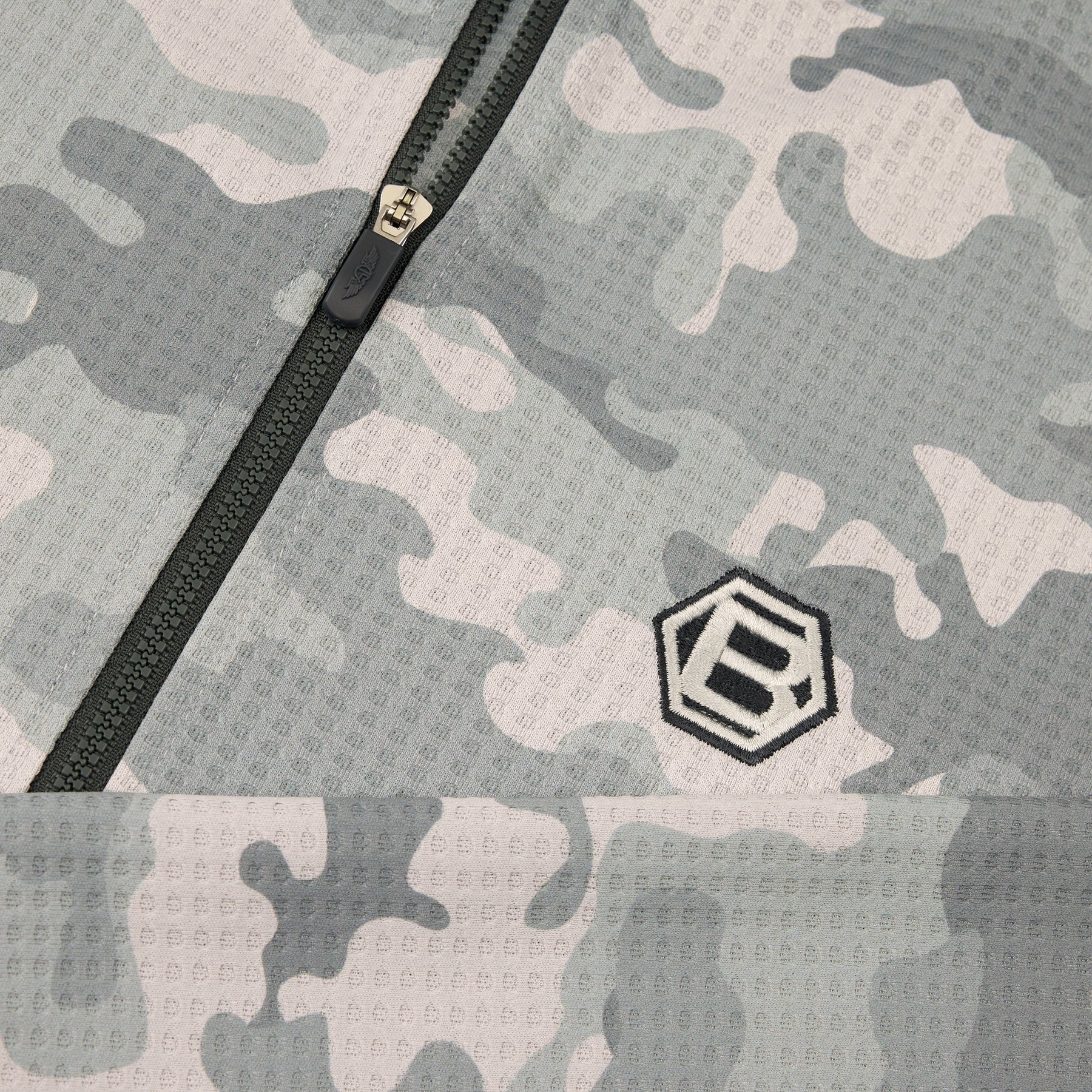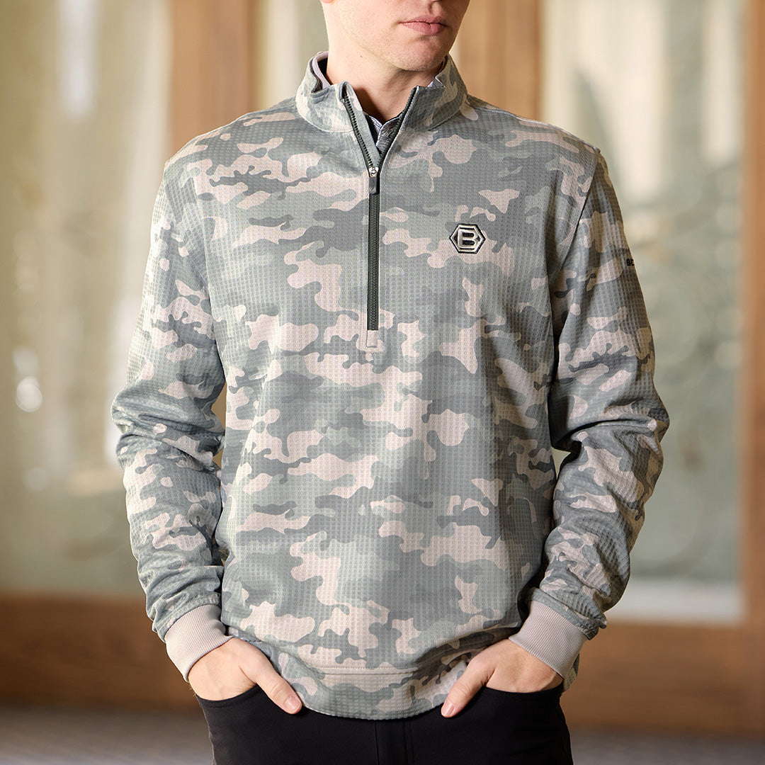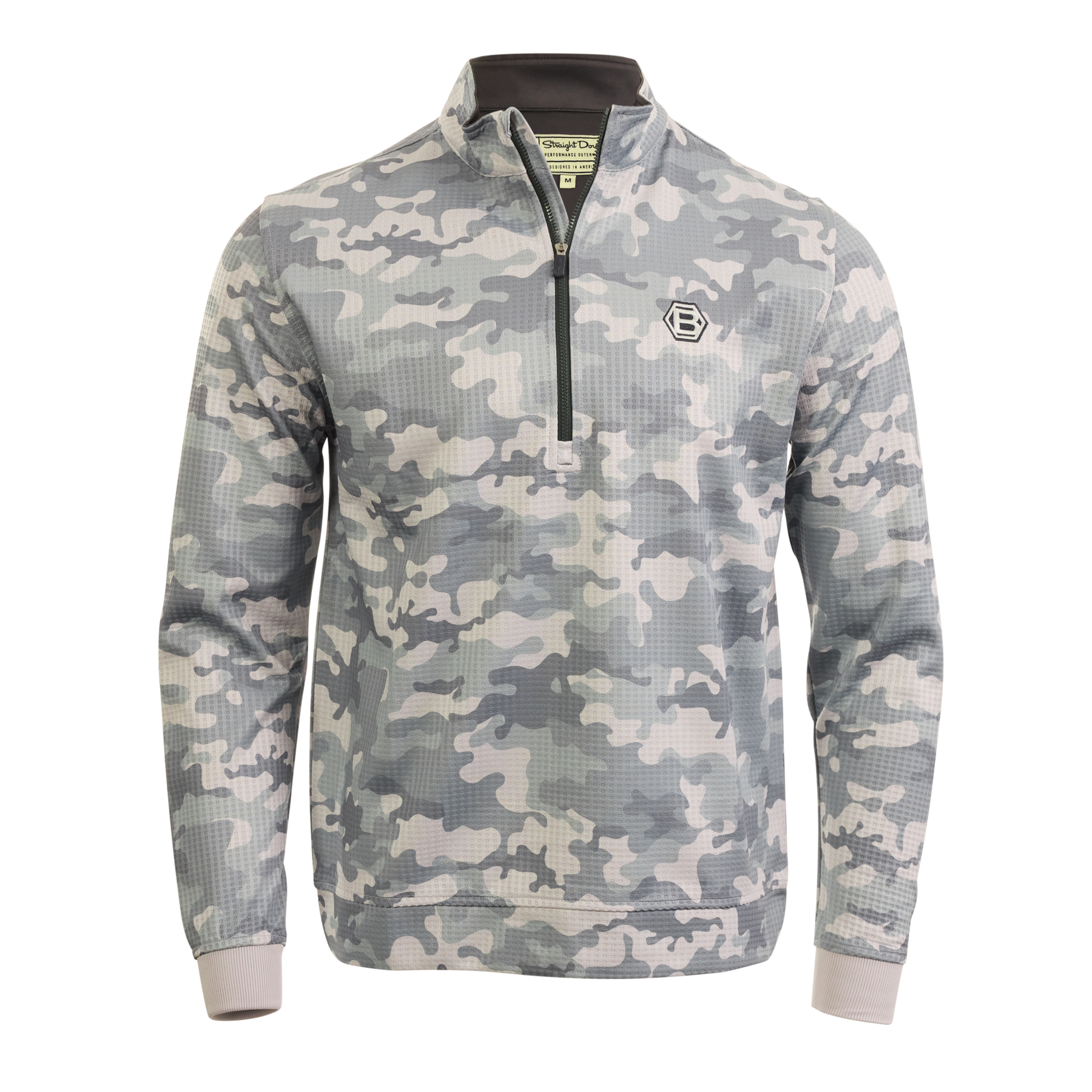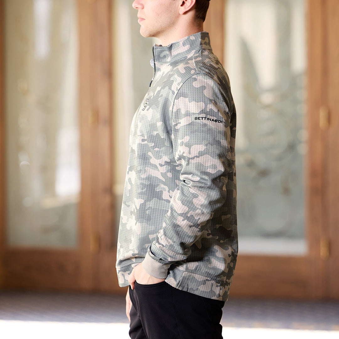 The Garrison Quarter Zip features our classic Hex B embroidered onto the left chest, and a Bettinardi wordmark on the left sleeve. It's crafted by our friends at Straight Down from performance waffle knit in a subtle gray camo print that adds a modern edge to a classic layer. This midweight pullover features an 11" zipper, banded hem, and sleeve cuffs for a clean fit. Comfortable and versatile, it’s a go-to piece for cool mornings on the course or relaxed days off. (100% micro polyester, waffle knit)